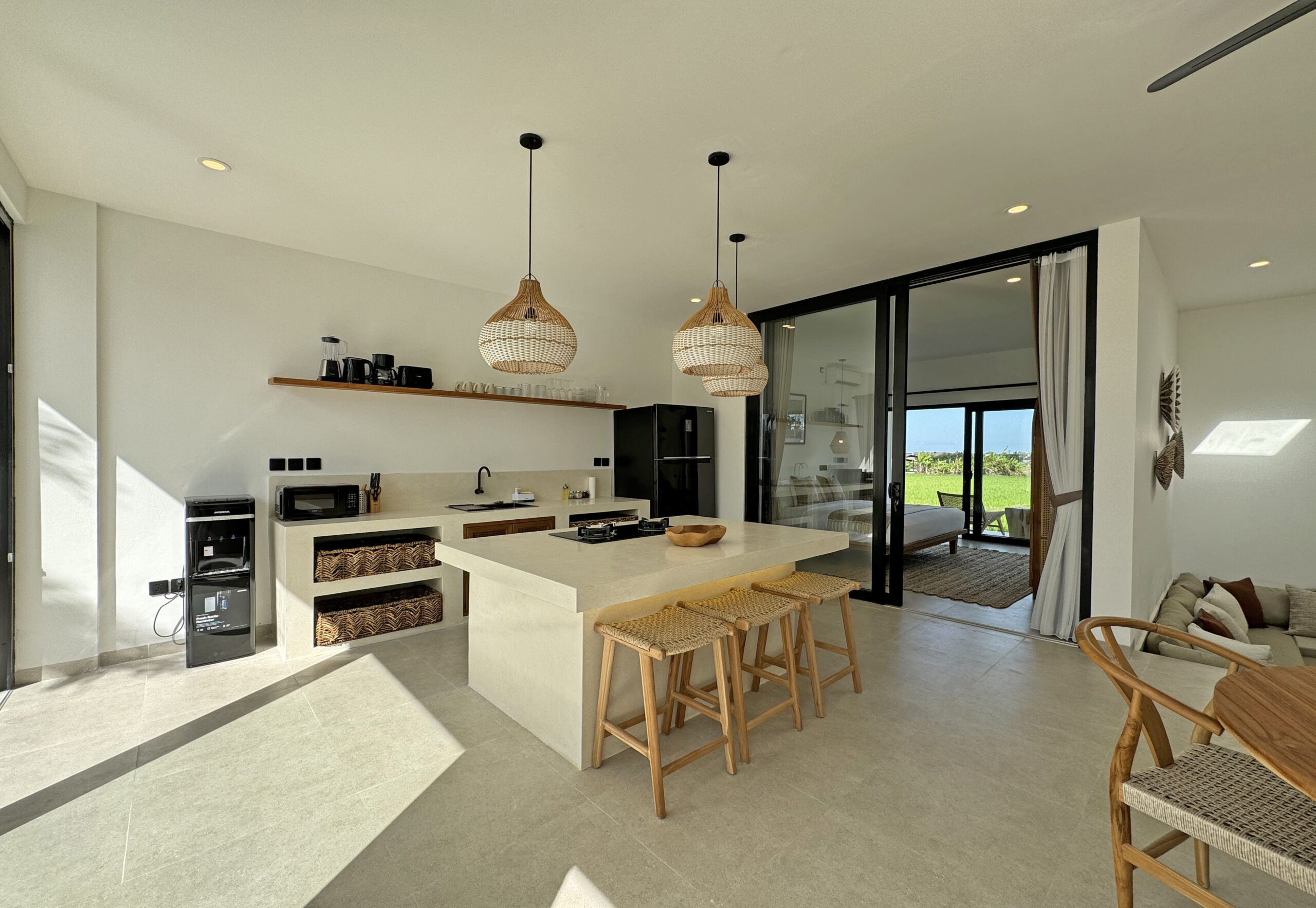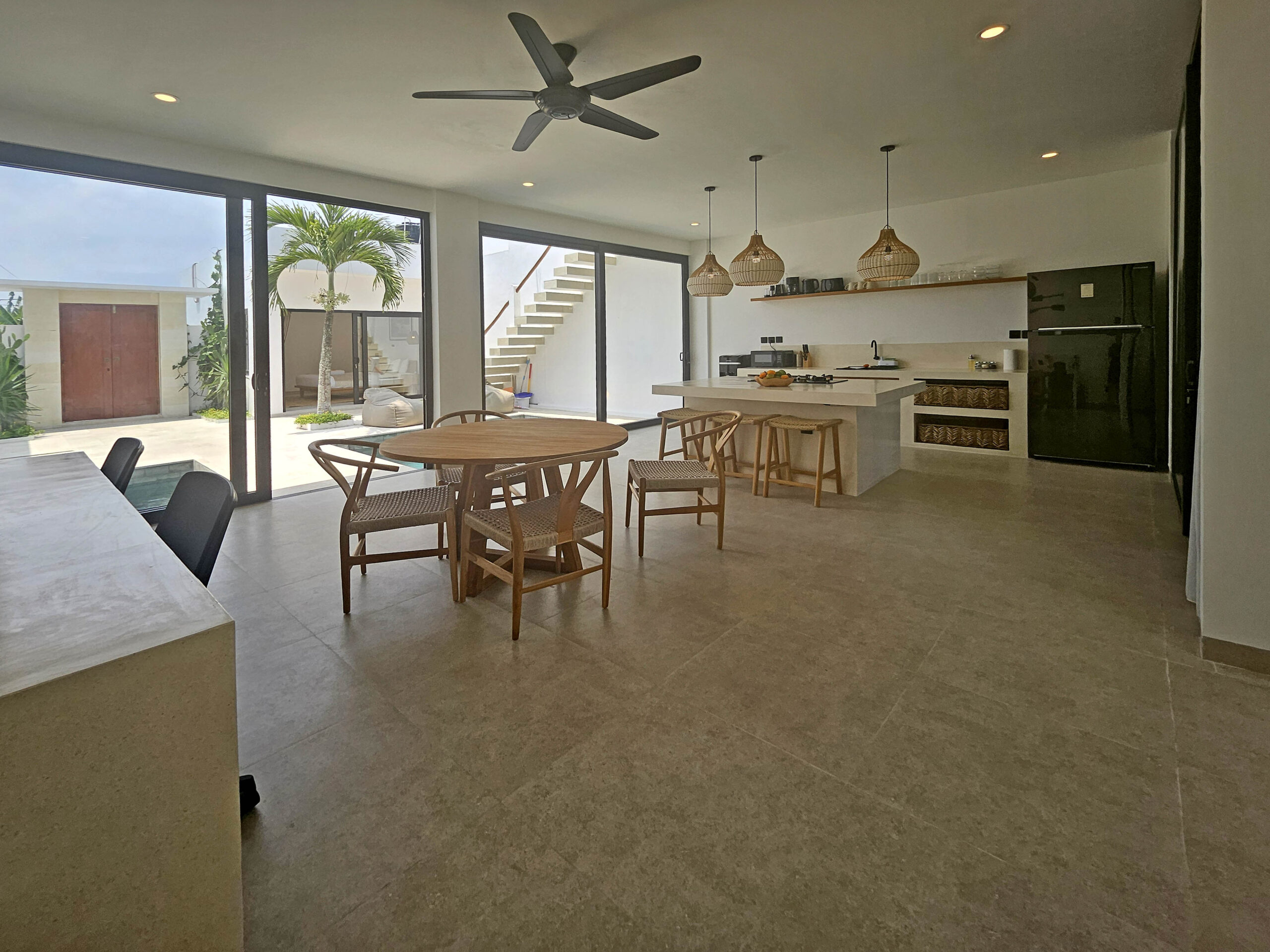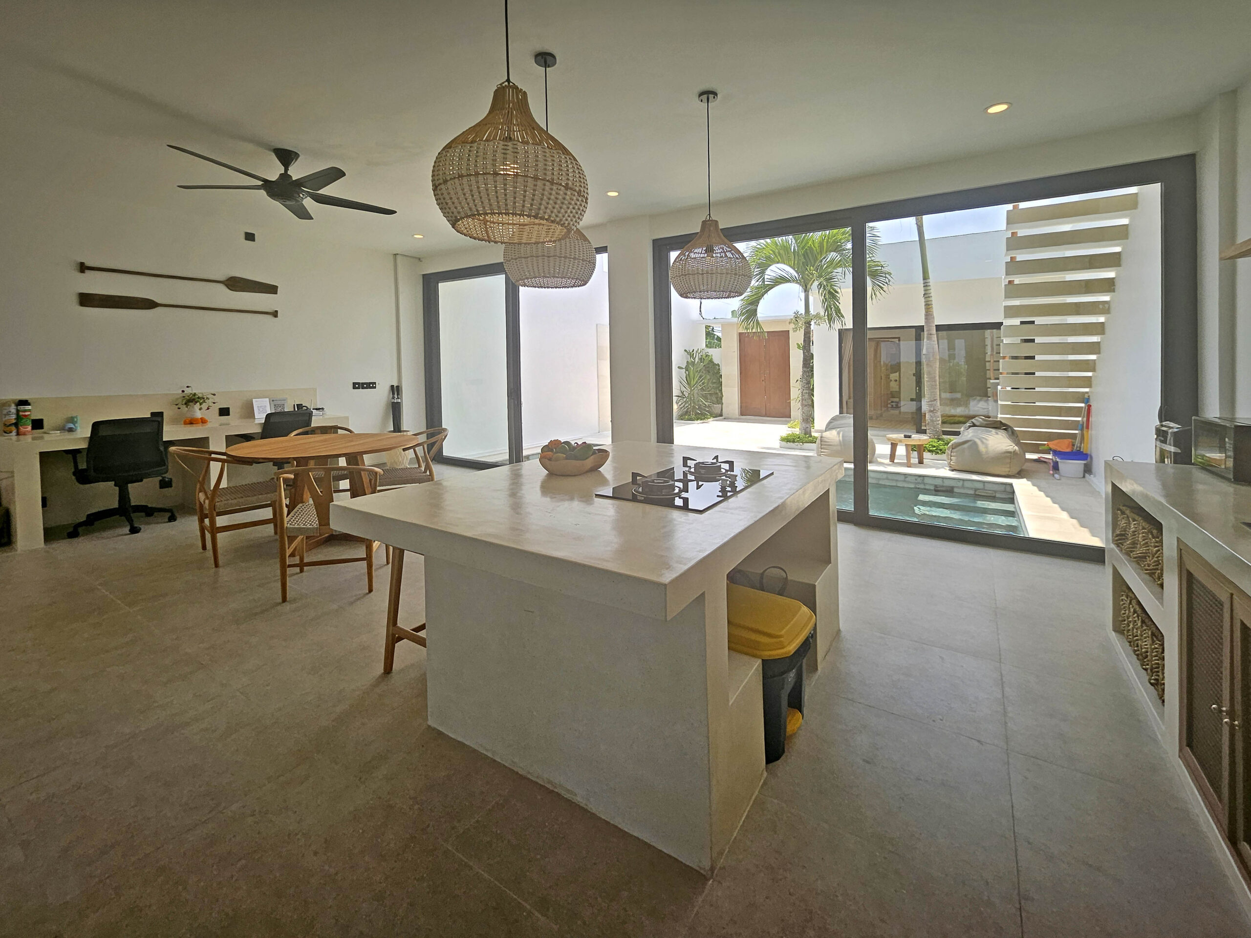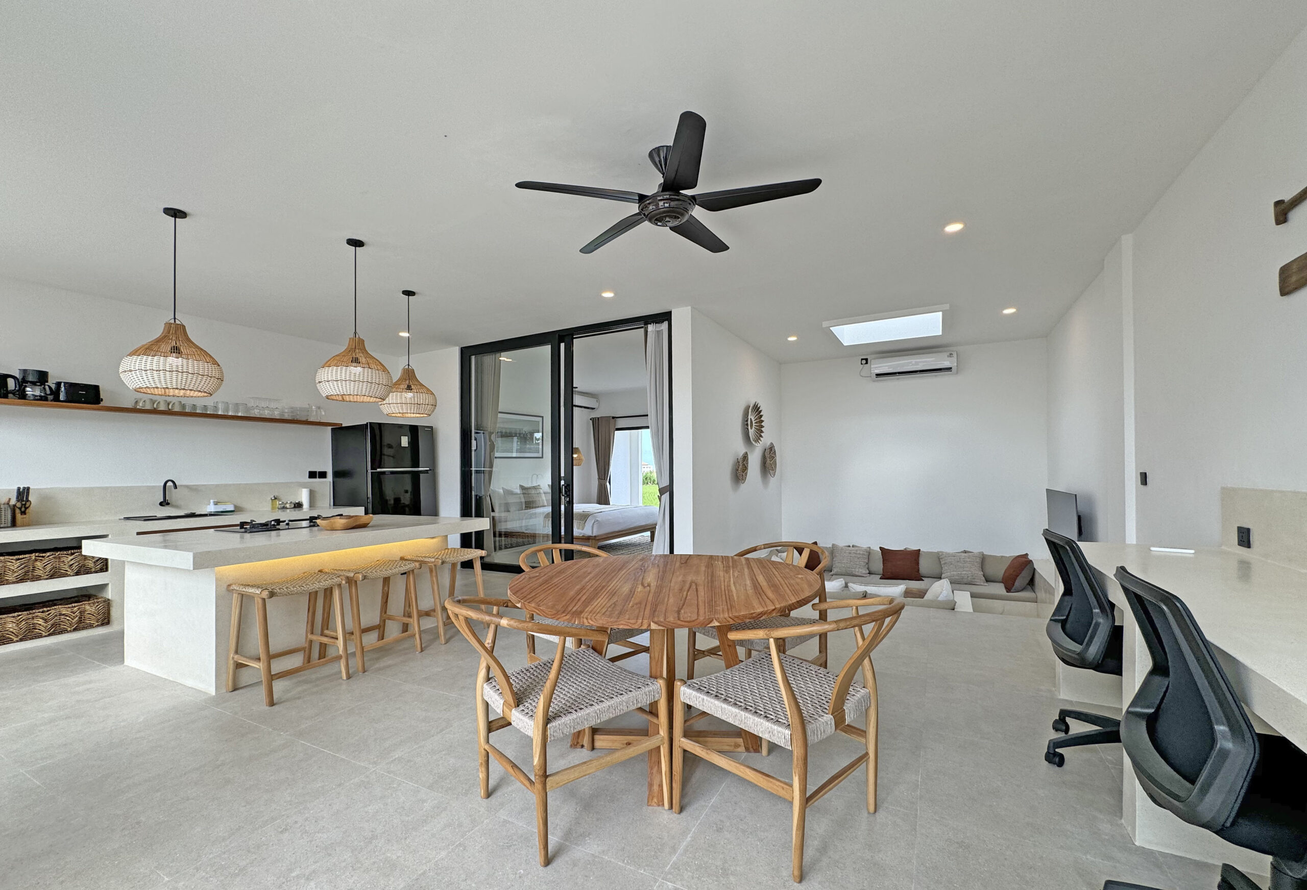 Il offre un grand espace de vie qui abrite une cuisine entièrement équipée avec un ilot central, un espace bureau et un confortable Sunken sofa avec TV. Cet espace de vie est climatisé et dispose de grandes baies vitrées donnant sur la piscine.