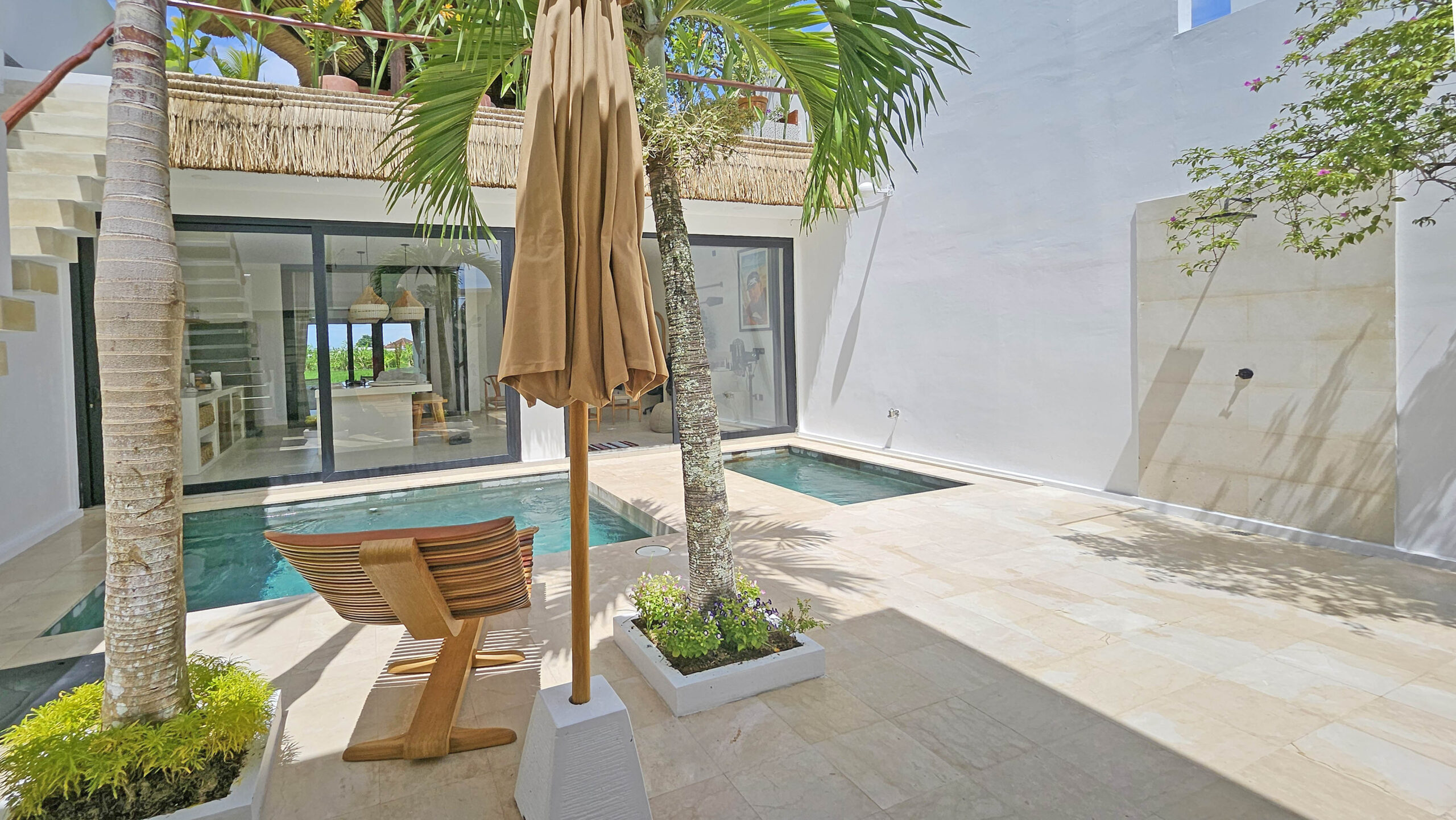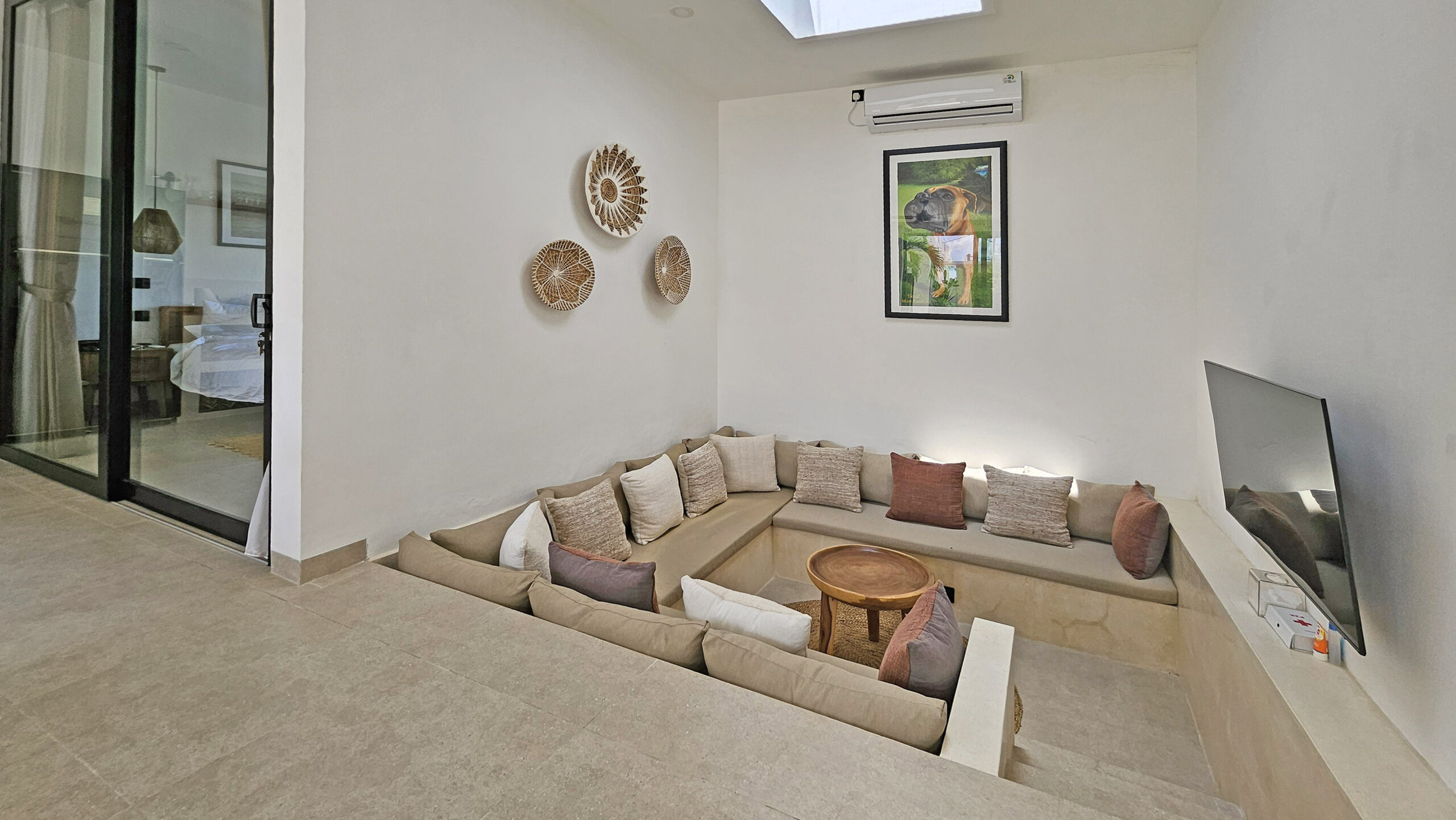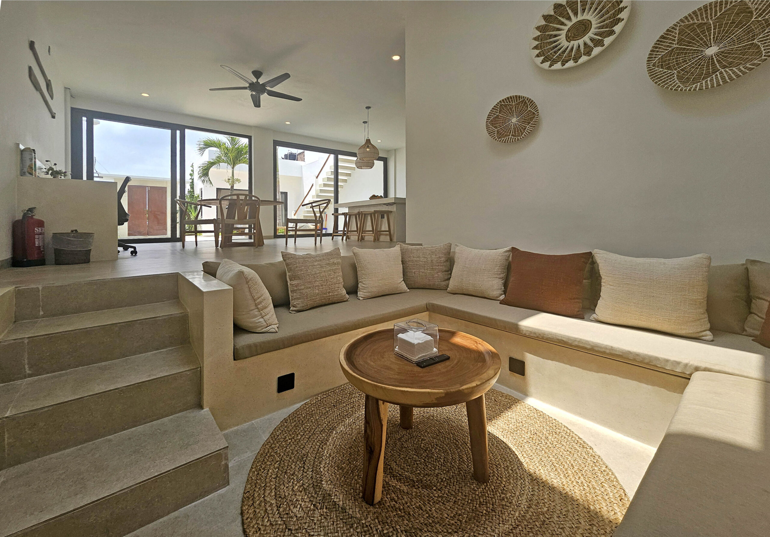 Il offre un grand espace de vie qui abrite une cuisine entièrement équipée avec un ilot central, un espace bureau et un confortable Sunken sofa avec TV. Cet espace de vie est climatisé et dispose de grandes baies vitrées donnant sur la piscine.