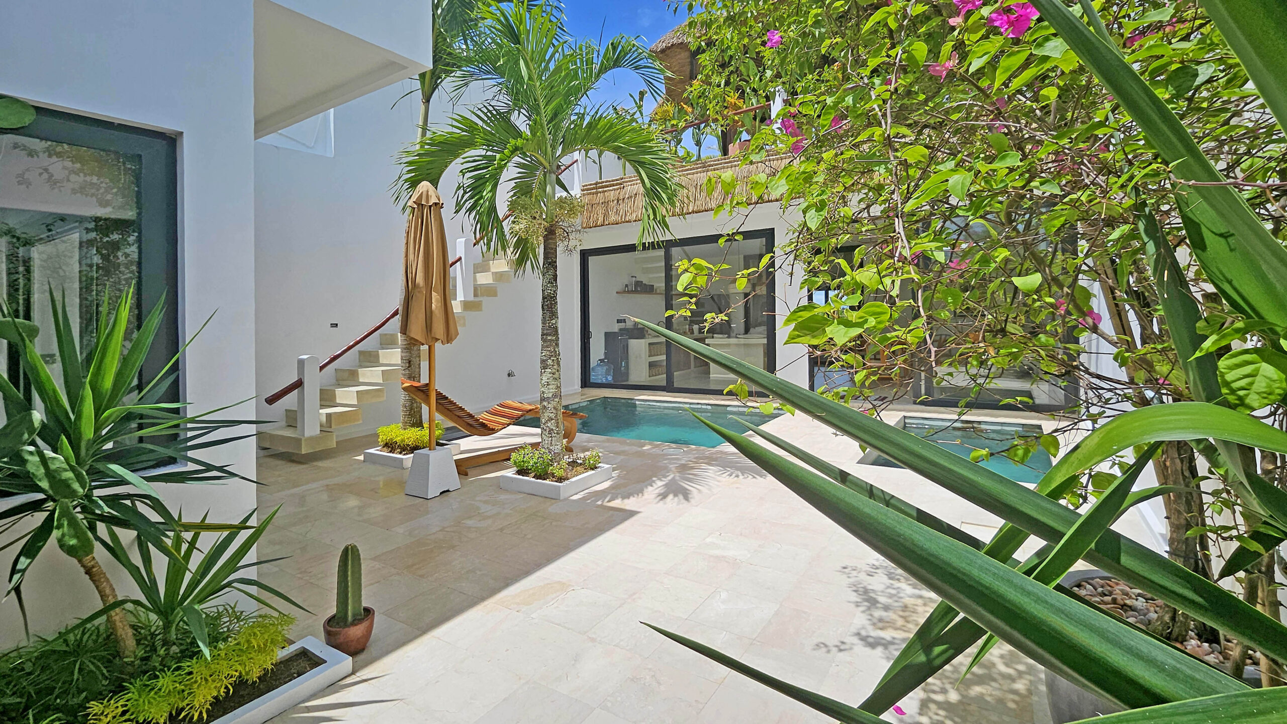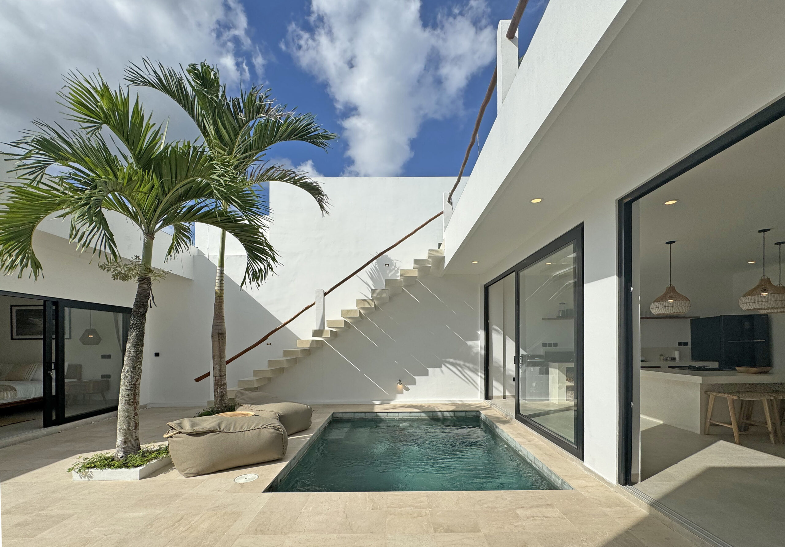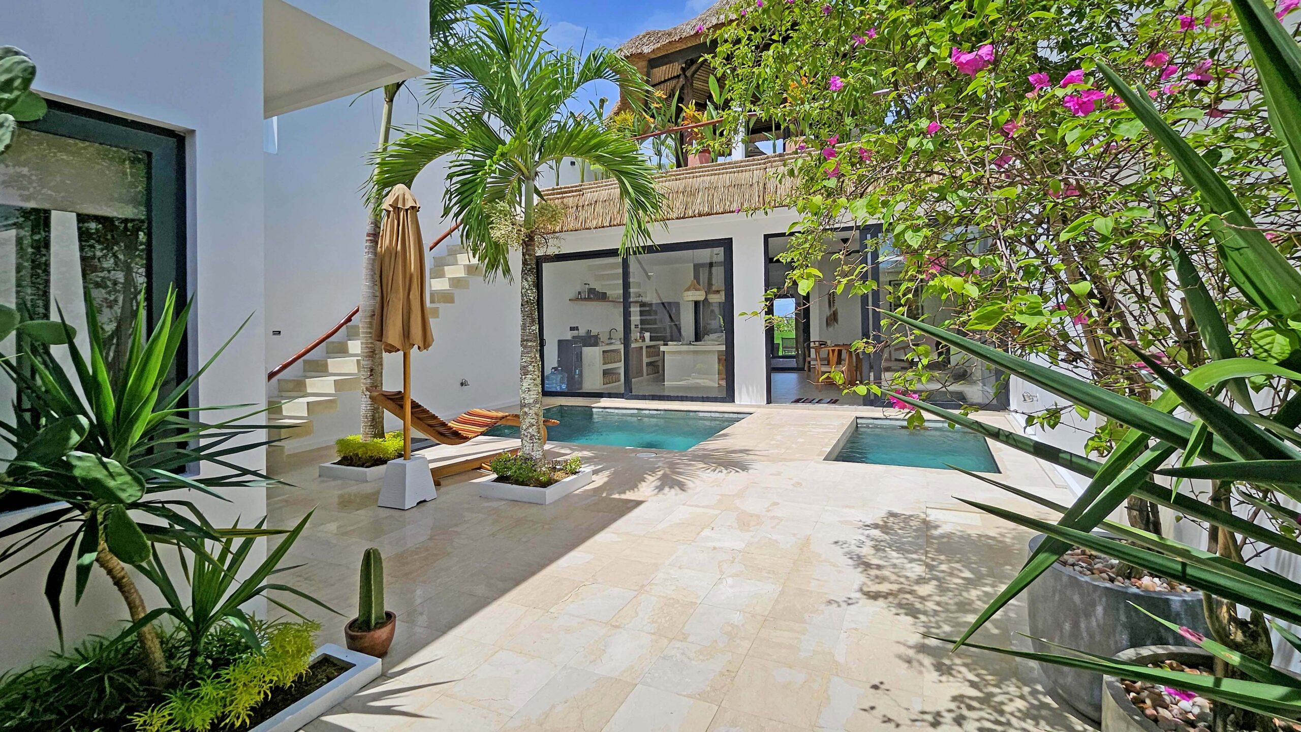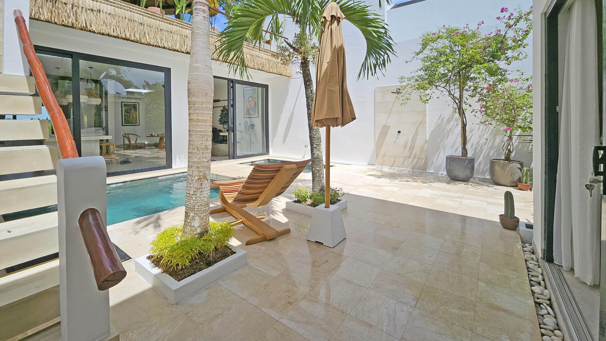 Il offre un grand espace de vie qui abrite une cuisine entièrement équipée avec un ilot central, un espace bureau et un confortable Sunken sofa avec TV. Cet espace de vie est climatisé et dispose de grandes baies vitrées donnant sur la piscine.