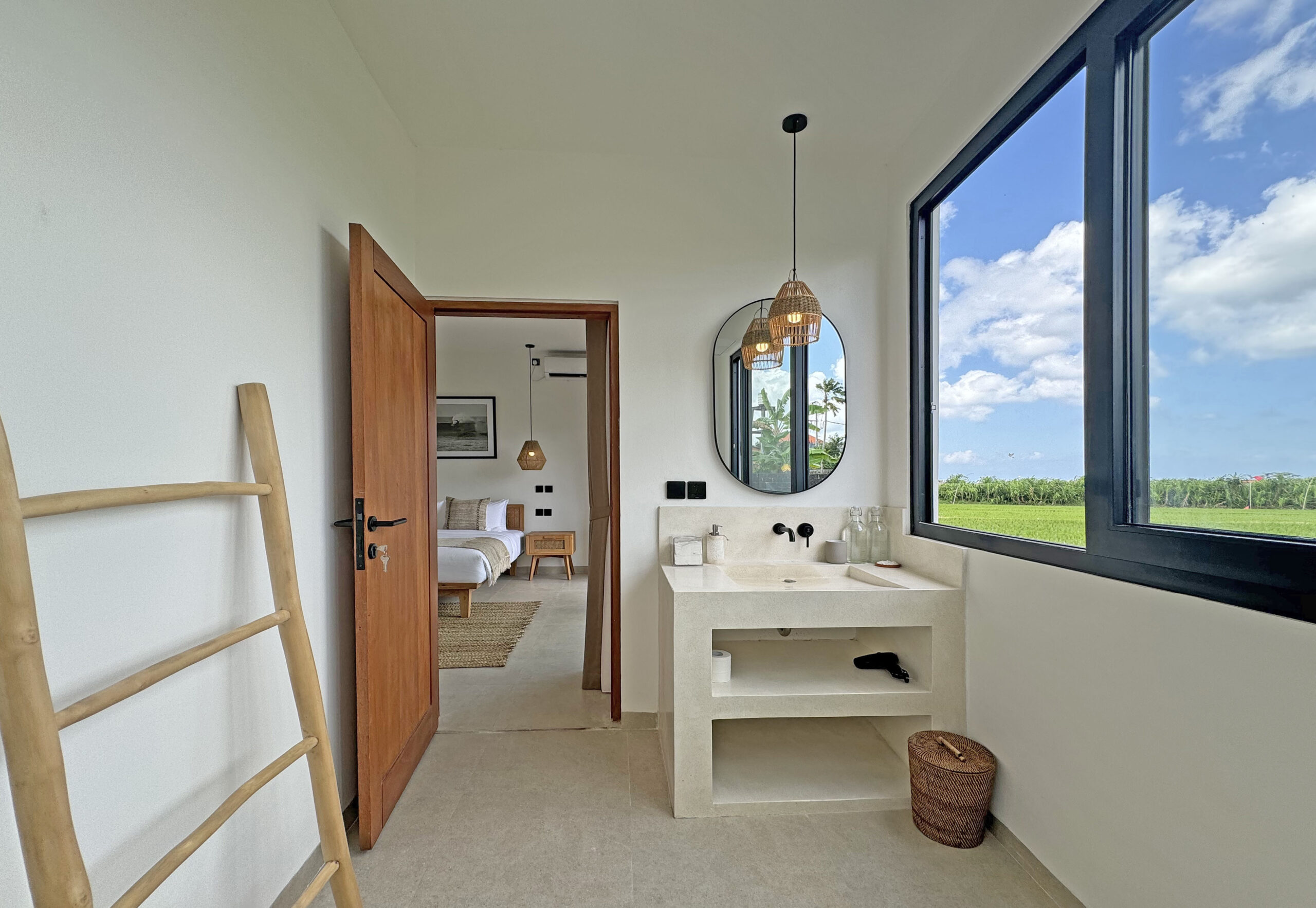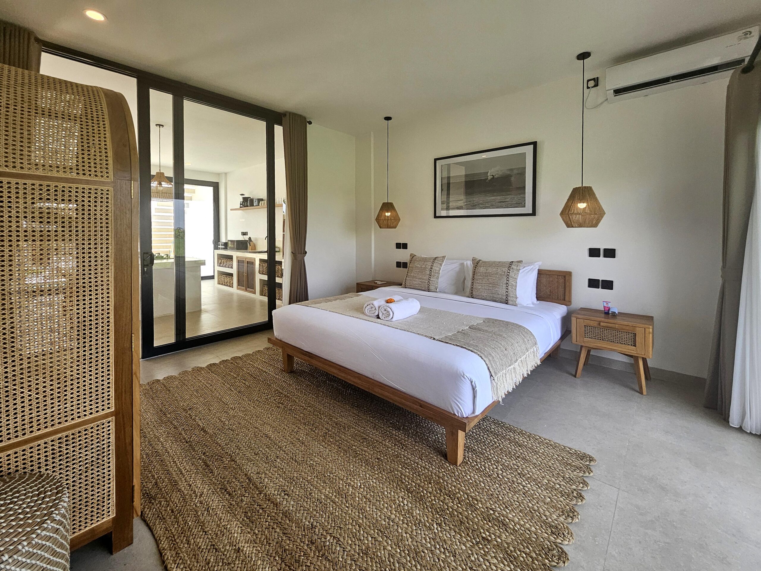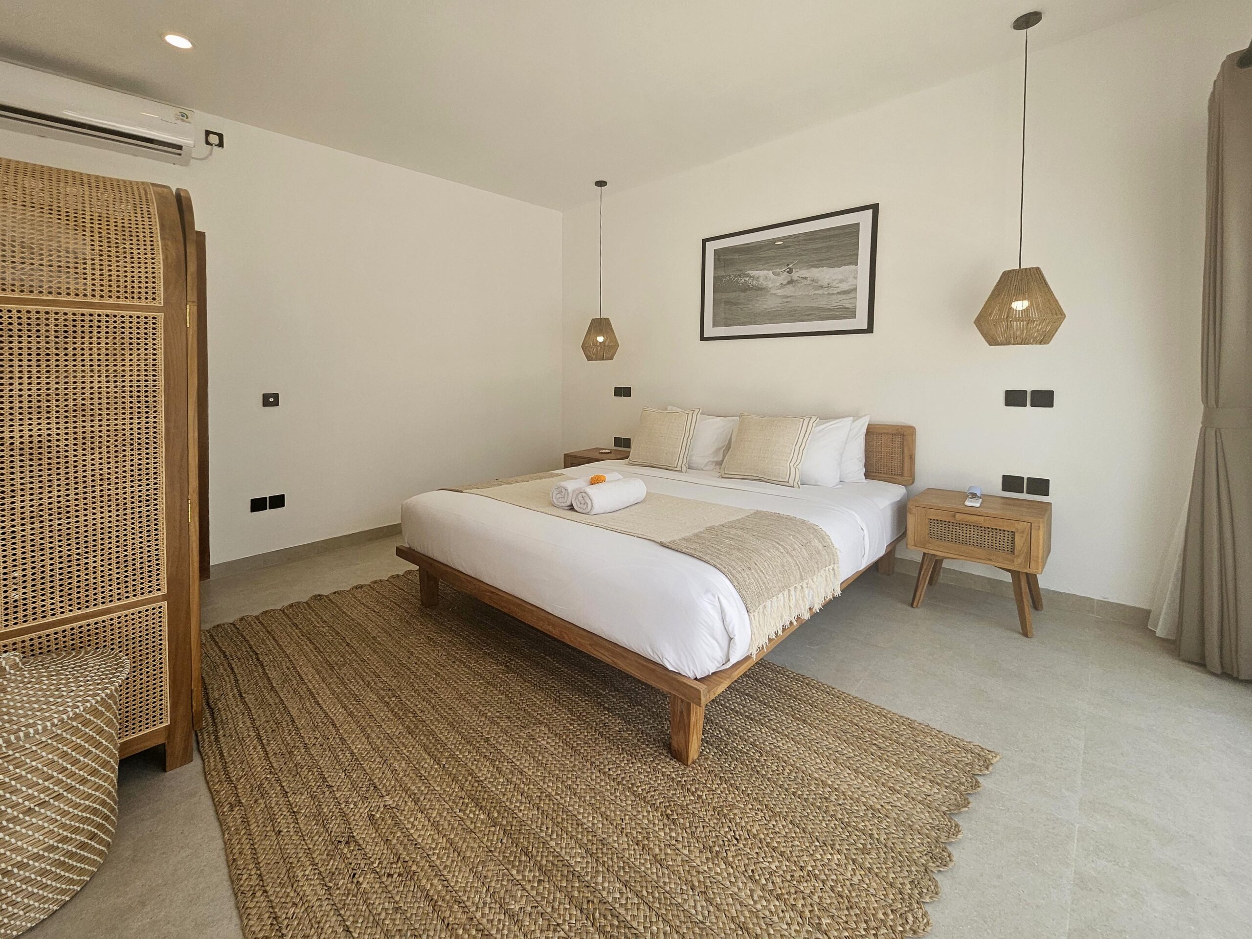 Une chambre climatisée avec un lit King size et sa salle de bains privative est située à côté du salon, elle possède un balcon aménagé d’un petit salon avec une vue exceptionnelle sur les rizières.