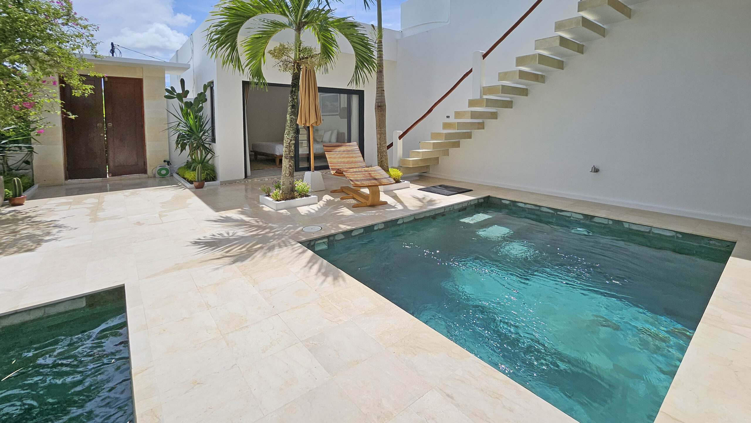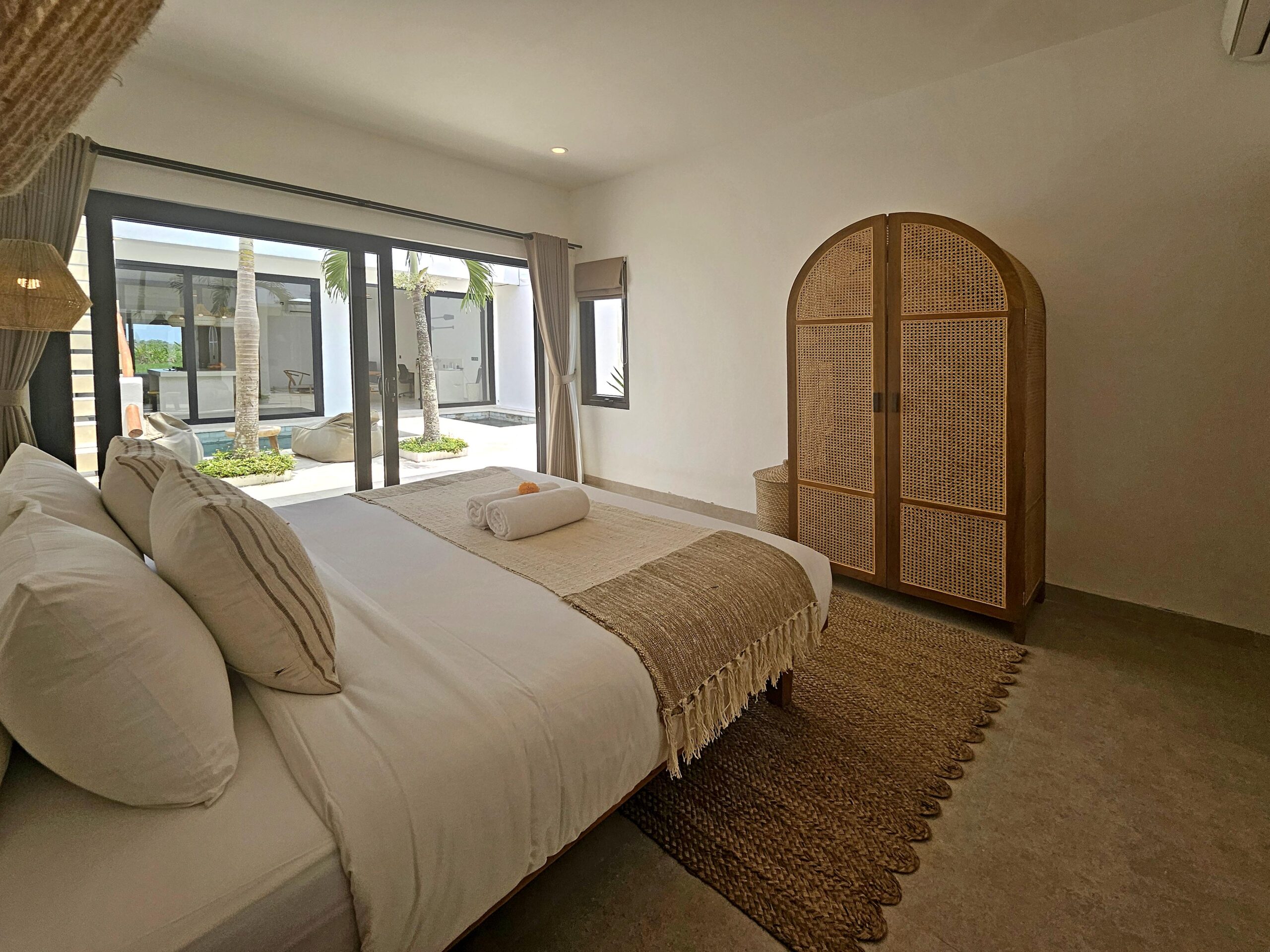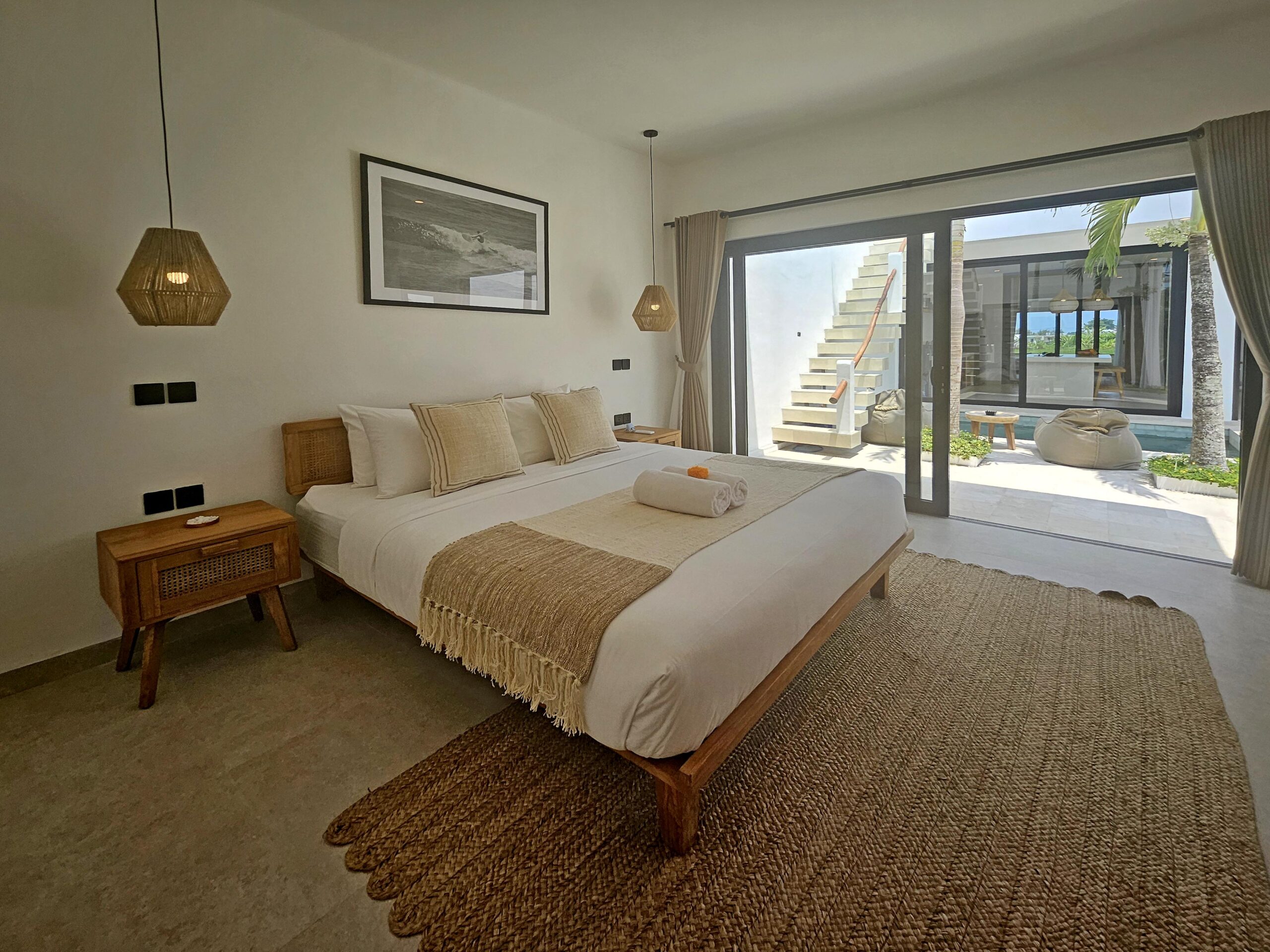 L’autre chambre avec son lit King size et sa salle de bains se situe dans un bâtiment séparé de l’autre côté de la piscine. Elle est équipée de l’air conditionné et possède de grandes baies vitrées donnant sur la piscine.