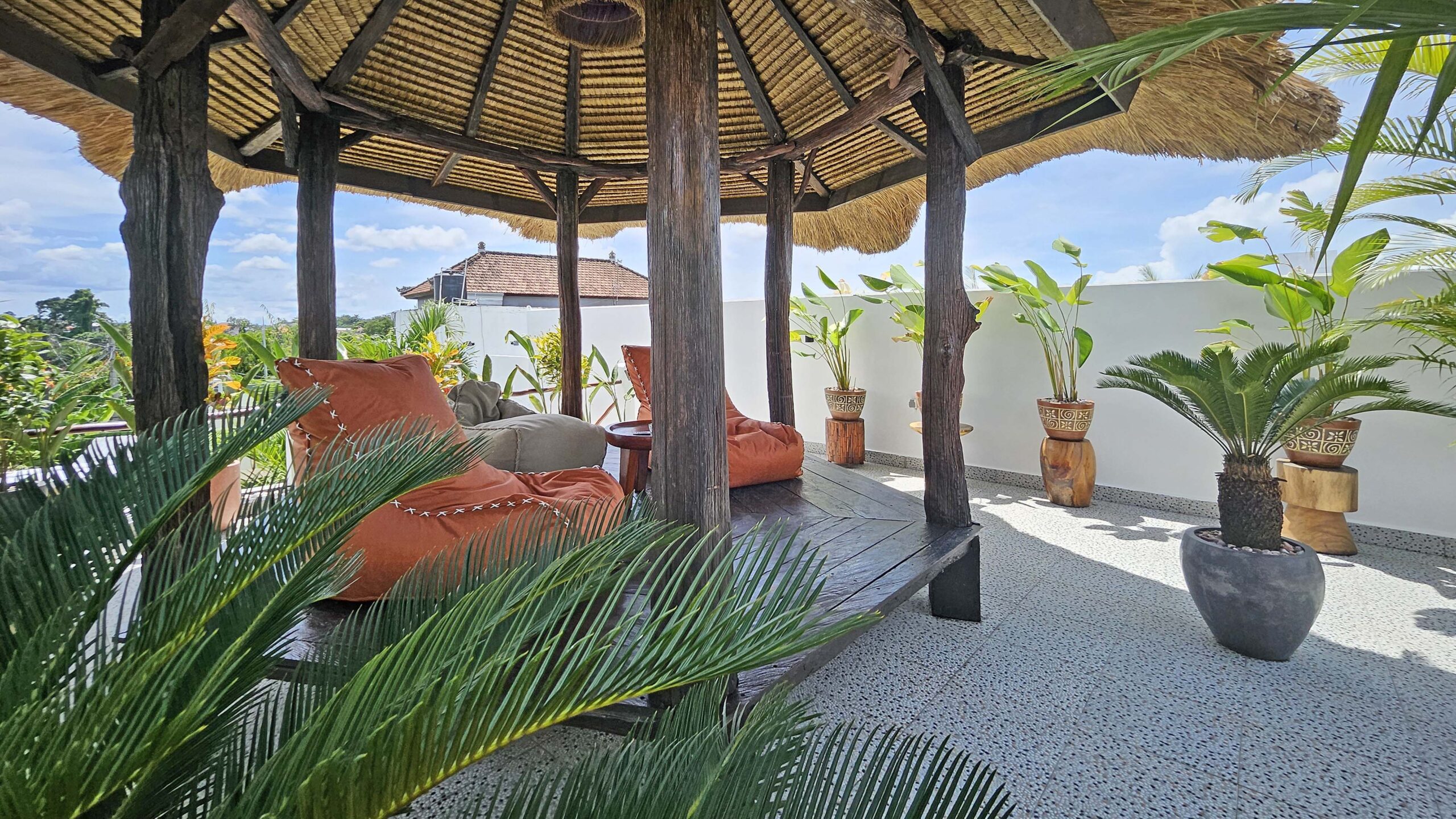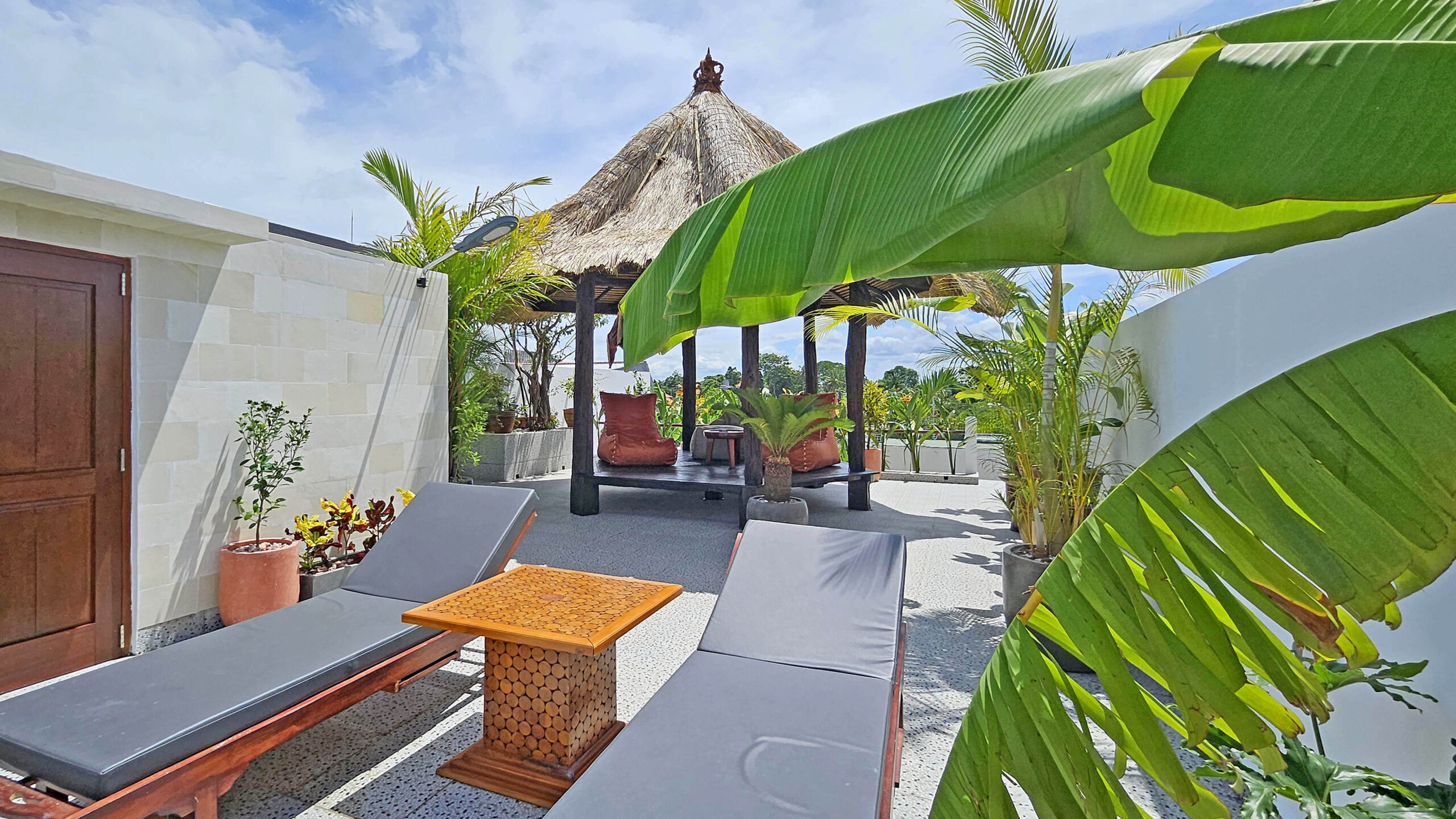 Un escalier dessert un spacieux rooftop avec vue sur les rizières à perte de vue. C’est l’endroit idéal pour se détendre et prendre un verre au coucher du soleil.