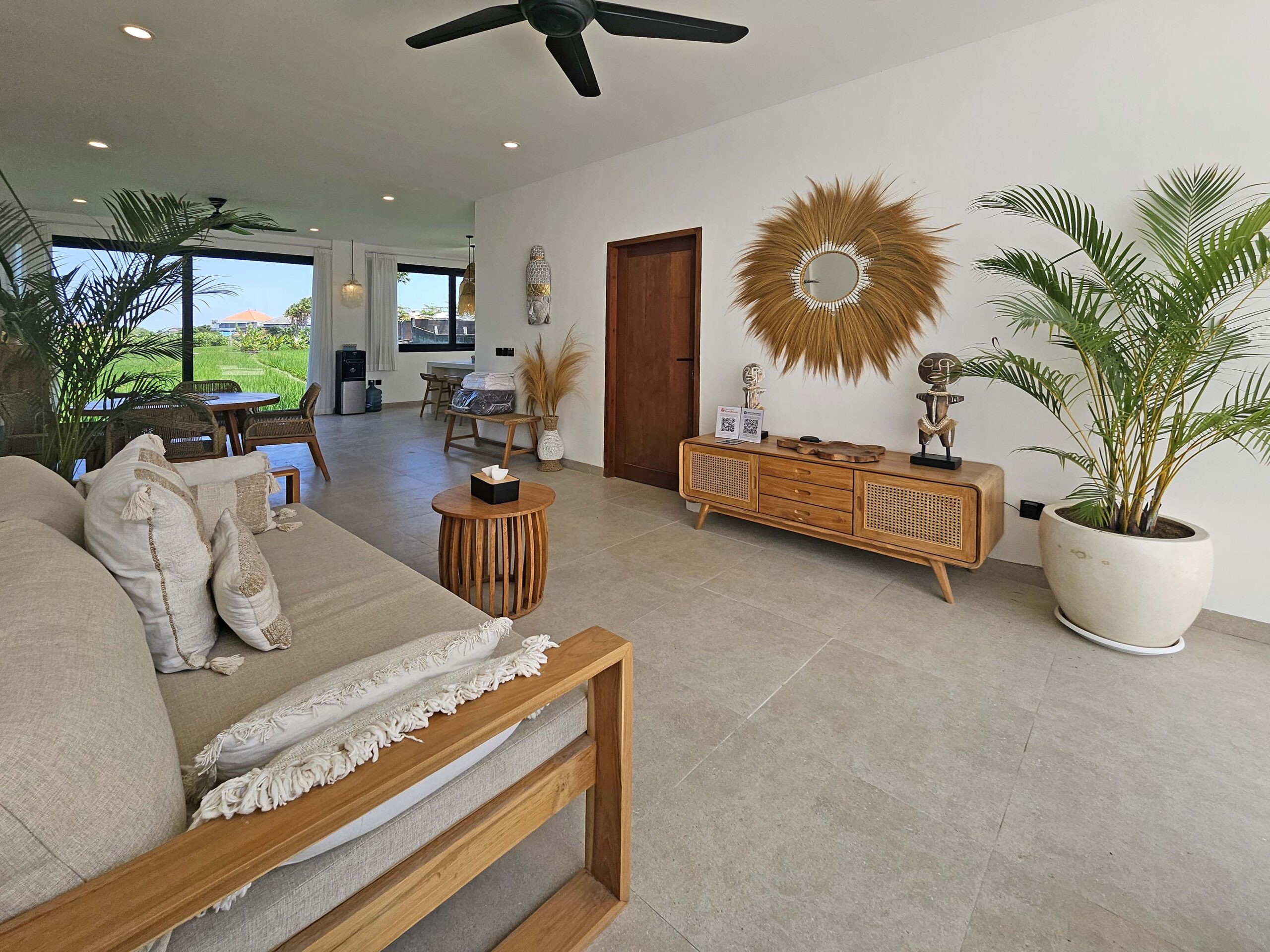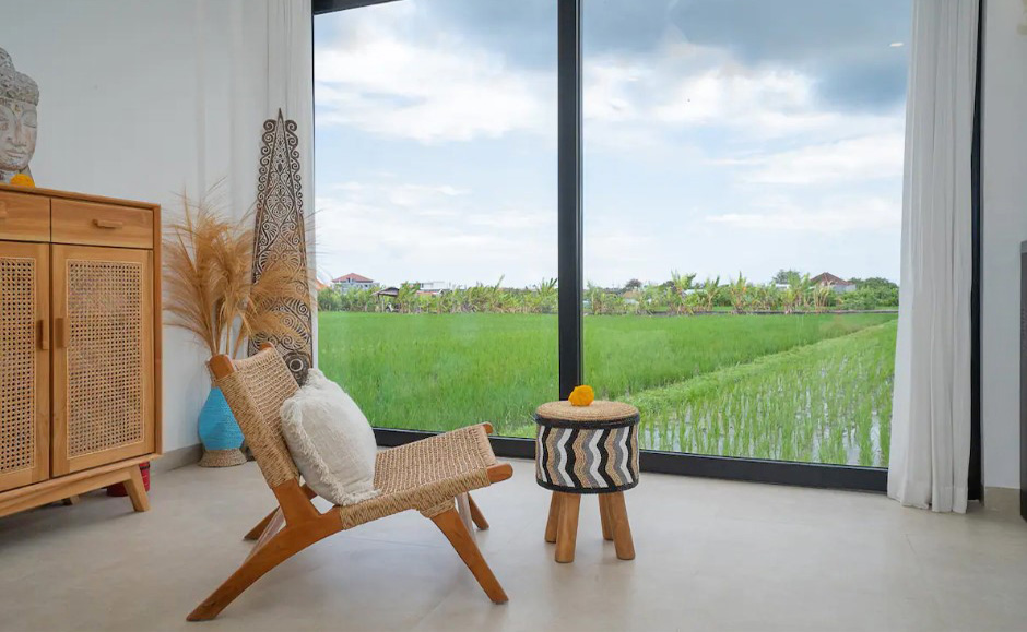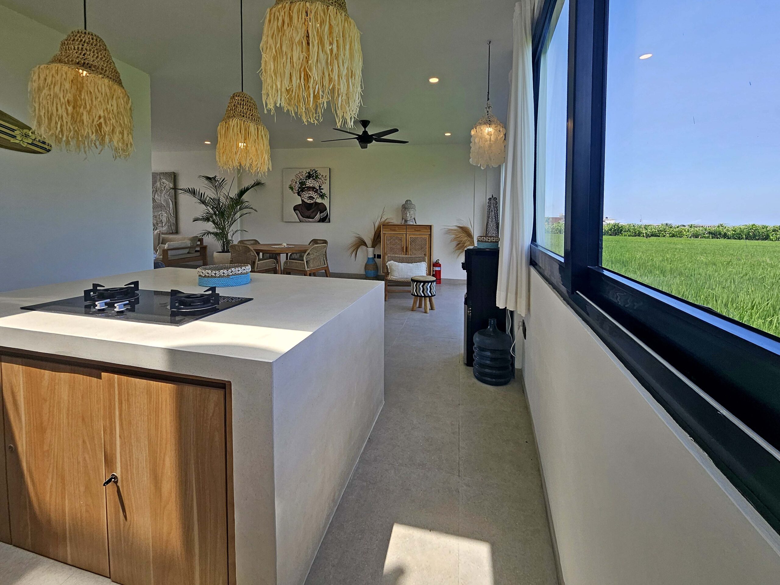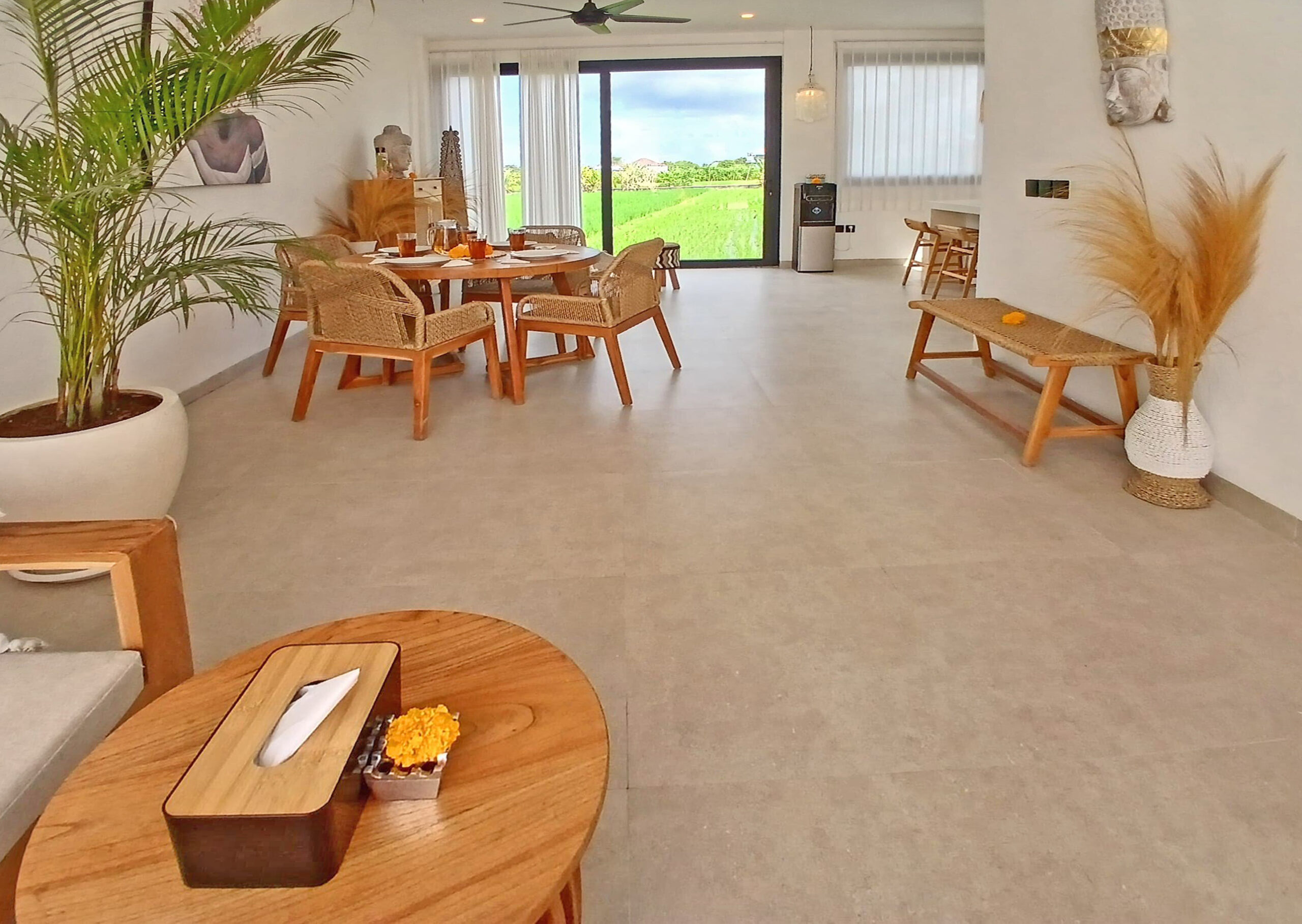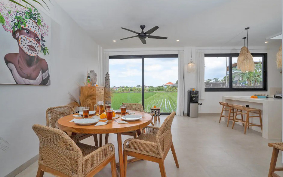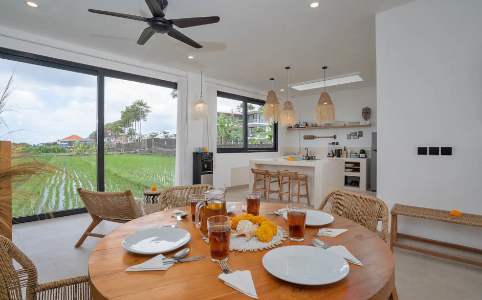 Il offre un grand espace de vie qui abrite une cuisine entièrement équipée avec un ilot central, une salle à manger et un salon joliment décoré. Cet espace de vie dispose d’une vue incroyable sur les rizières d’un côté et sur la piscine de l’autre.