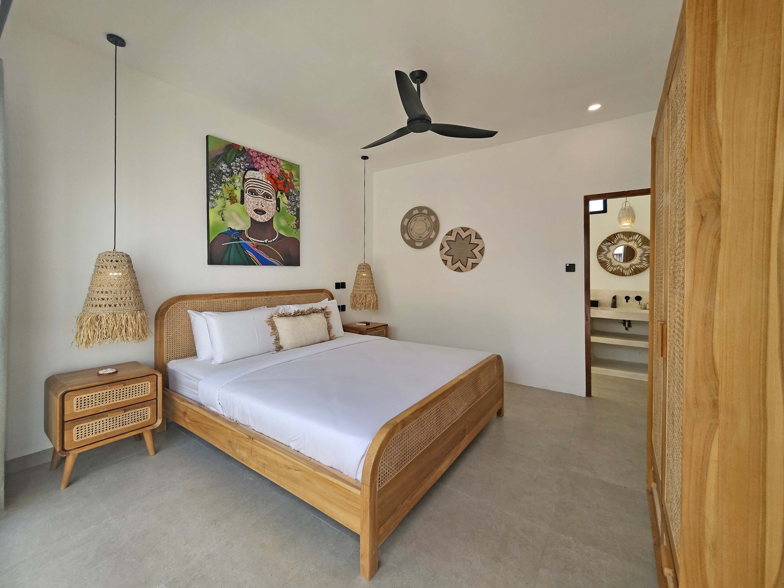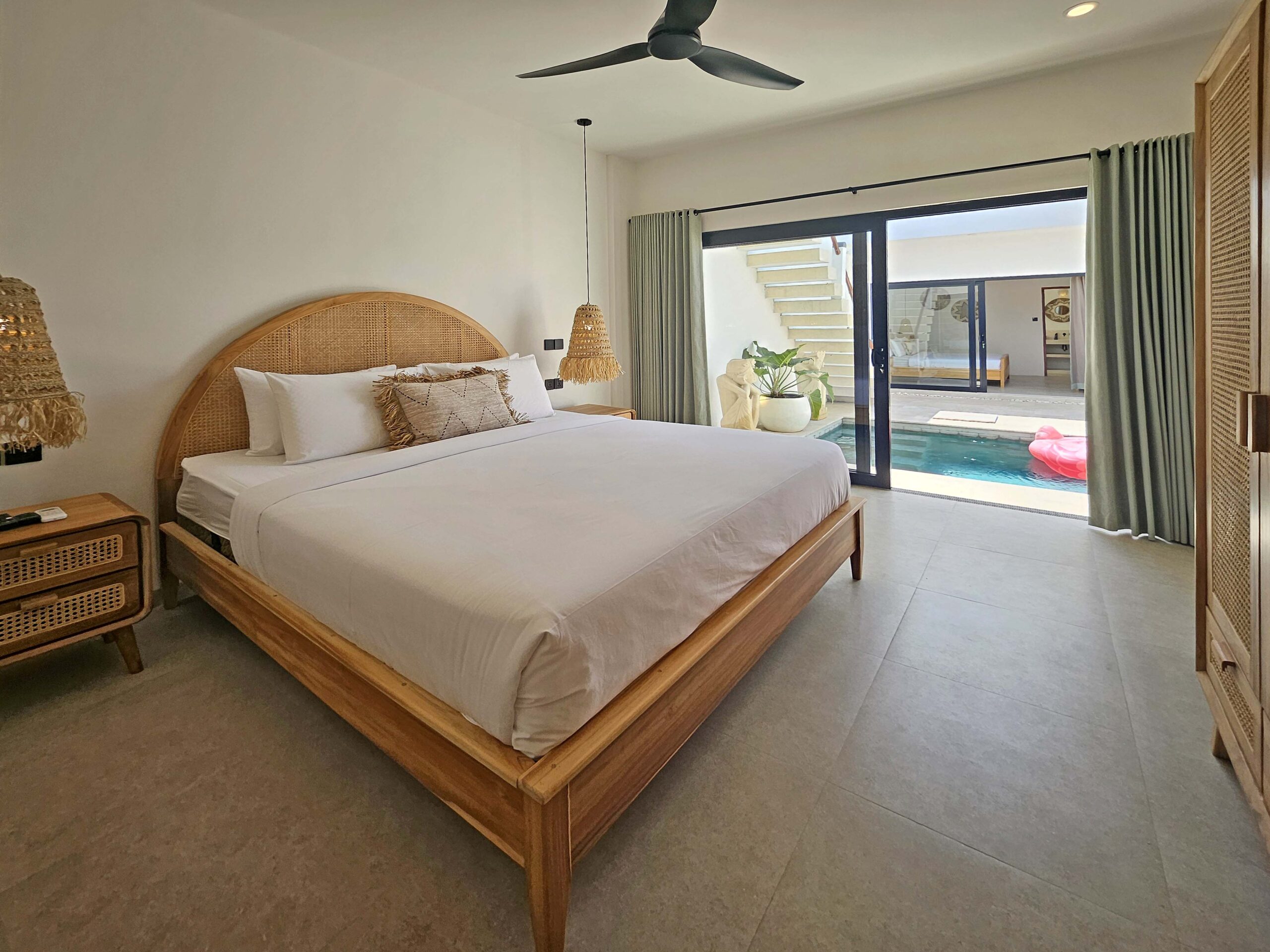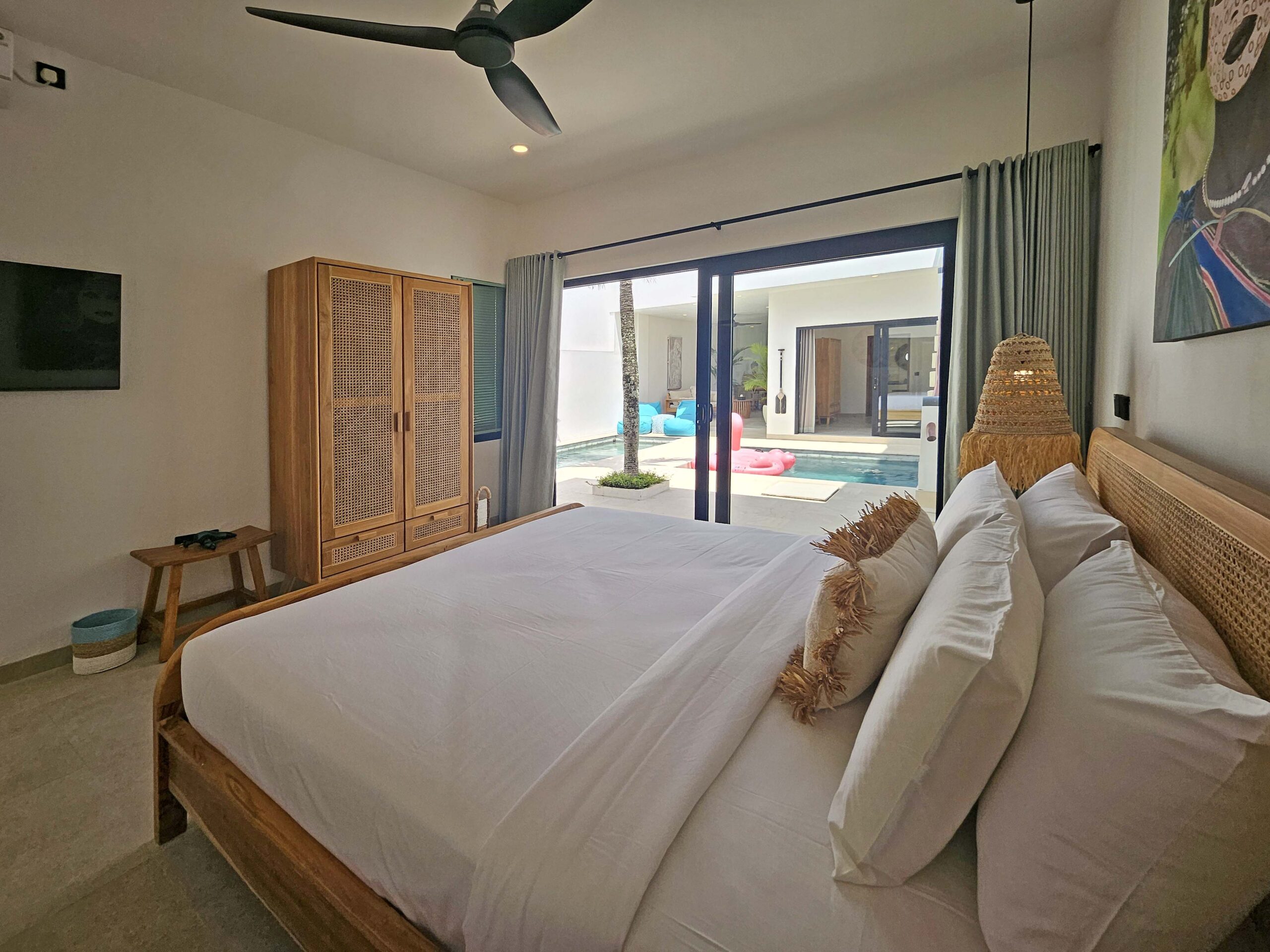 Une chambre avec un lit King size, une TV et sa salle de bains privative est située à côté du salon tandis que l’autre chambre avec son lit King size, une TV et sa salle de bains se situe dans un bâtiment séparé de l’autre côté de la piscine. Elles sont équipées de l’air conditionné et possèdent toutes les deux de grandes baies vitrées donnant sur la piscine.