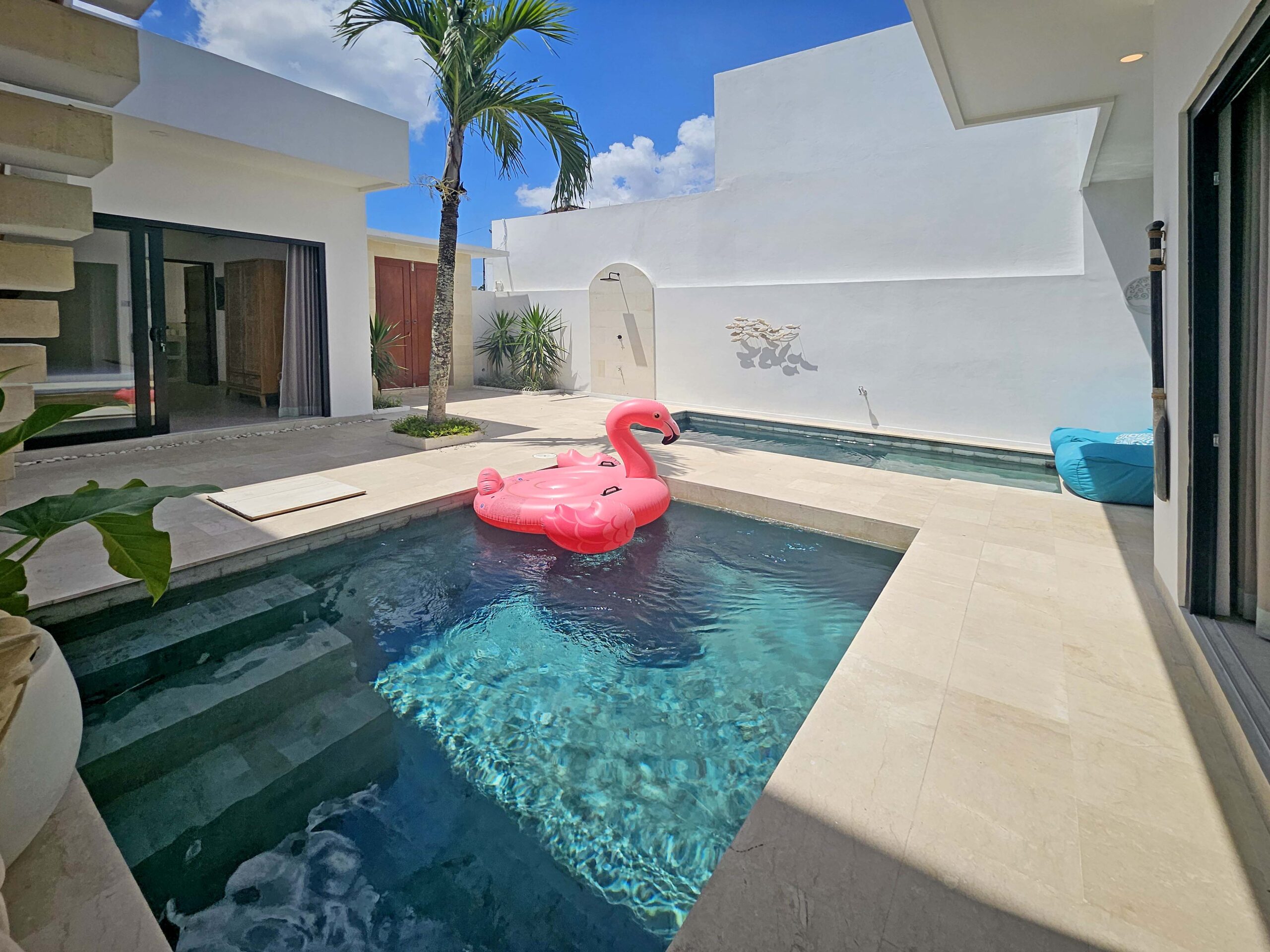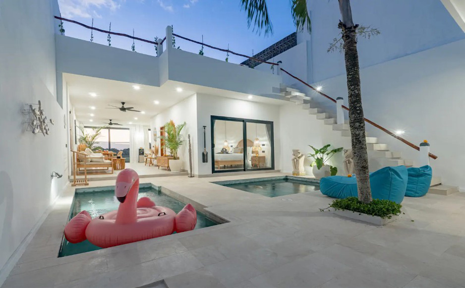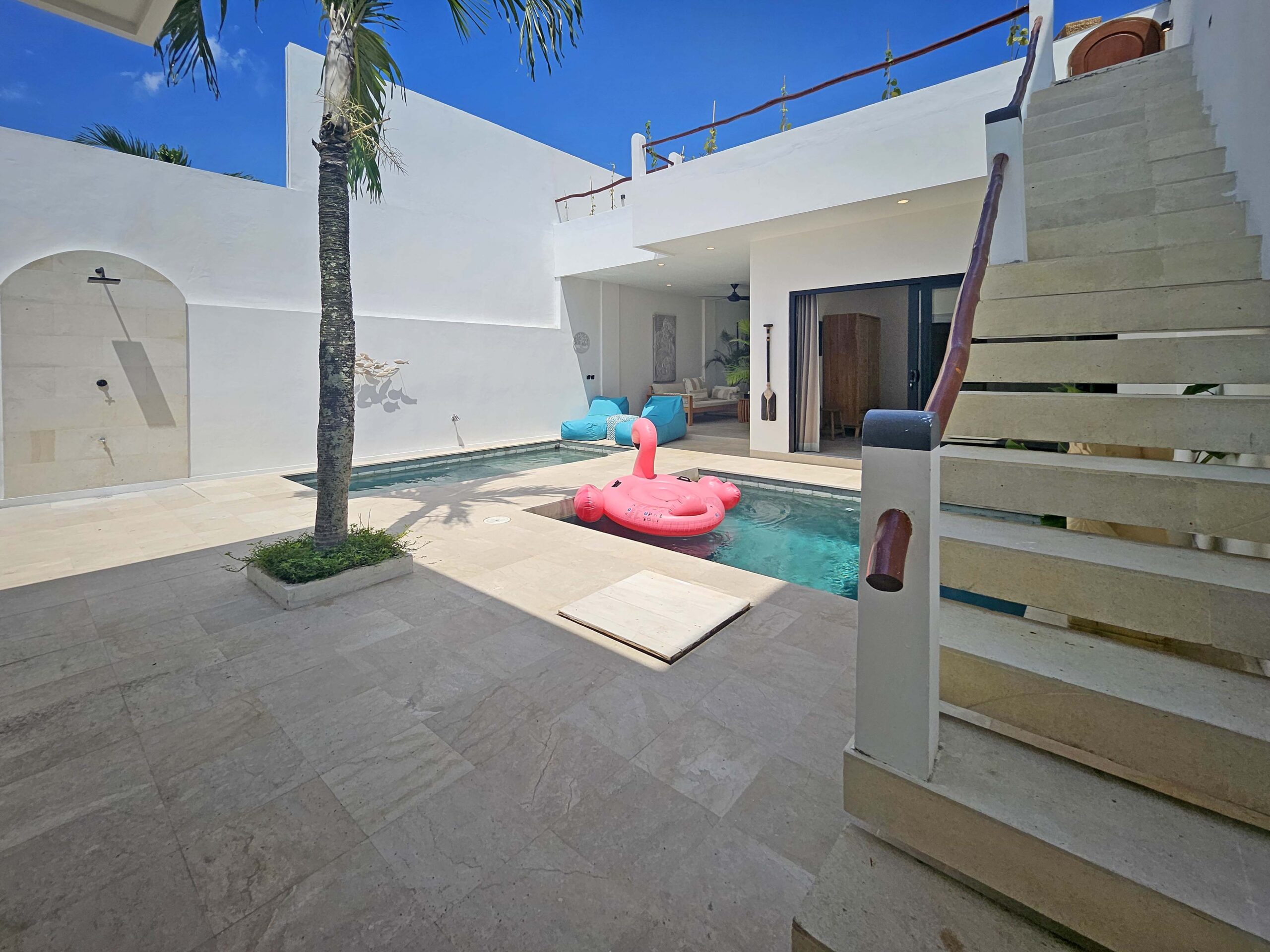 Une chambre avec un lit King size, une TV et sa salle de bains privative est située à côté du salon tandis que l’autre chambre avec son lit King size, une TV et sa salle de bains se situe dans un bâtiment séparé de l’autre côté de la piscine. Elles sont équipées de l’air conditionné et possèdent toutes les deux de grandes baies vitrées donnant sur la piscine.