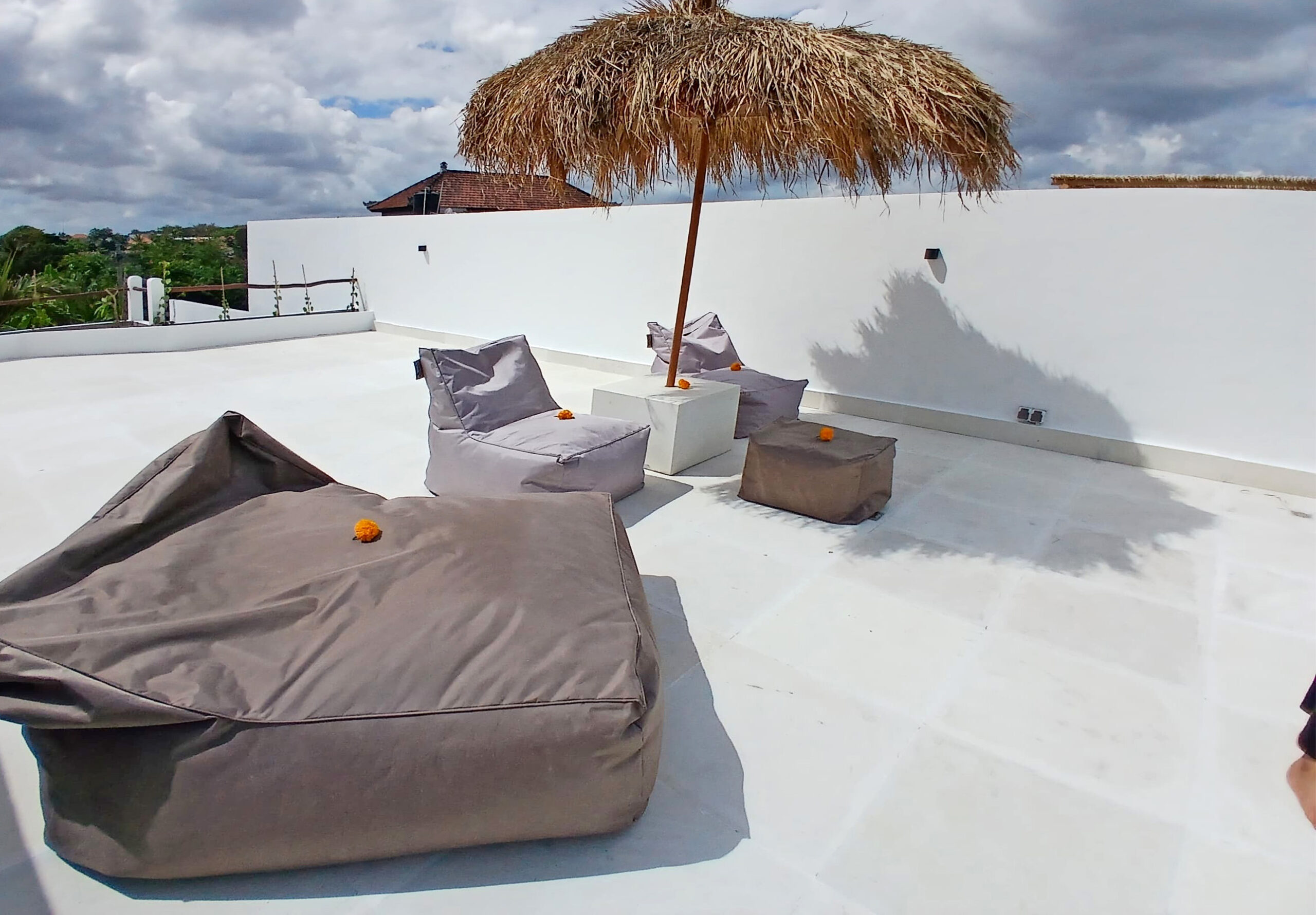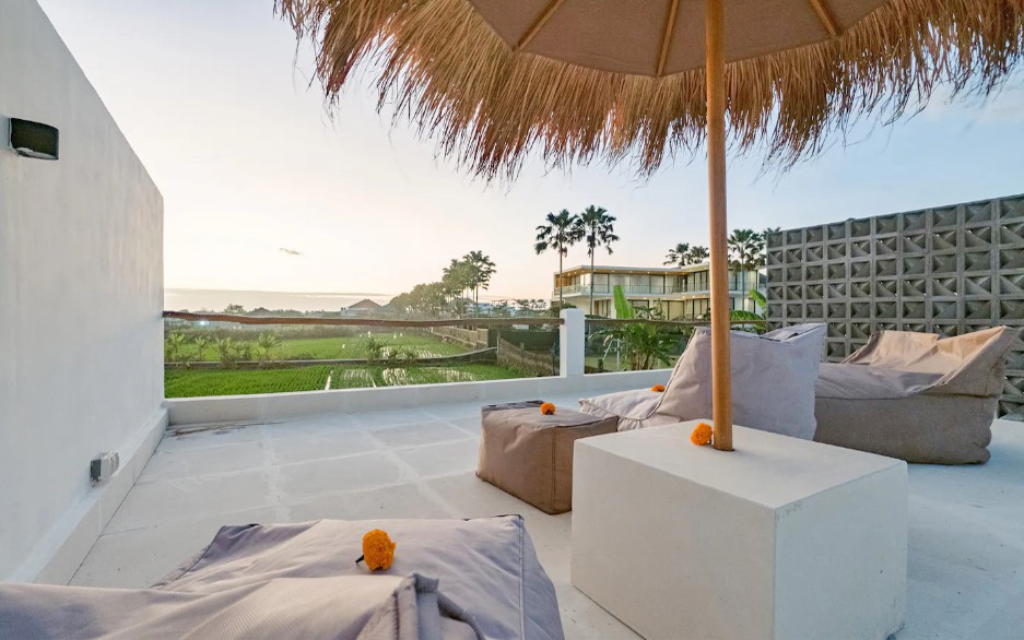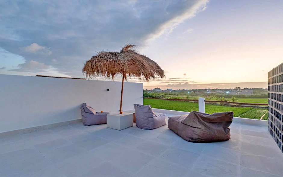 Un escalier dessert un spacieux rooftop avec vue sur les rizières à perte de vue. C’est l’endroit idéal pour se détendre et prendre un verre au coucher du soleil.