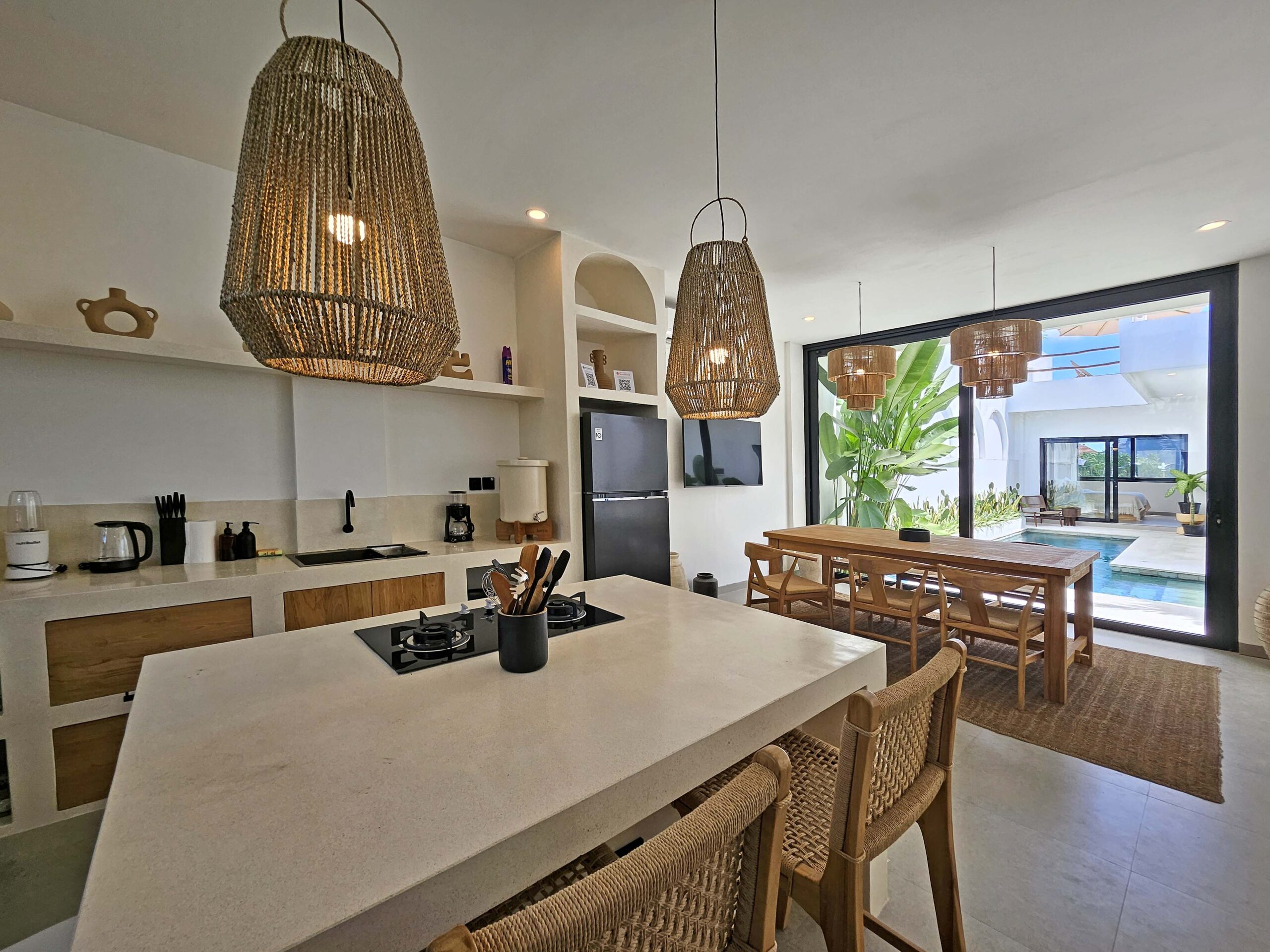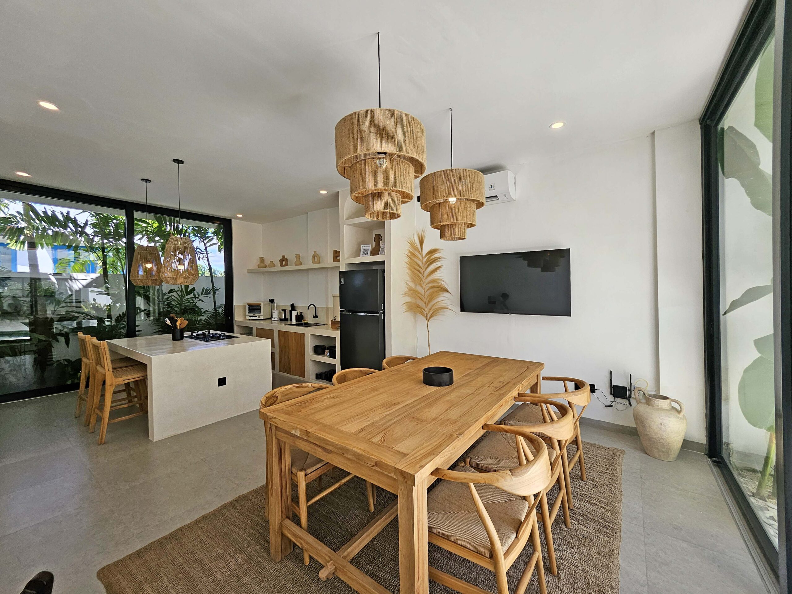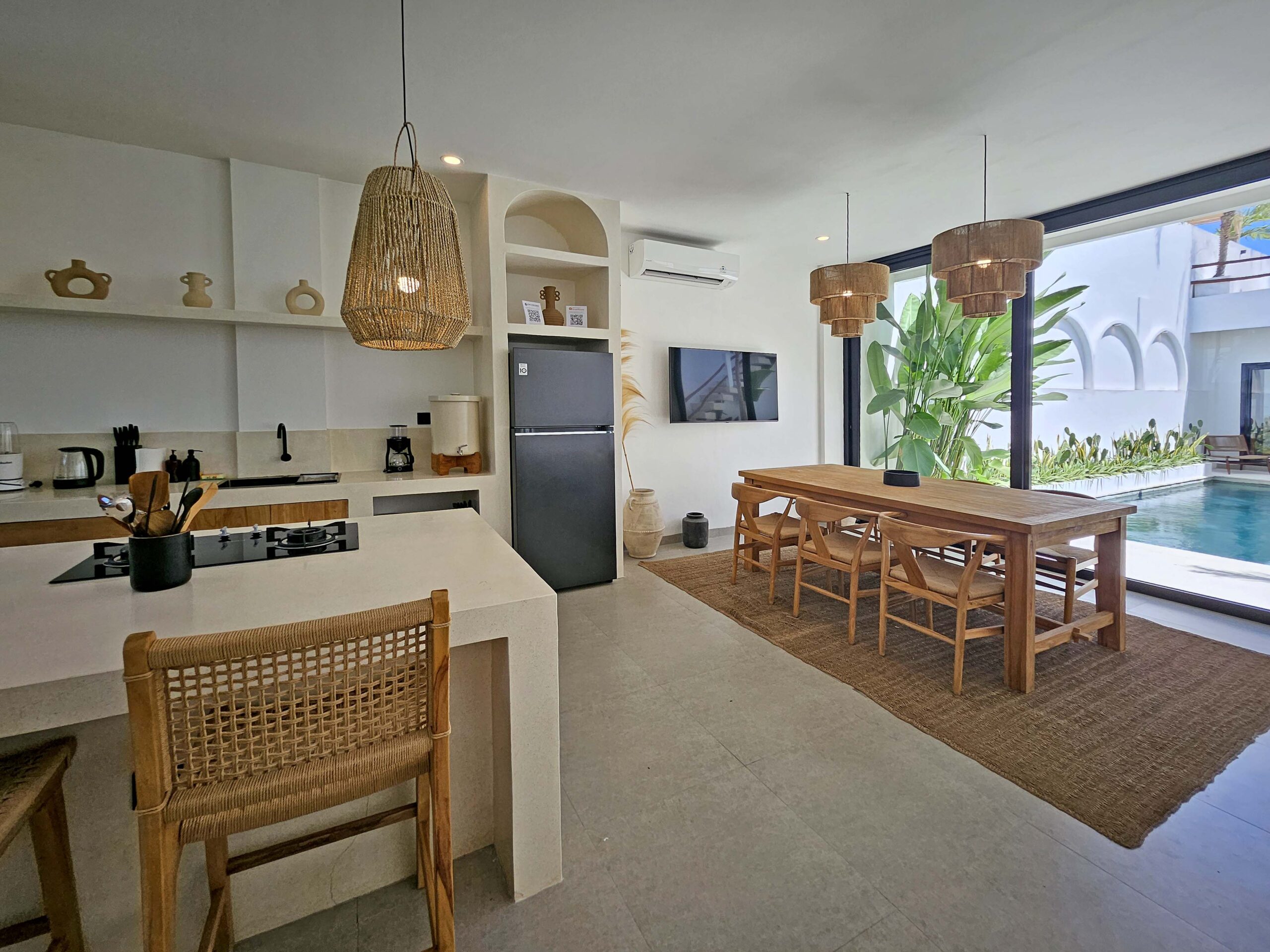 You’ll find a spacious, bright, fully air-conditioned living area with a modern kitchen featuring a central island, a welcoming dining area, and a cozy lounge with a TV and Netflix. Large glass doors open on one side to a green corner and on the other to the pool.