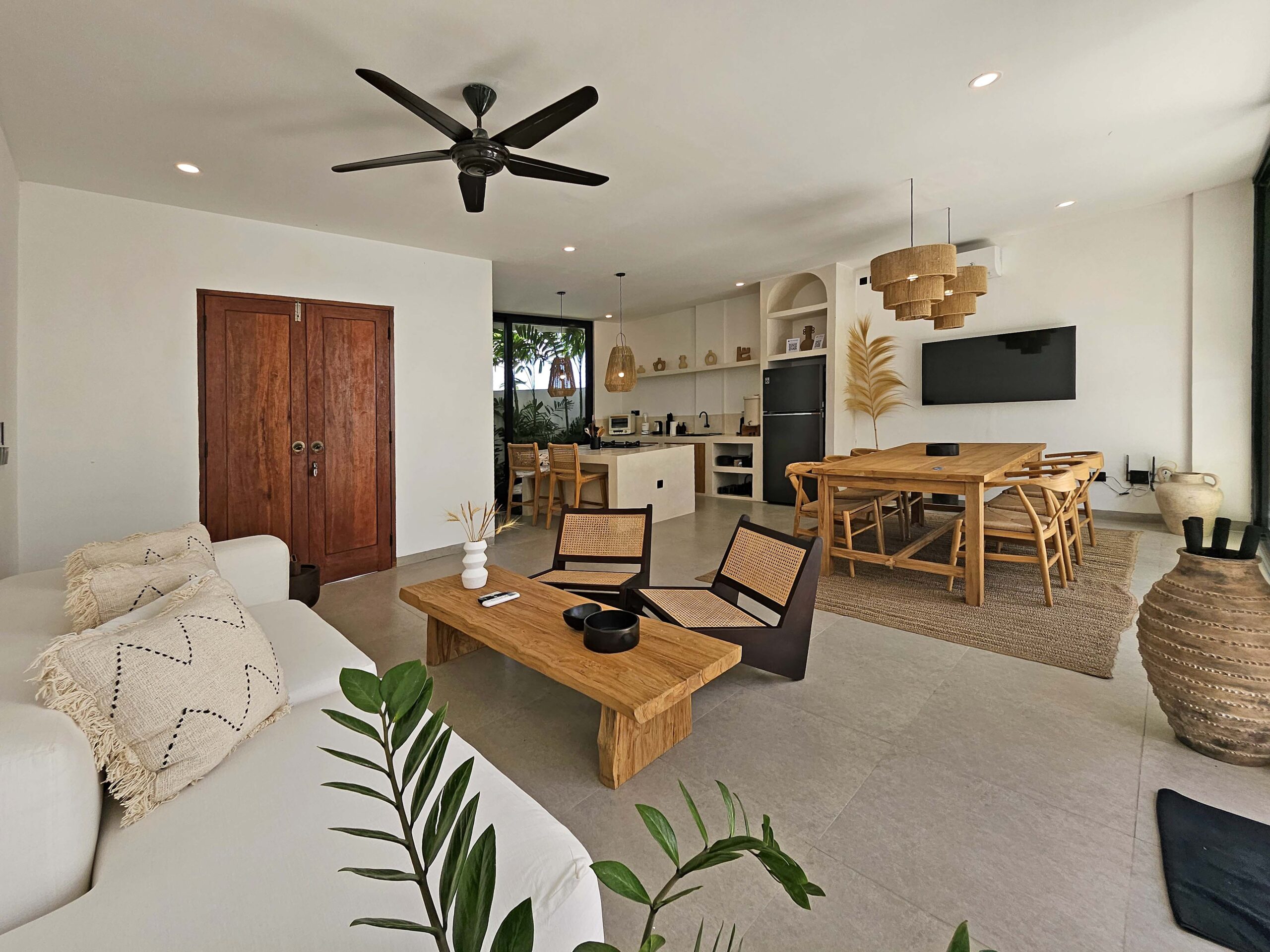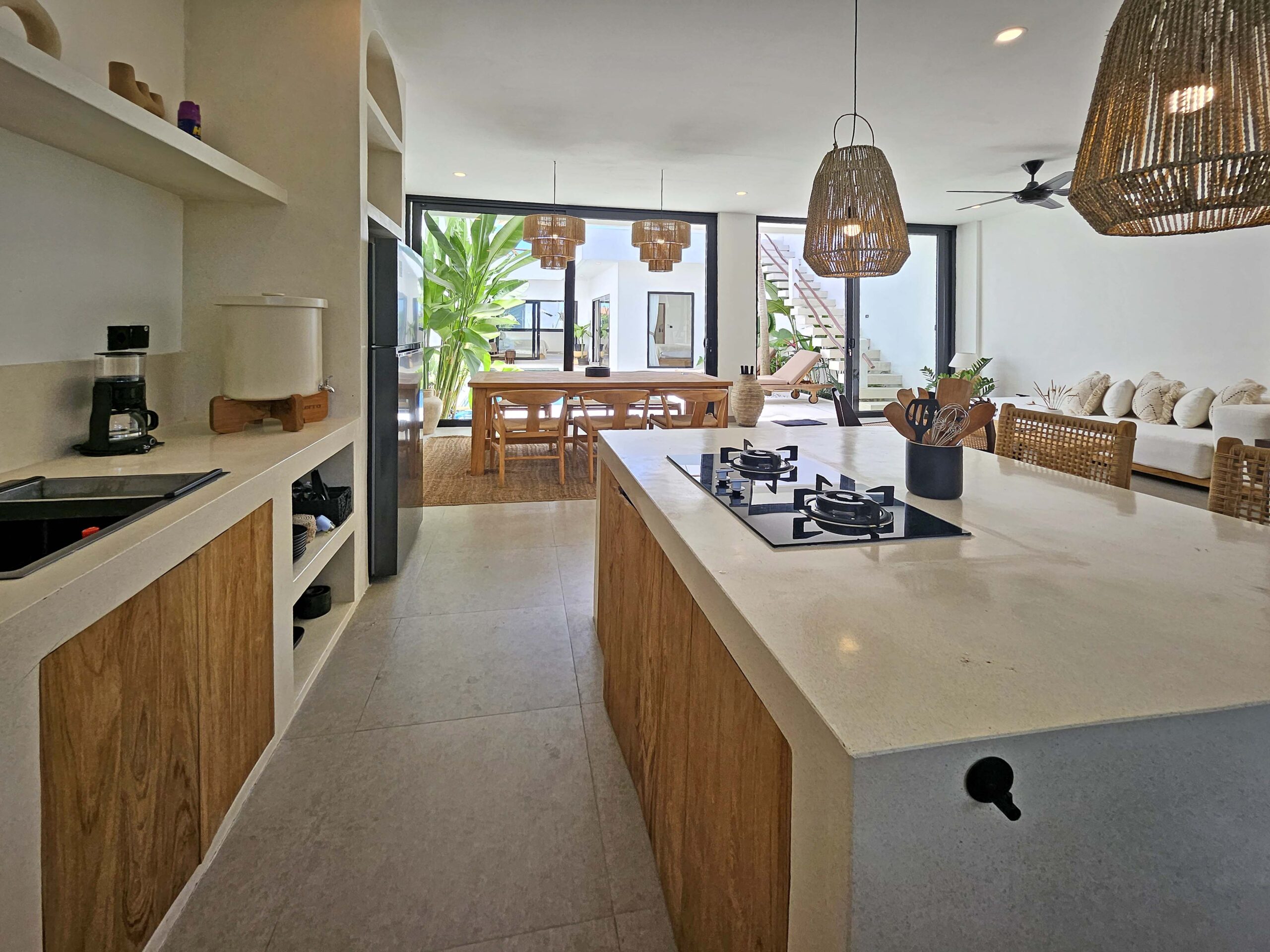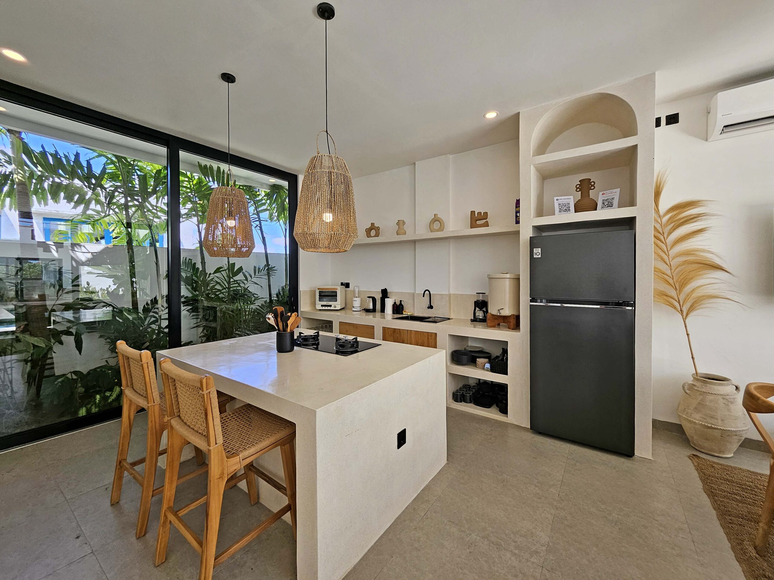 You’ll find a spacious, bright, fully air-conditioned living area with a modern kitchen featuring a central island, a welcoming dining area, and a cozy lounge with a TV and Netflix. Large glass doors open on one side to a green corner and on the other to the pool.