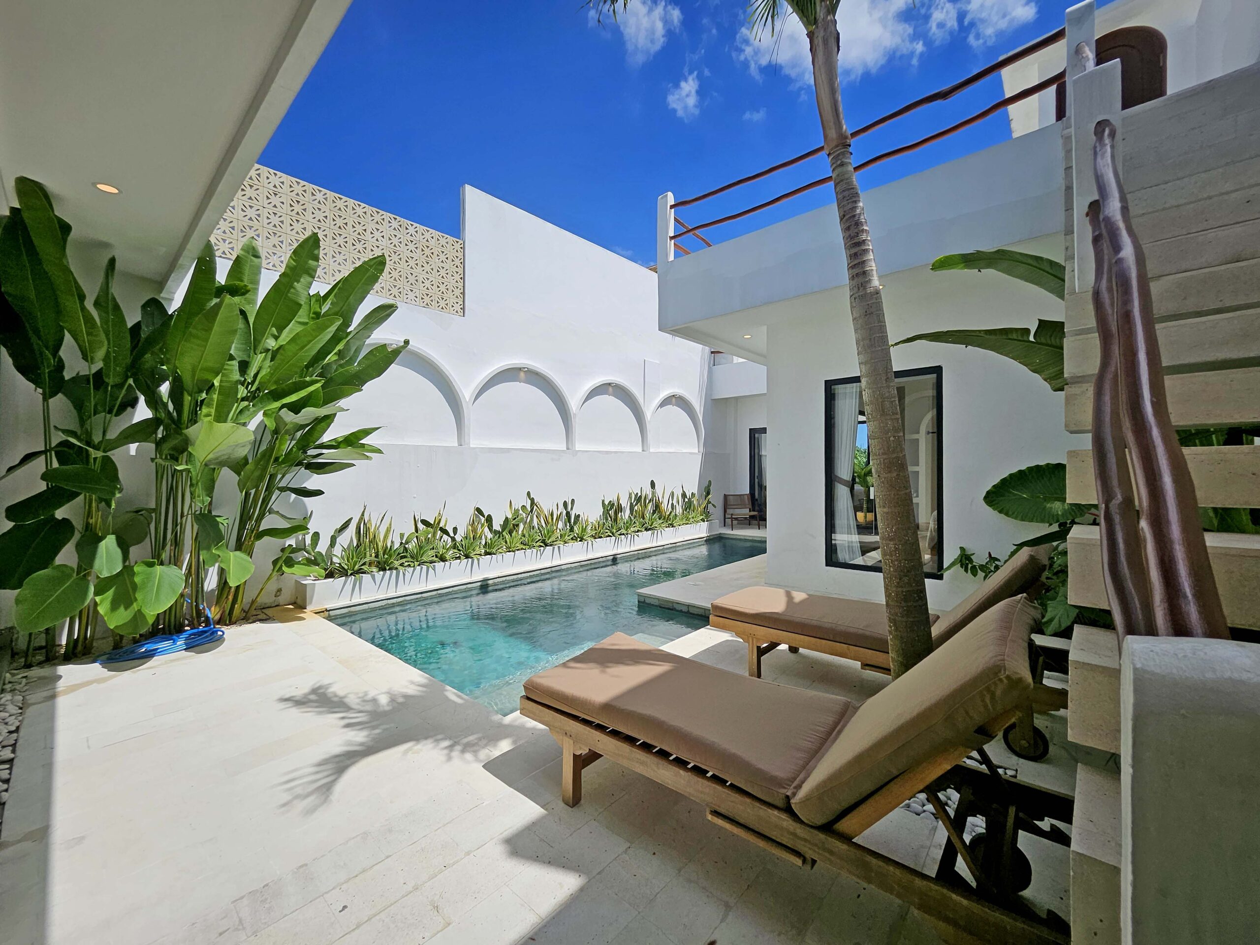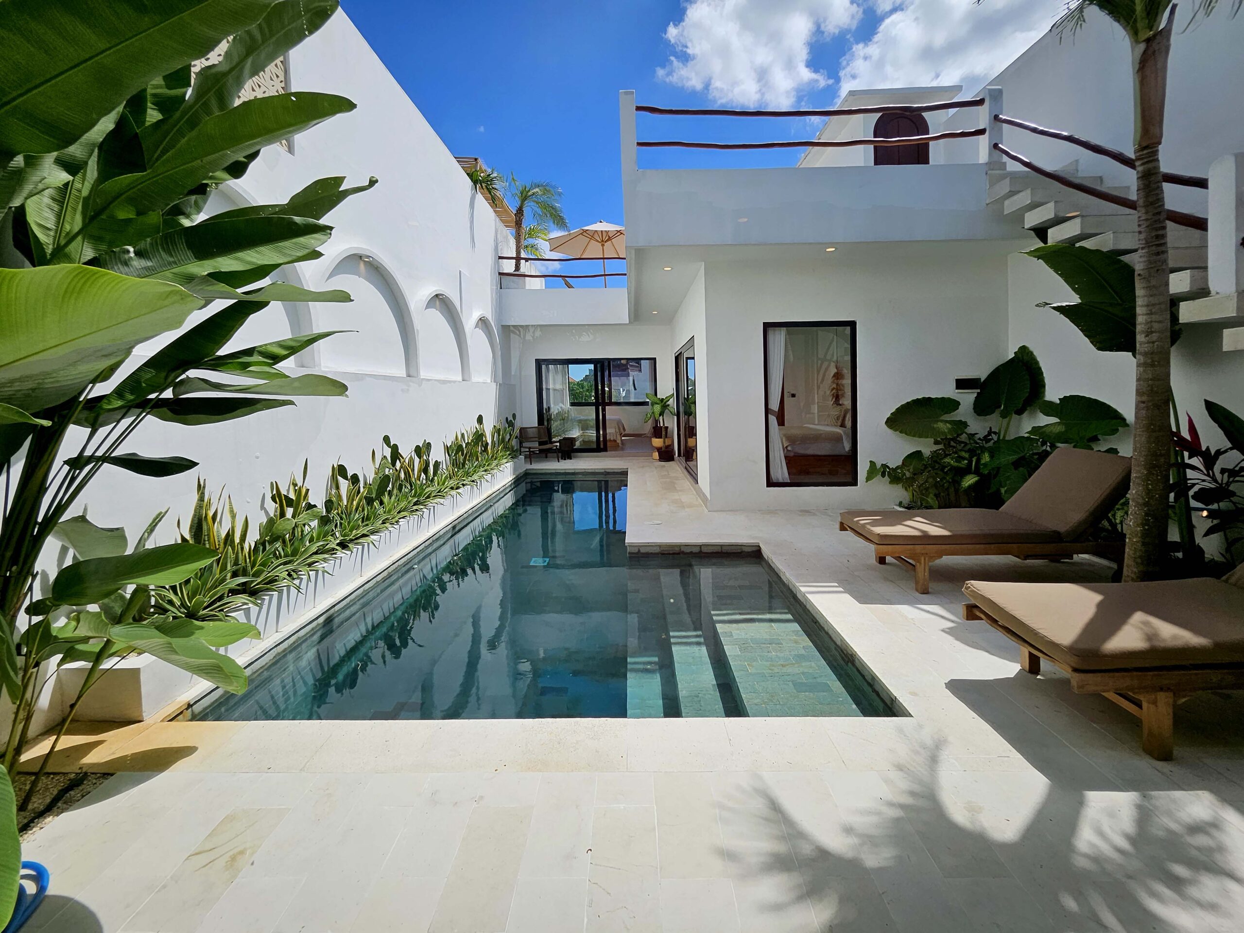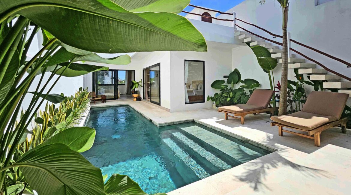 The pool, surrounded by tropical plants and two sun loungers, is perfect for cooling off or relaxing. A beautiful outdoor shower completes the space.