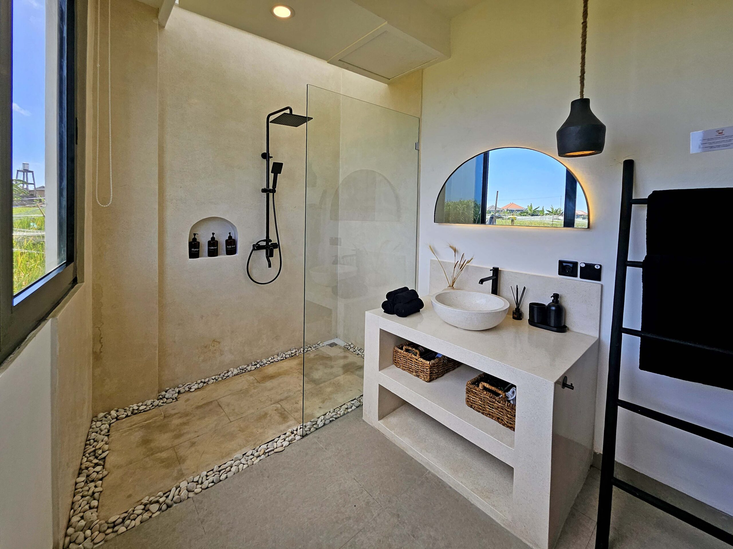 Across from the pool are two air-conditioned bedrooms with King size beds, tastefully decorated, each with its own private bathroom. Their large glass doors open directly onto the pool, and one of them offers a stunning view of the rice fields through a large window.