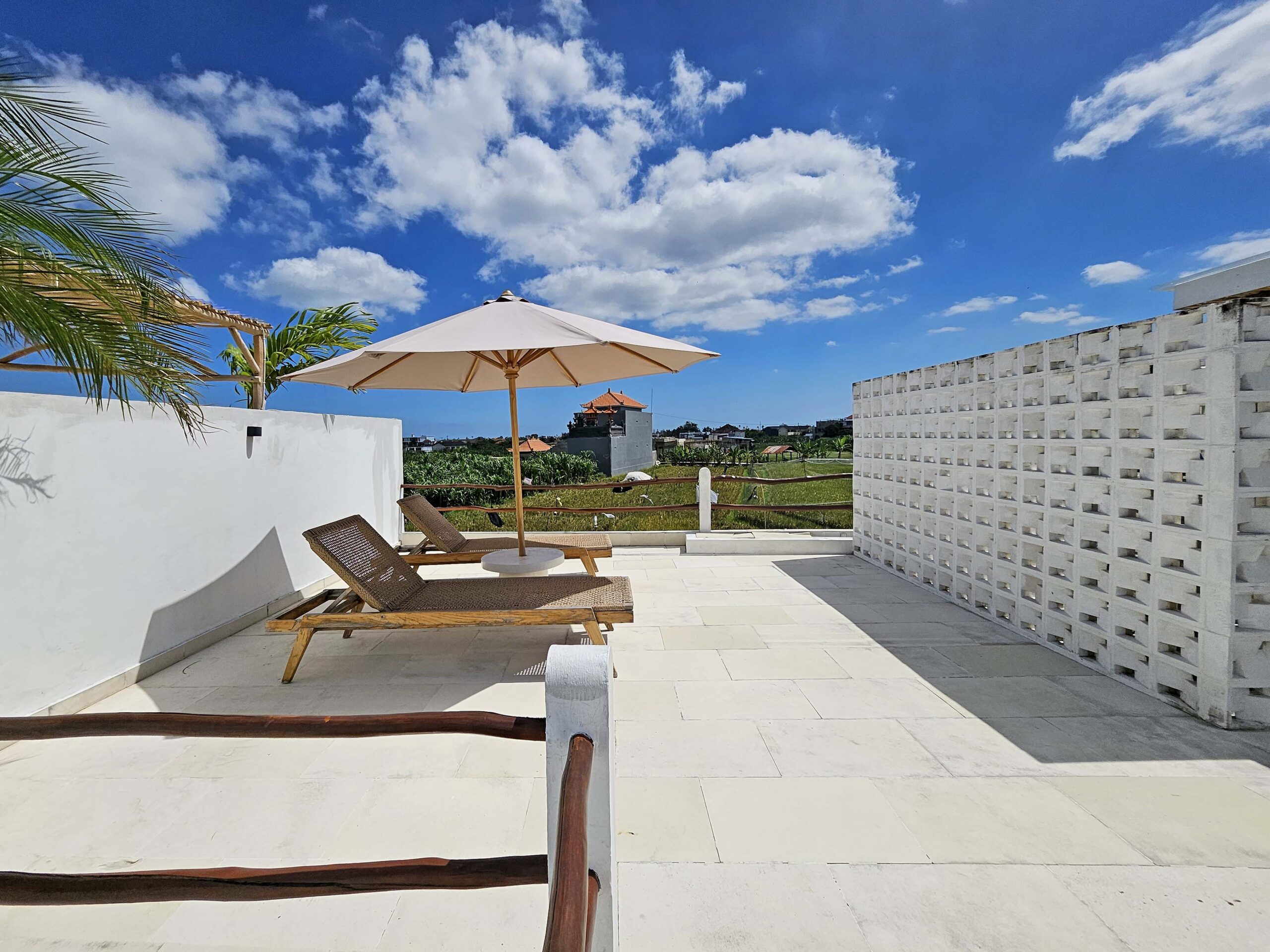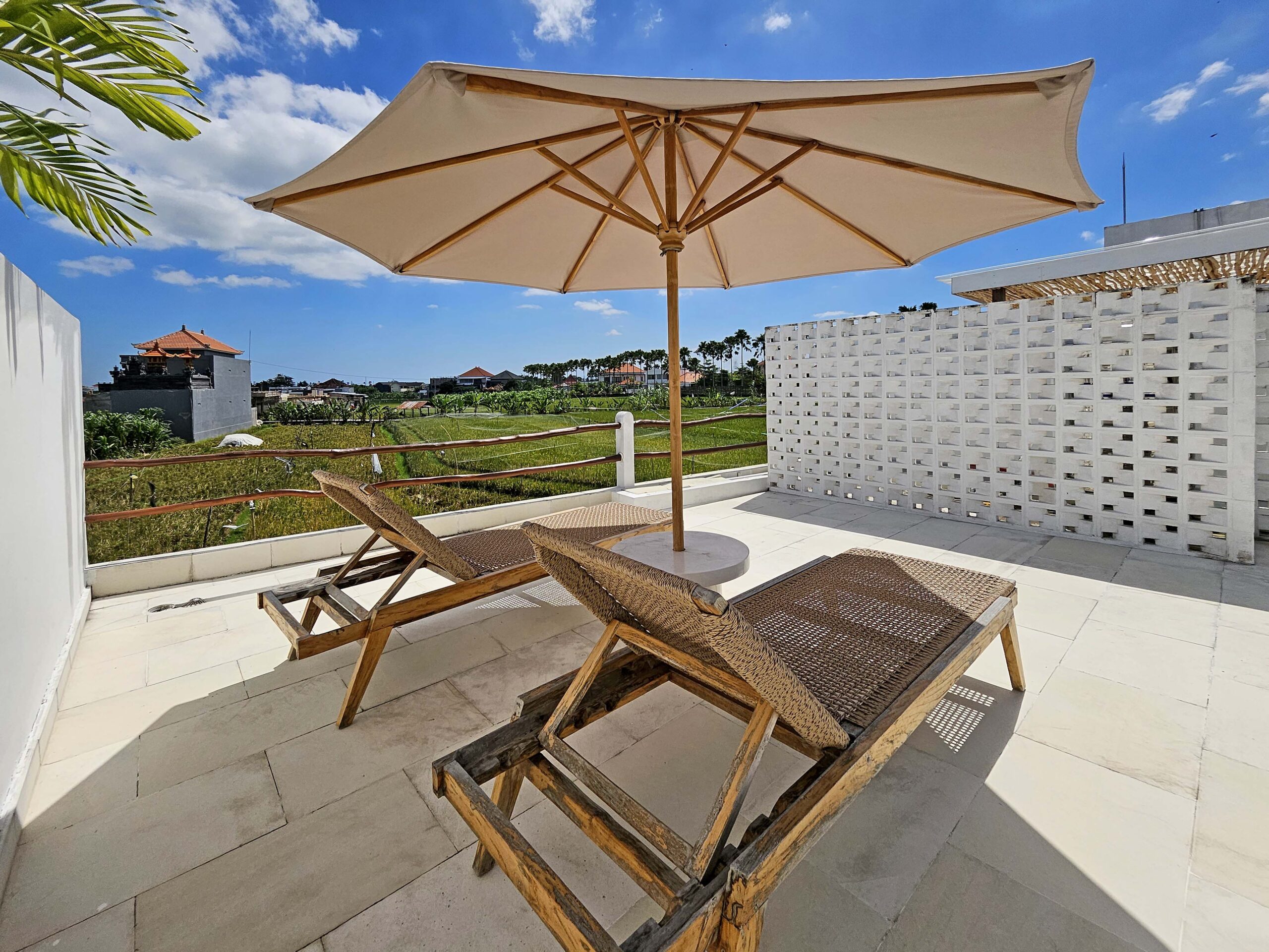 A staircase leads to a spacious rooftop with open views of the rice fields, an ideal spot to unwind at sunset on the loungers.