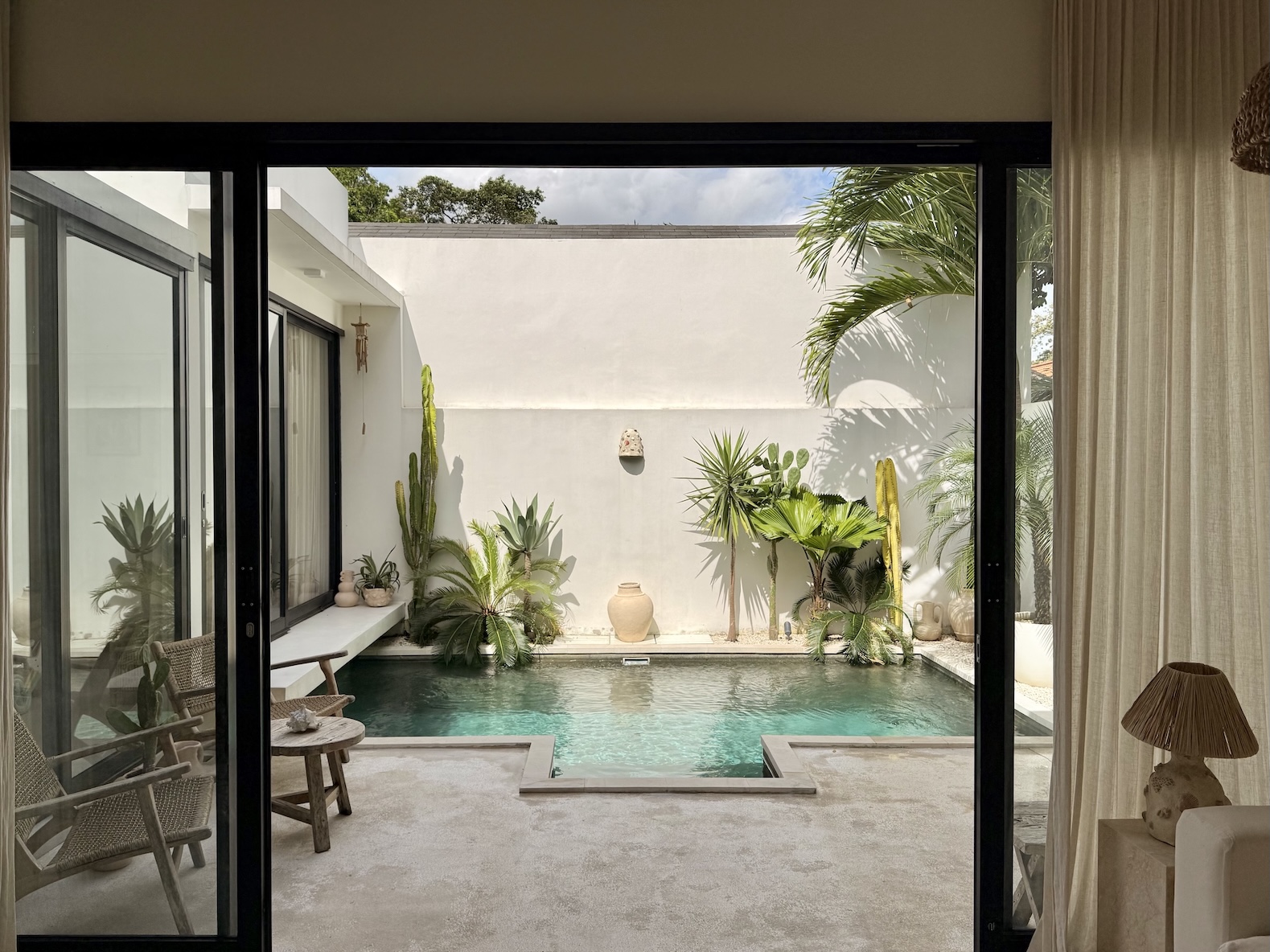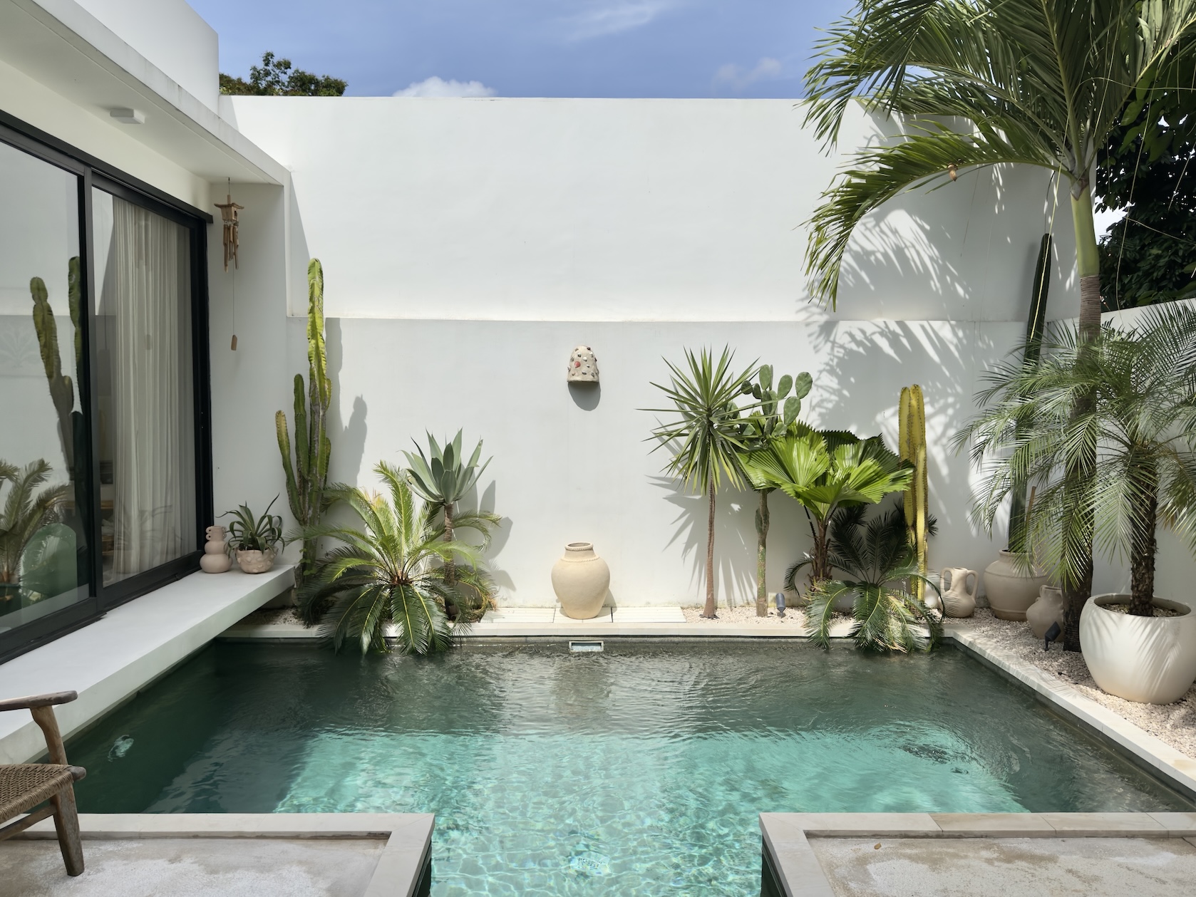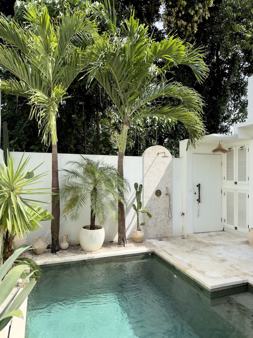 The outdoor area offers a private swimming pool with a clean, minimal aesthetic, complemented by a small lounge space perfect for relaxing. A rare bonus is the outdoor shower with hot water, enhancing the tropical living experience.