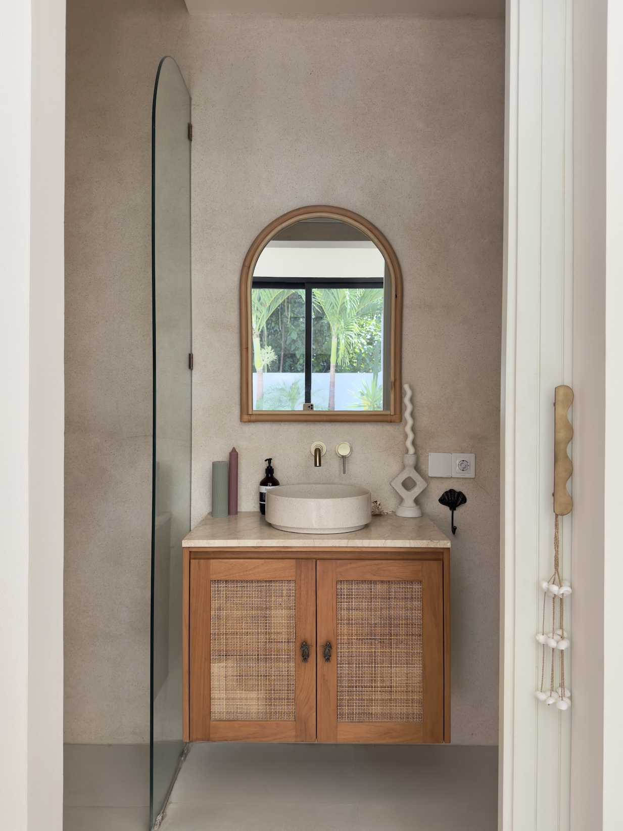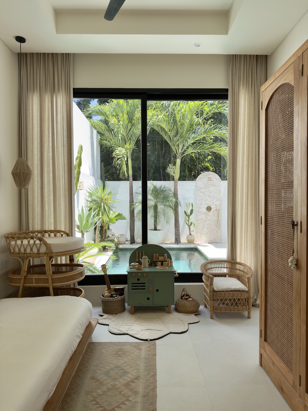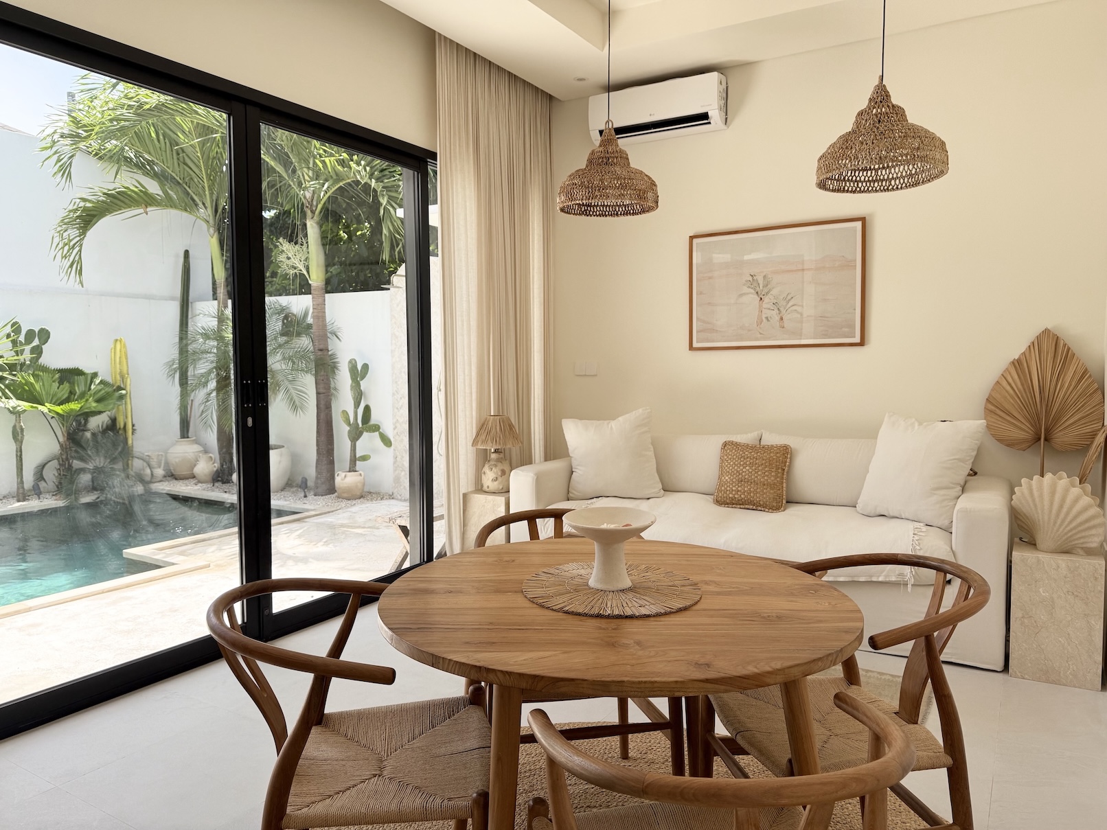 The outdoor area offers a private swimming pool with a clean, minimal aesthetic, complemented by a small lounge space perfect for relaxing. A rare bonus is the outdoor shower with hot water, enhancing the tropical living experience.