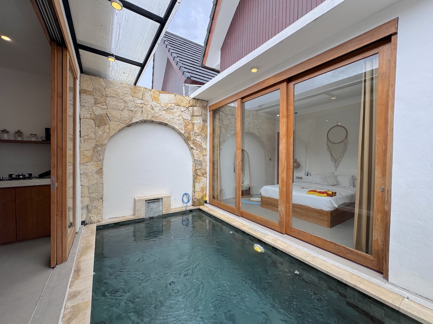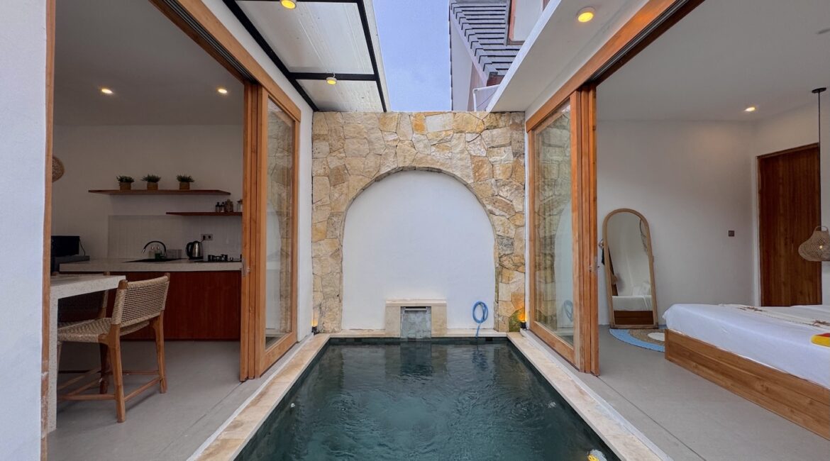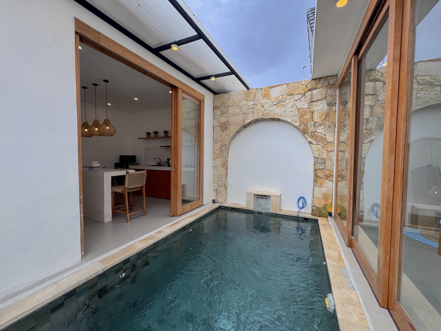 Built on 100 m² of land with an 89 m² build, the villa features two ensuite bedrooms, a fully enclosed living and kitchen area, and a private plunge pool framed by stonework and wooden accents (see photo). The layout offers a cozy yet functional flow between indoor comfort and outdoor relaxation.