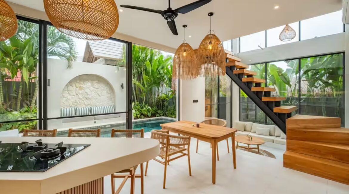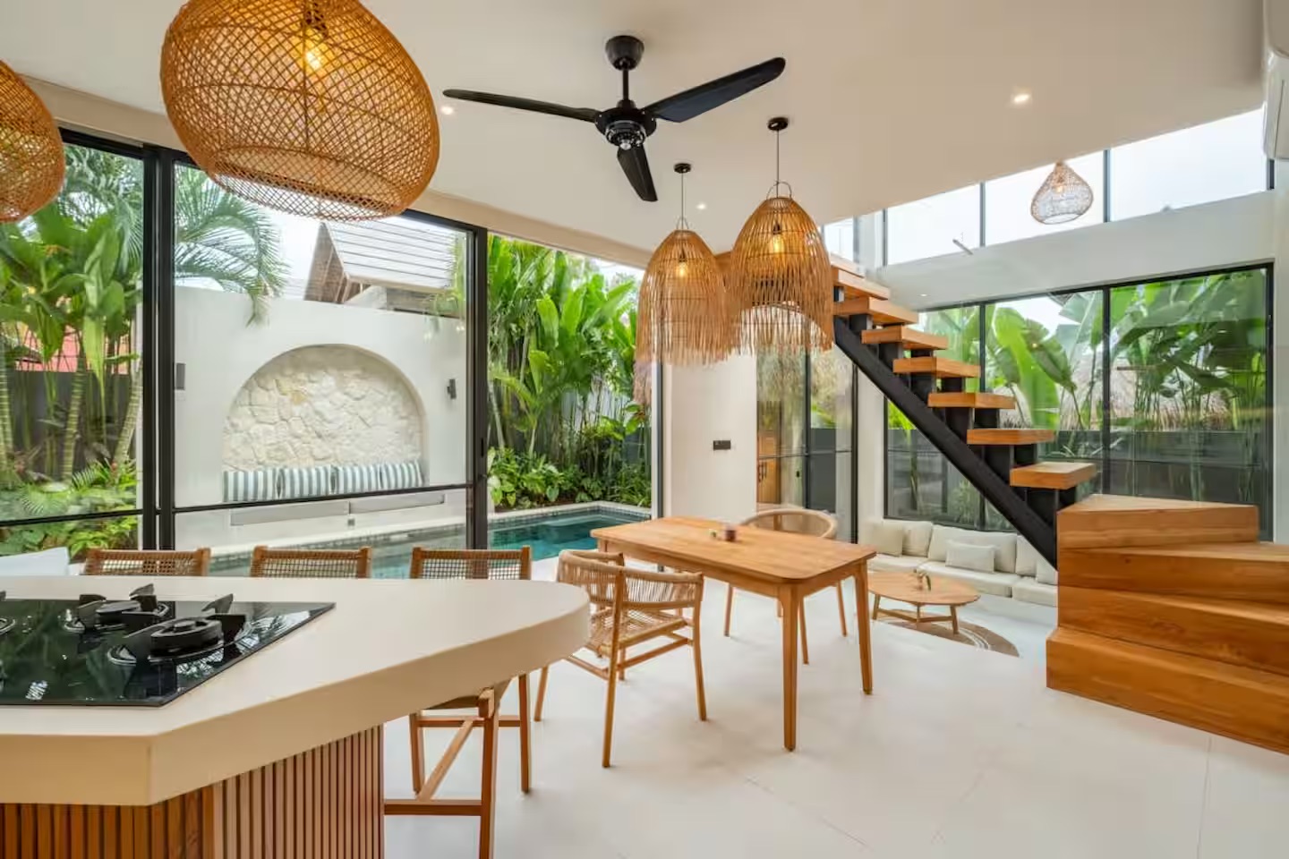 Set on 166 m² of land (1.66 Are) with an impressive 200 m² two-level build, this villa has been designed with space and livability in mind. The ground floor features a fully enclosed living and dining area, paired with a sleek modern kitchen, while floor-to-ceiling sliding glass doors open to the private swimming pool and outdoor lounge, creating a seamless indoor–outdoor flow.