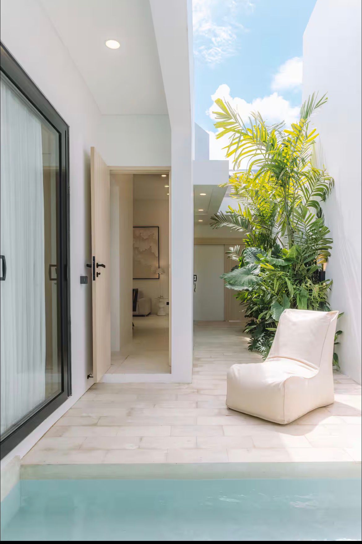 Large openings allow natural light to flow through the interior while maintaining a connection to the outdoor space. The villa includes 1 bedroom and 1 bathroom, offering a private and low maintenance setup perfect for individuals or couples.