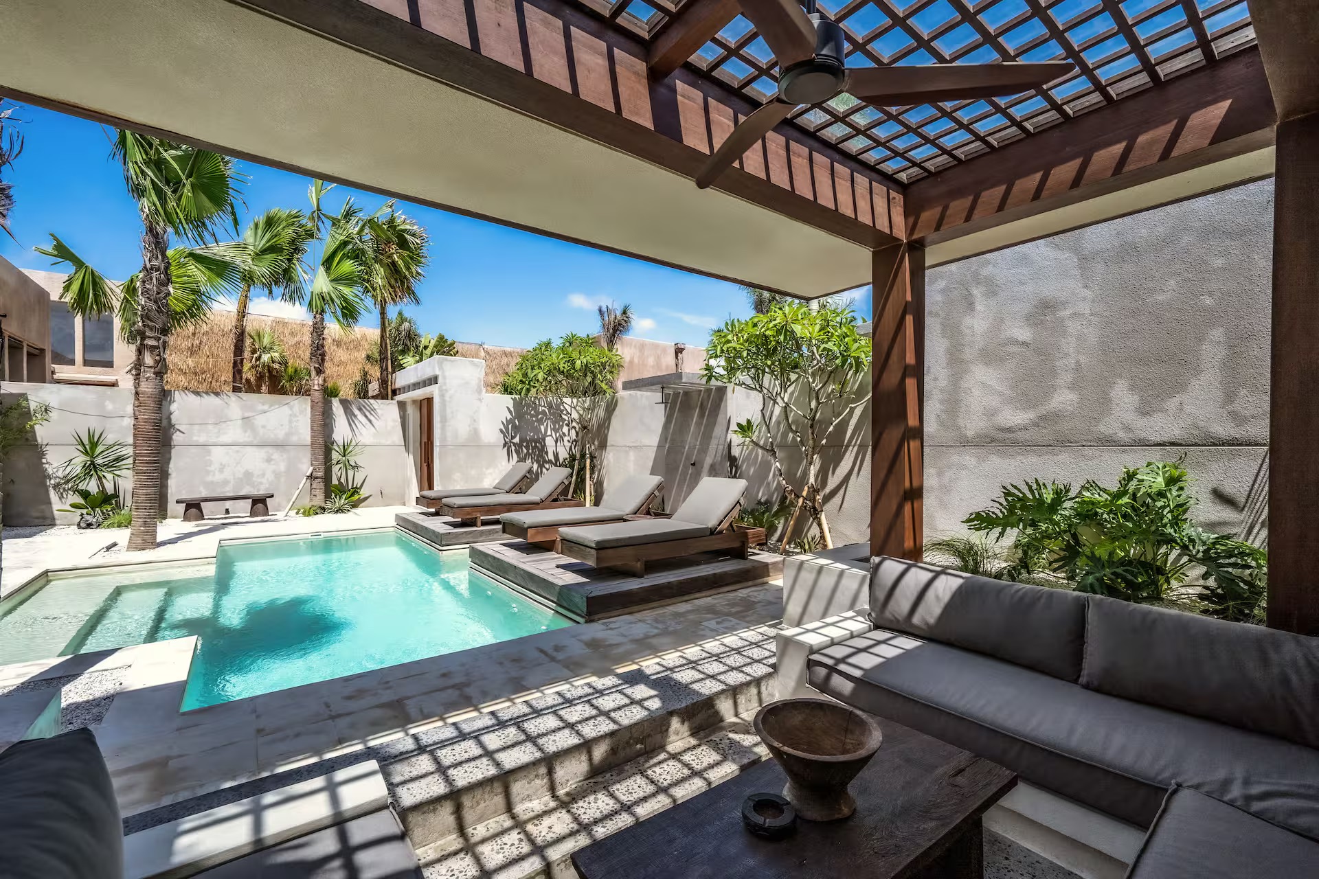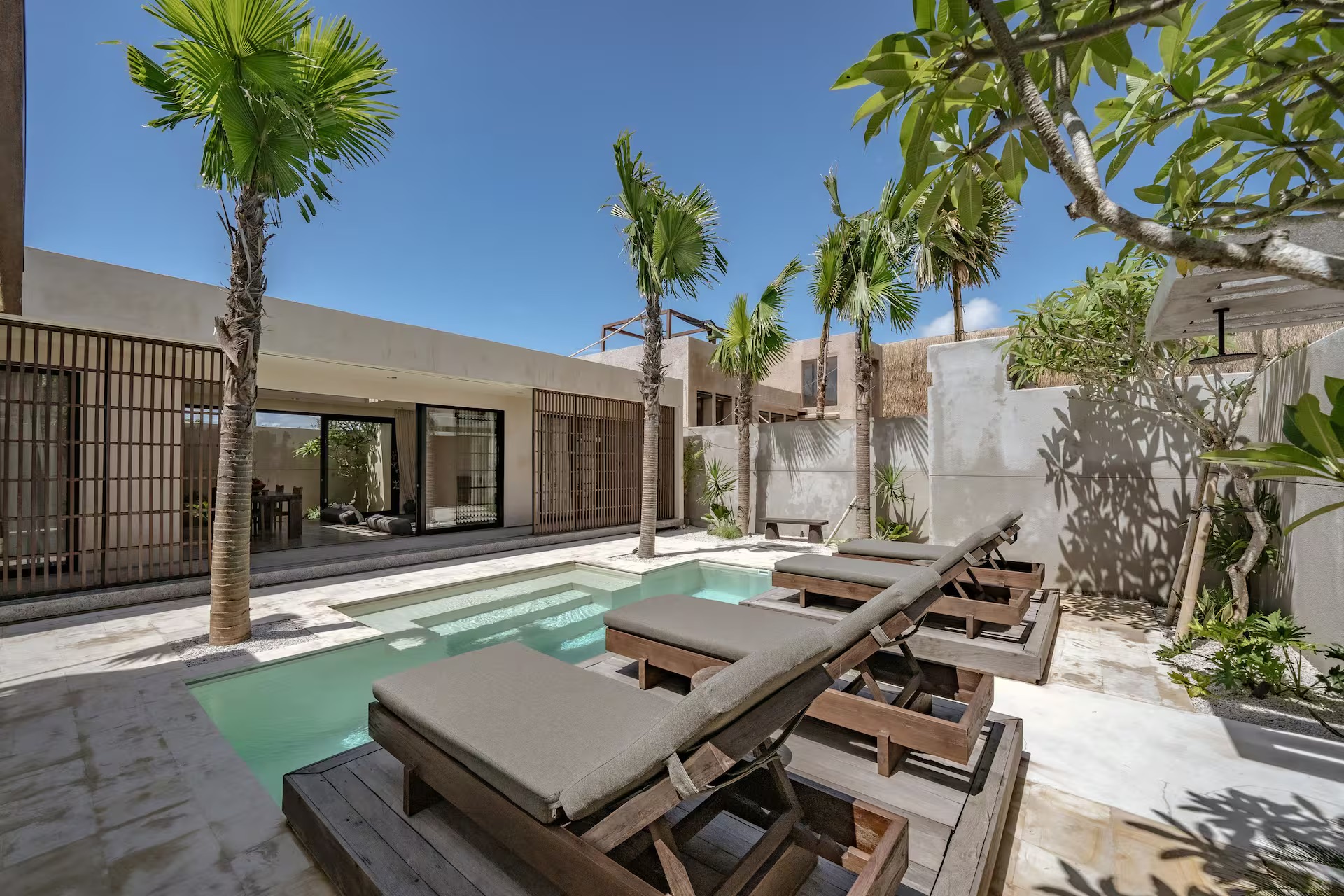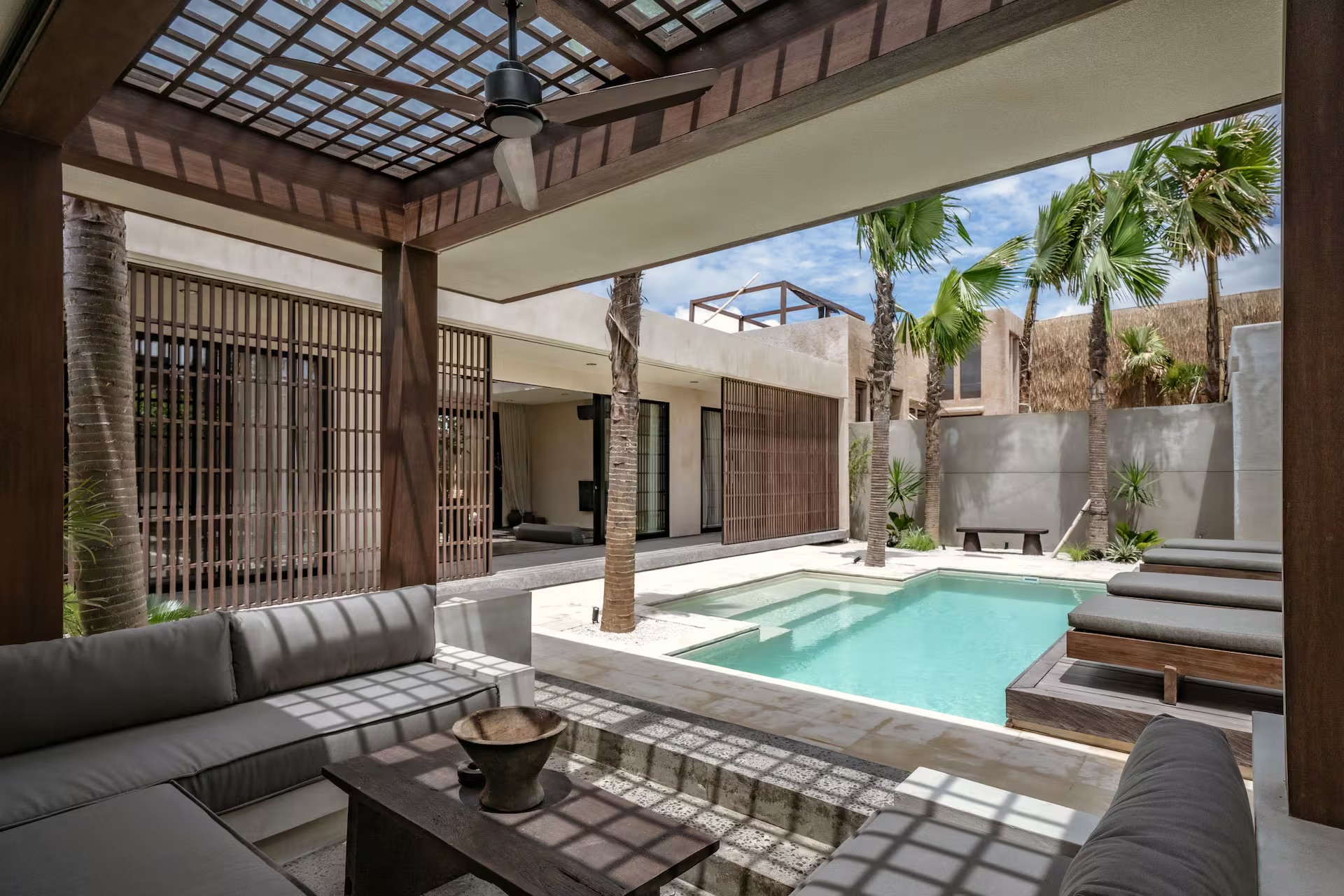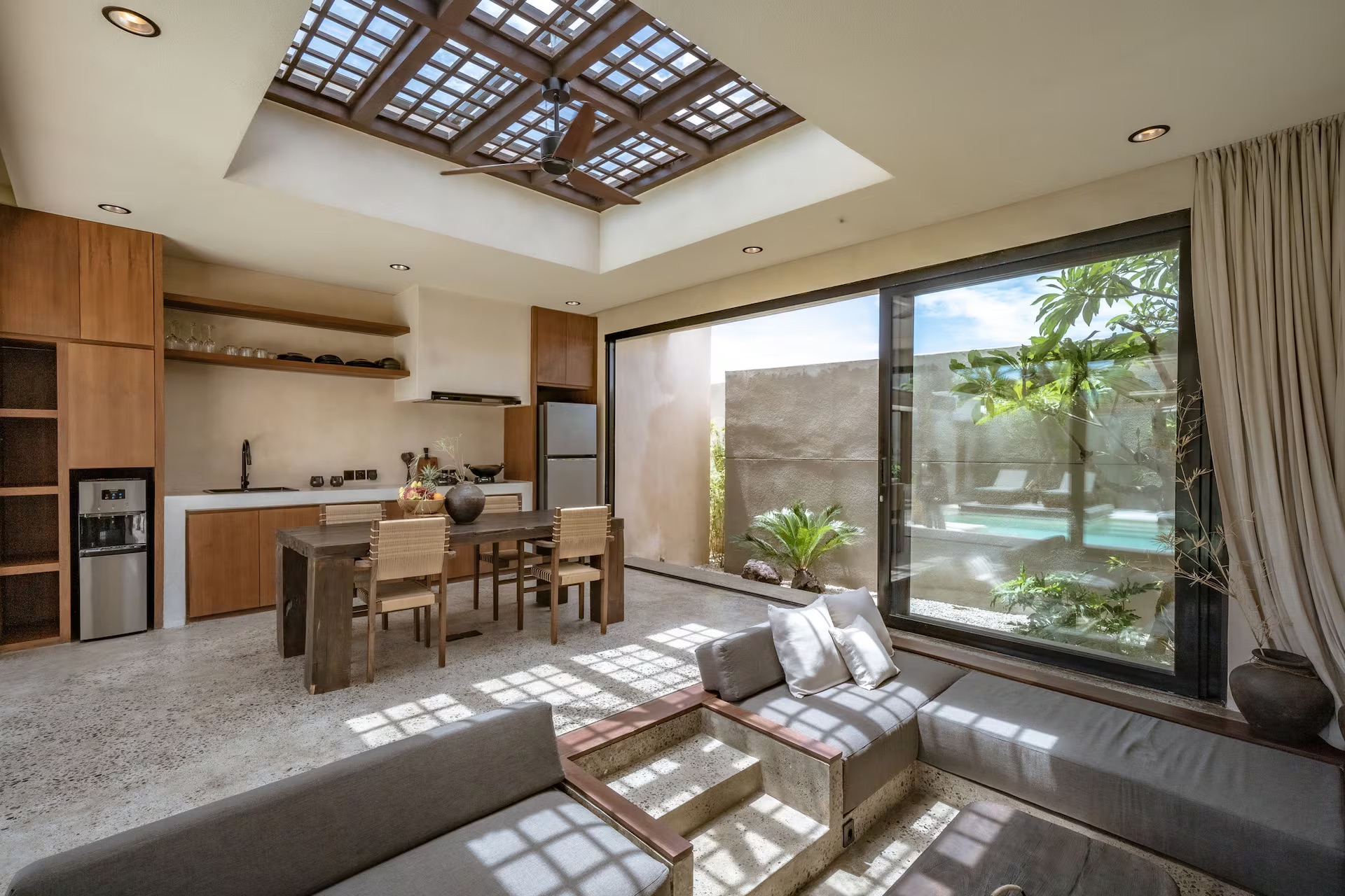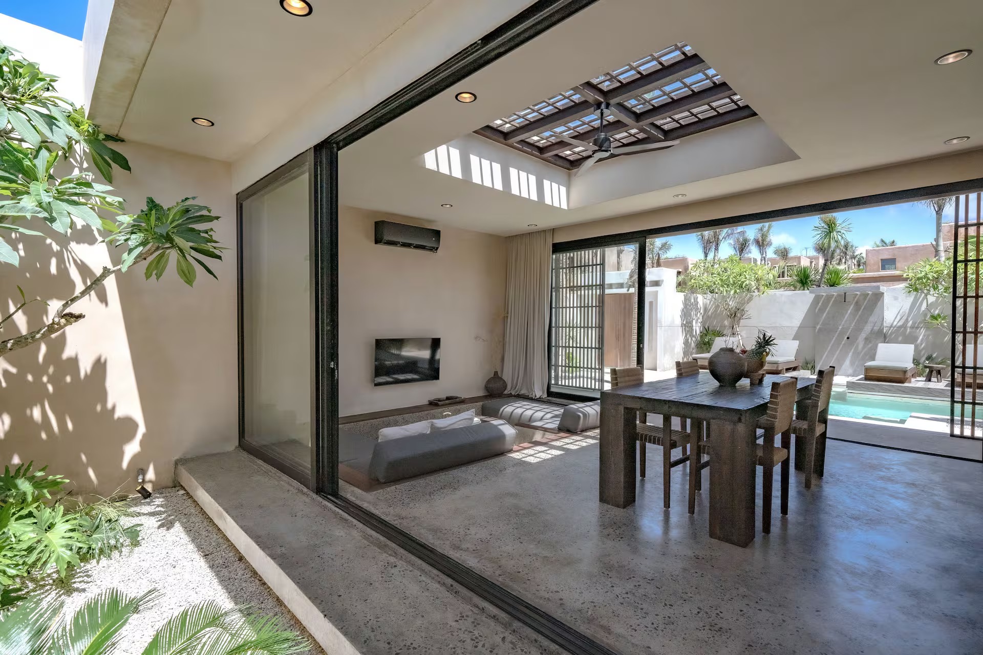 The villa features 2 bedrooms and 2 bathrooms, with enclosed kitchen, living, and dining areas that provide comfort and year-round usability. Large sliding doors open onto the pool area, allowing natural light to flow throughout the space while maintaining a seamless indoor–outdoor connection.