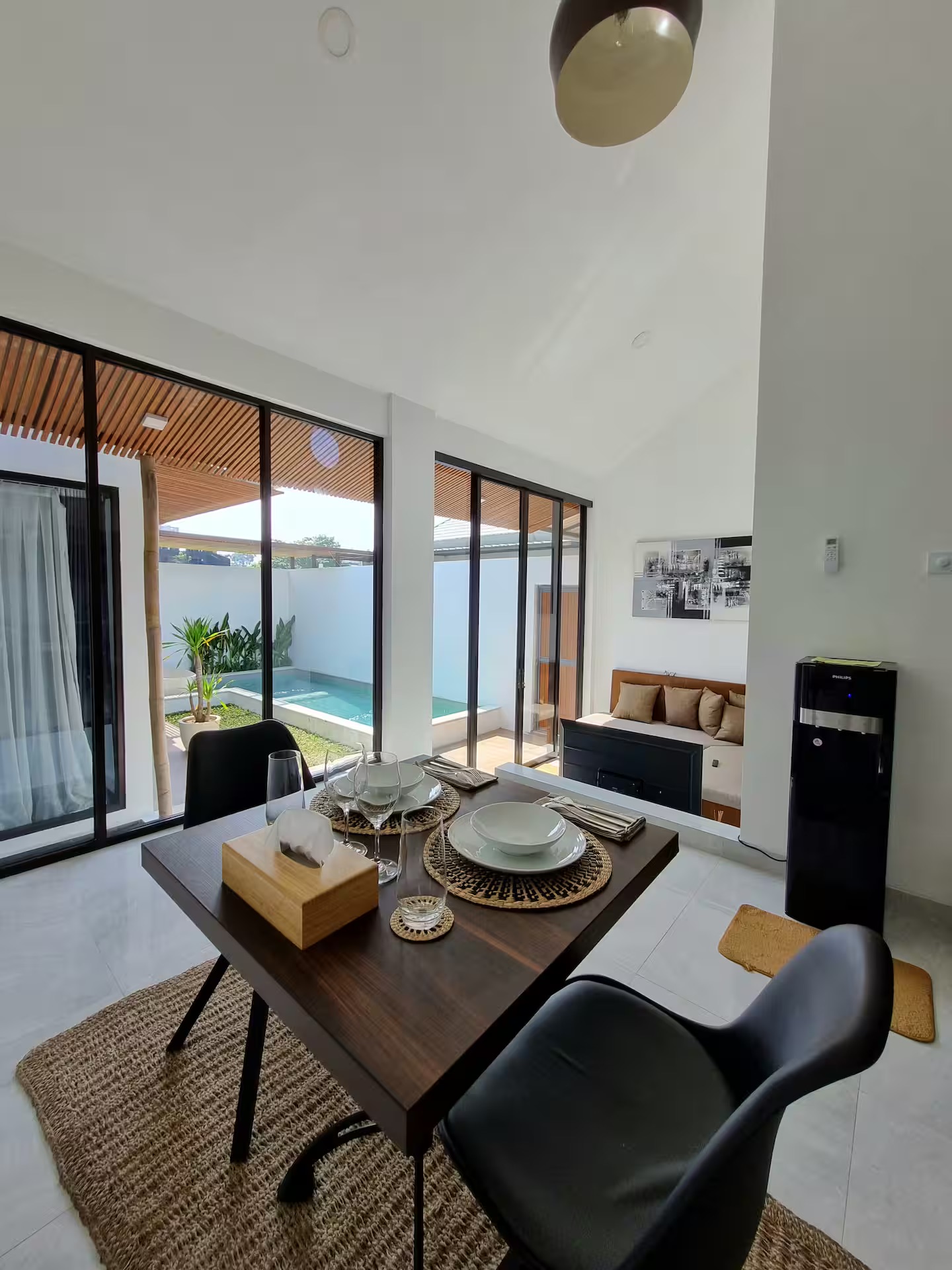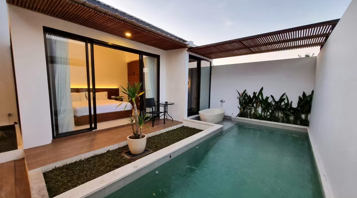 Built in 2022, each villa sits on 80–100m² of land with a 120m² building size, featuring a spacious enclosed living, dining, and kitchen area. The bedroom opens directly to the private swimming pool, surrounded by minimalist tropical landscaping for a calm and relaxing atmosphere.