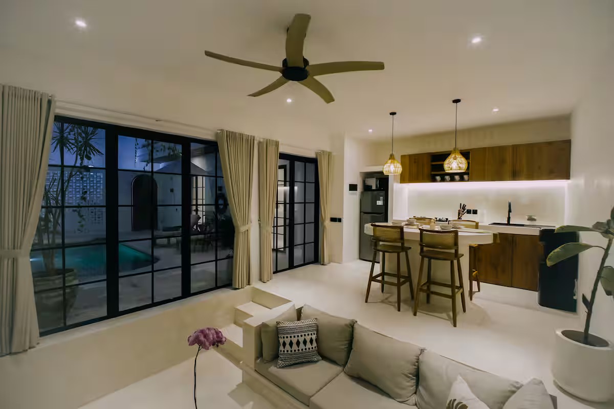 Set on 150 m² of land with 95 m² of living space, the villa features a clean and elegant layout centered around a private swimming pool. The enclosed kitchen, living, and dining areas provide year-round comfort, while large glass doors open directly to the pool terrace, creating a seamless indoor–outdoor flow with a relaxed tropical atmosphere.