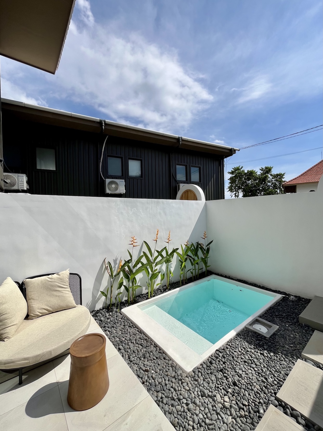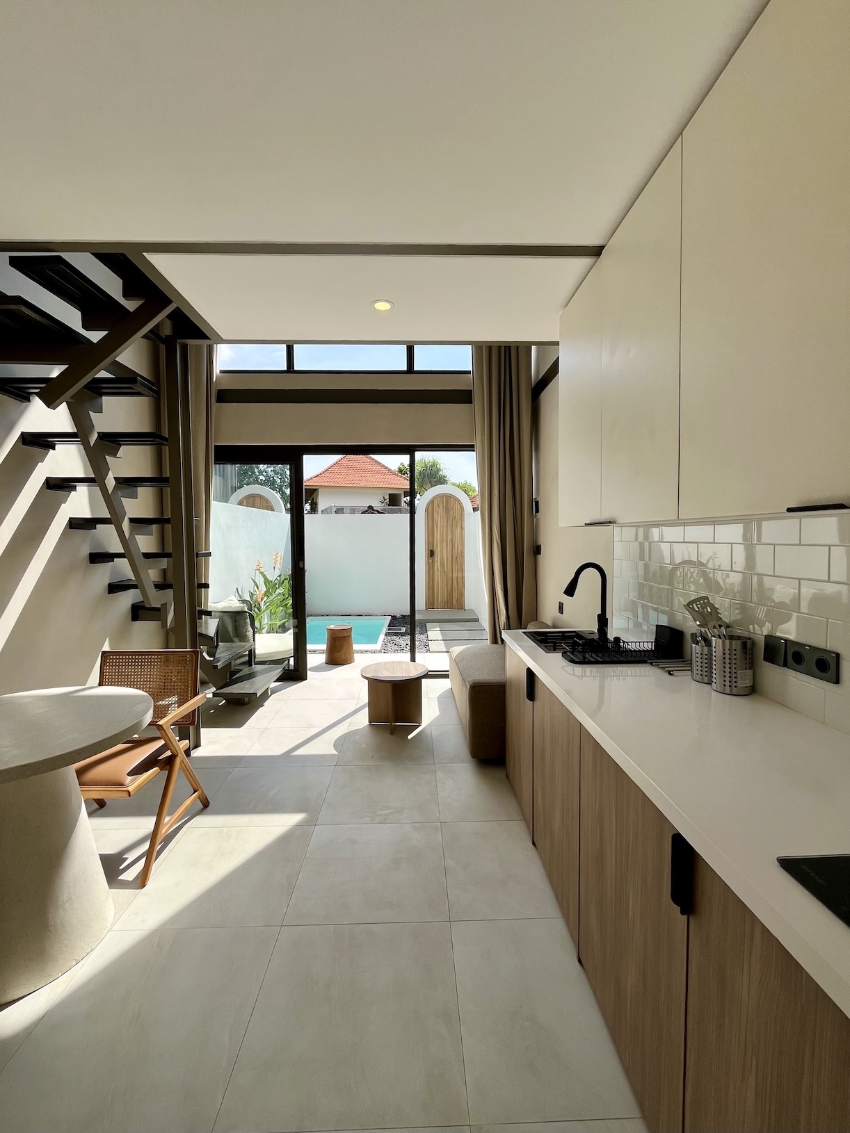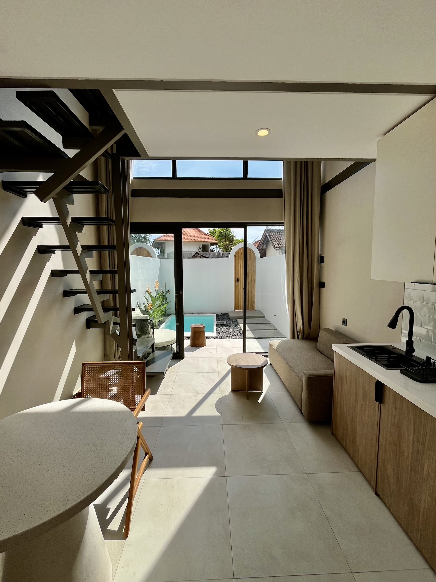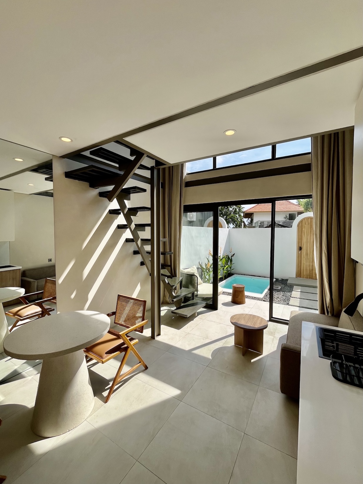 Set on a compact 35 m² land plot with 32 m² of built space, the villa maximizes every square meter through a smart vertical layout. The ground floor features enclosed living, dining, and kitchen areas opening directly onto a private plunge pool, while the upper level hosts a comfortable bedroom with natural light and privacy.