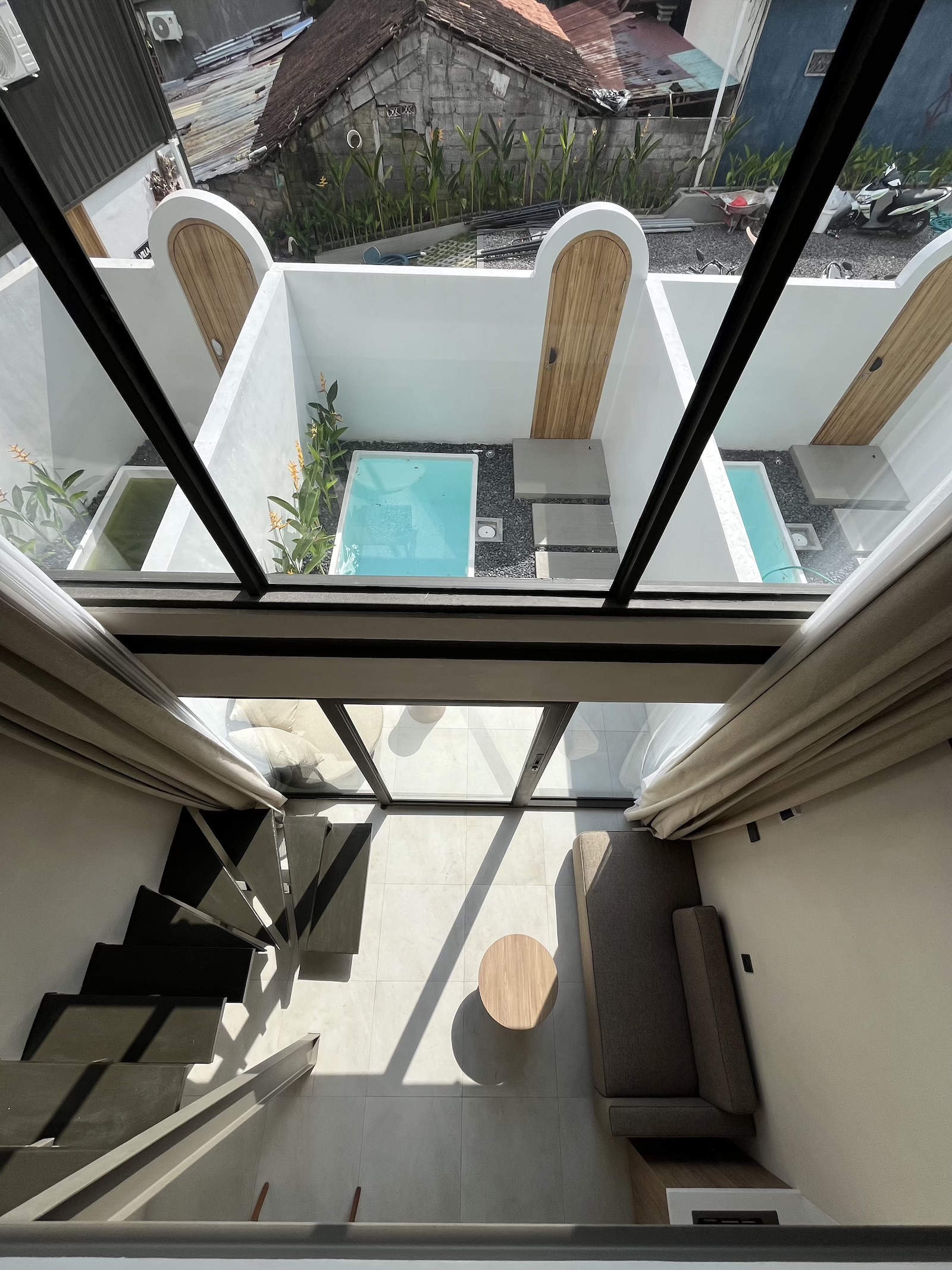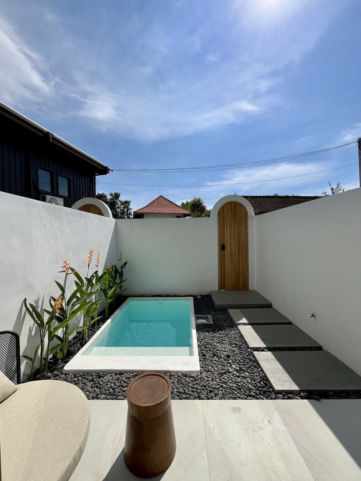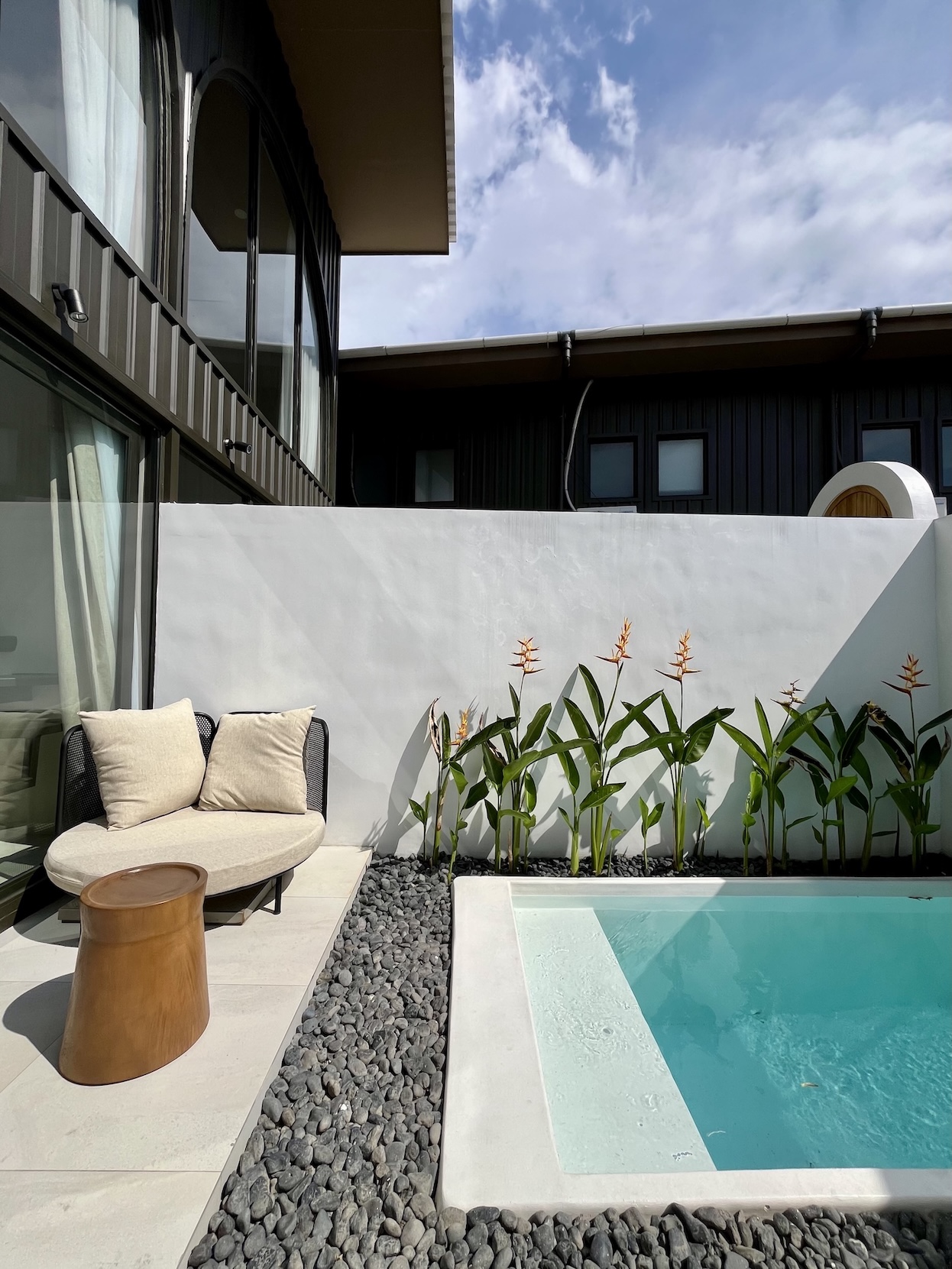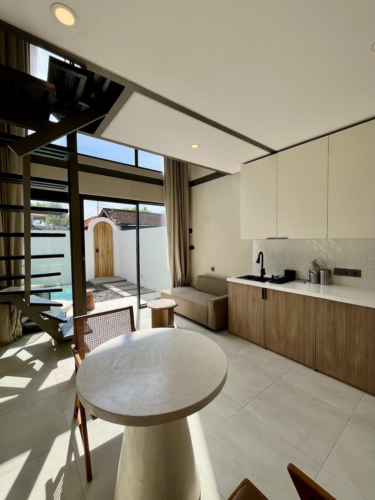 Set on a compact 35 m² land plot with 32 m² of built space, the villa maximizes every square meter through a smart vertical layout. The ground floor features enclosed living, dining, and kitchen areas opening directly onto a private plunge pool, while the upper level hosts a comfortable bedroom with natural light and privacy.