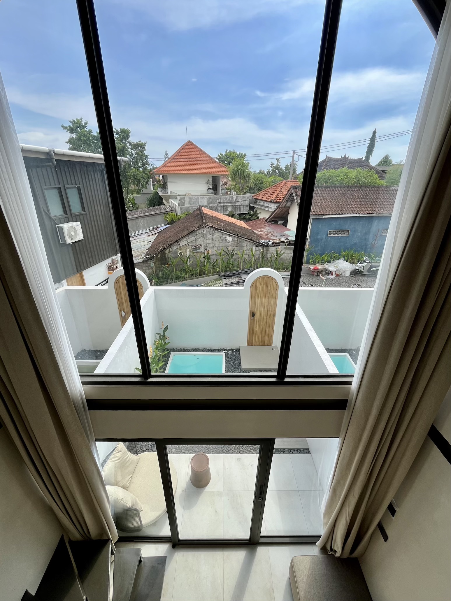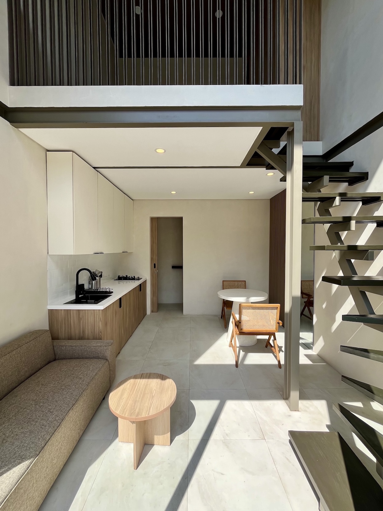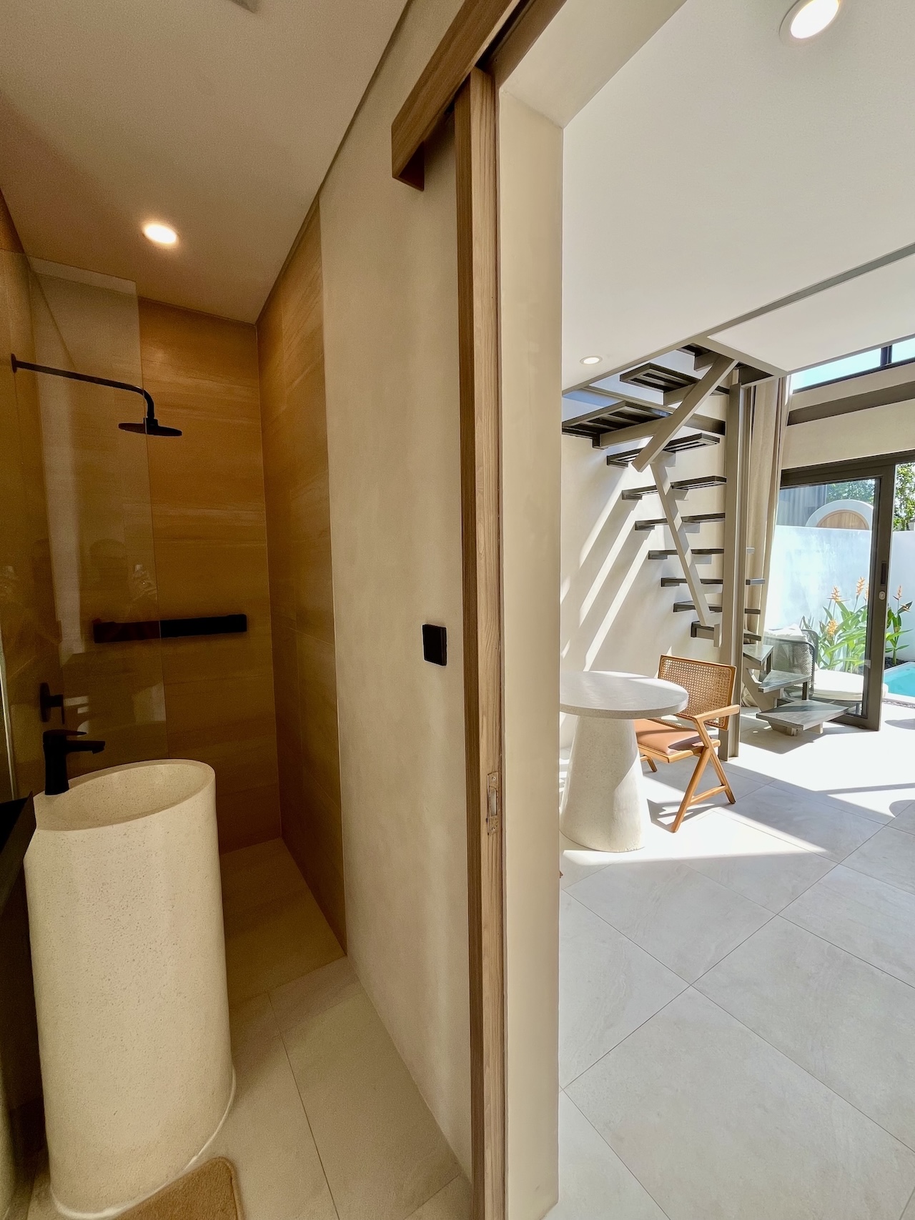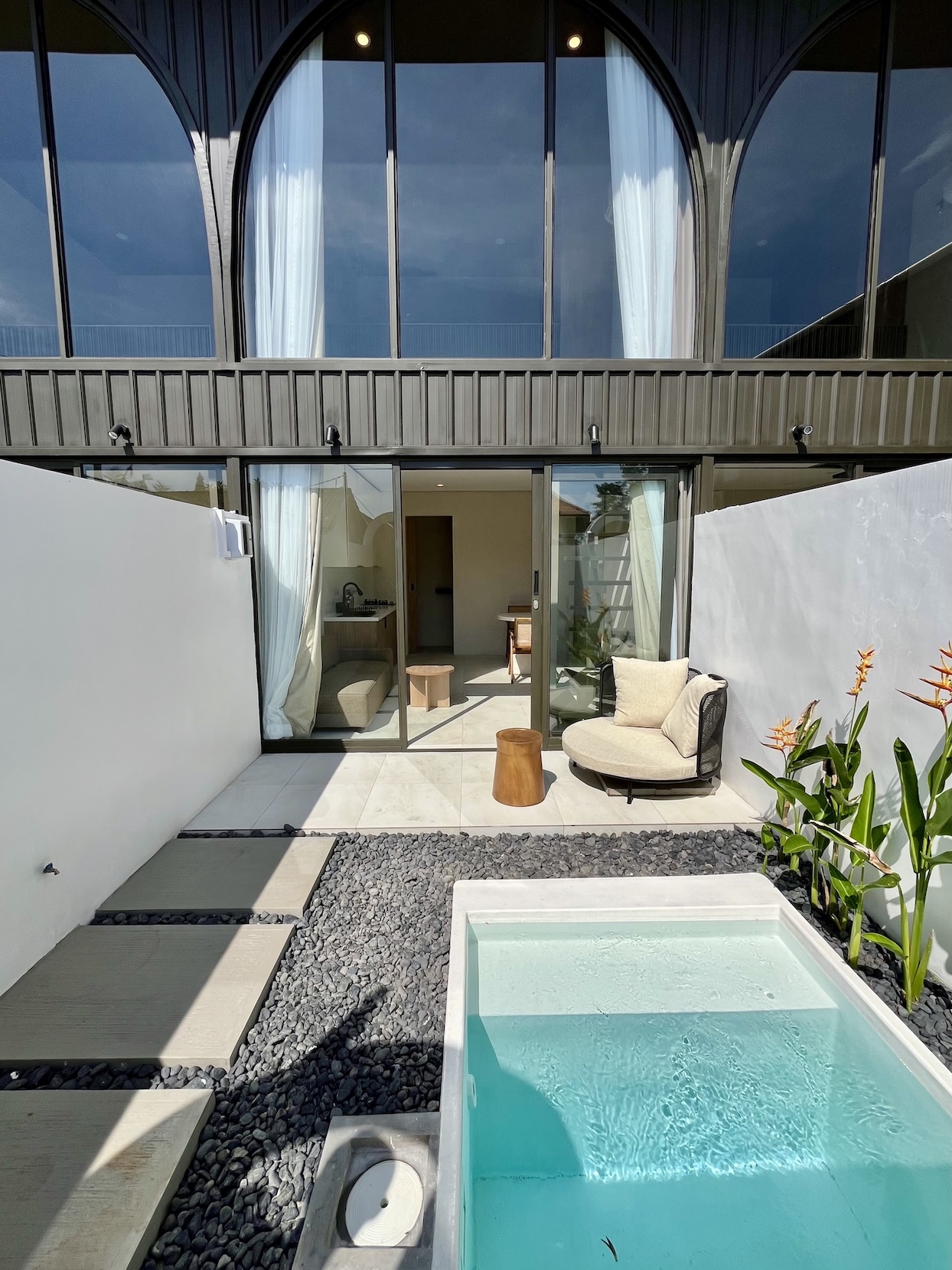 Set on a compact 35 m² land plot with 32 m² of built space, the villa maximizes every square meter through a smart vertical layout. The ground floor features enclosed living, dining, and kitchen areas opening directly onto a private plunge pool, while the upper level hosts a comfortable bedroom with natural light and privacy.