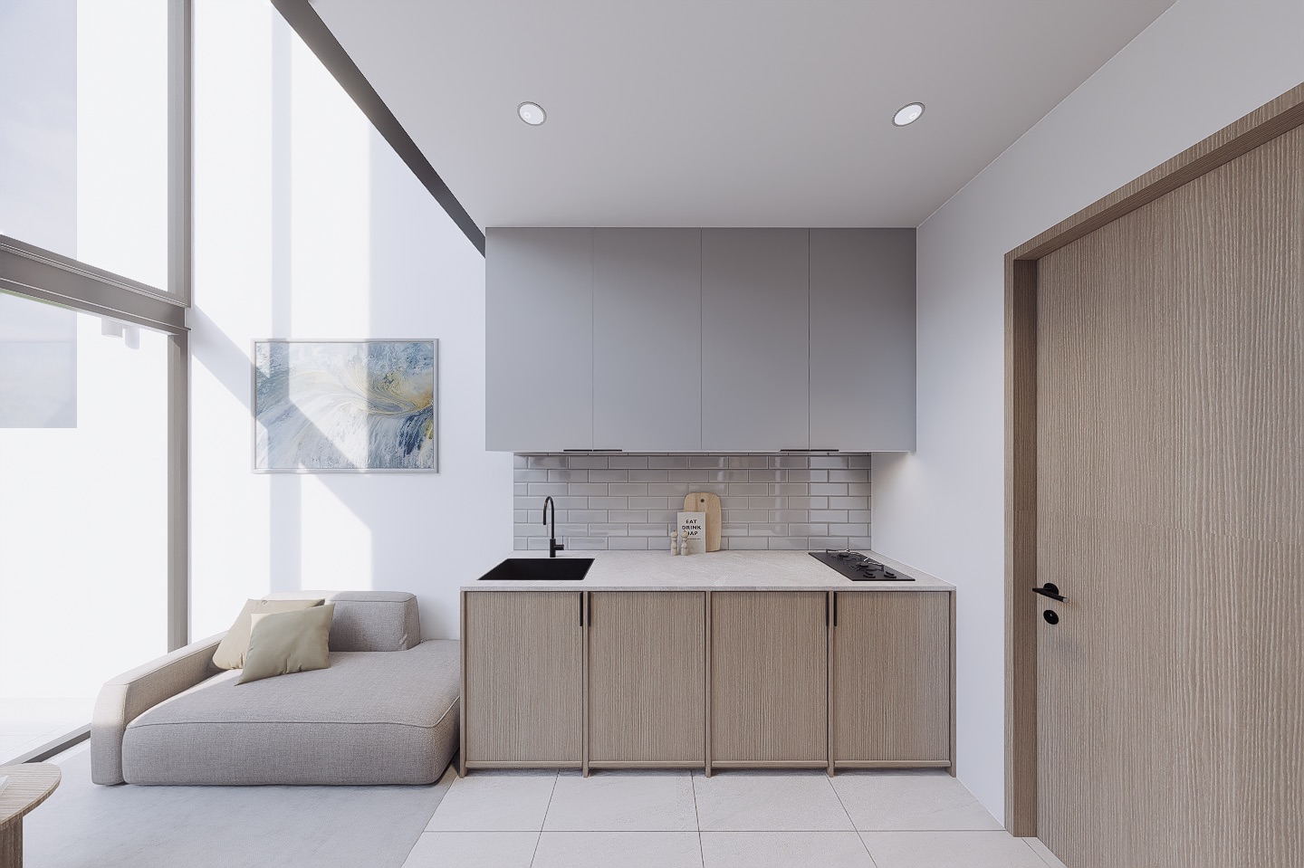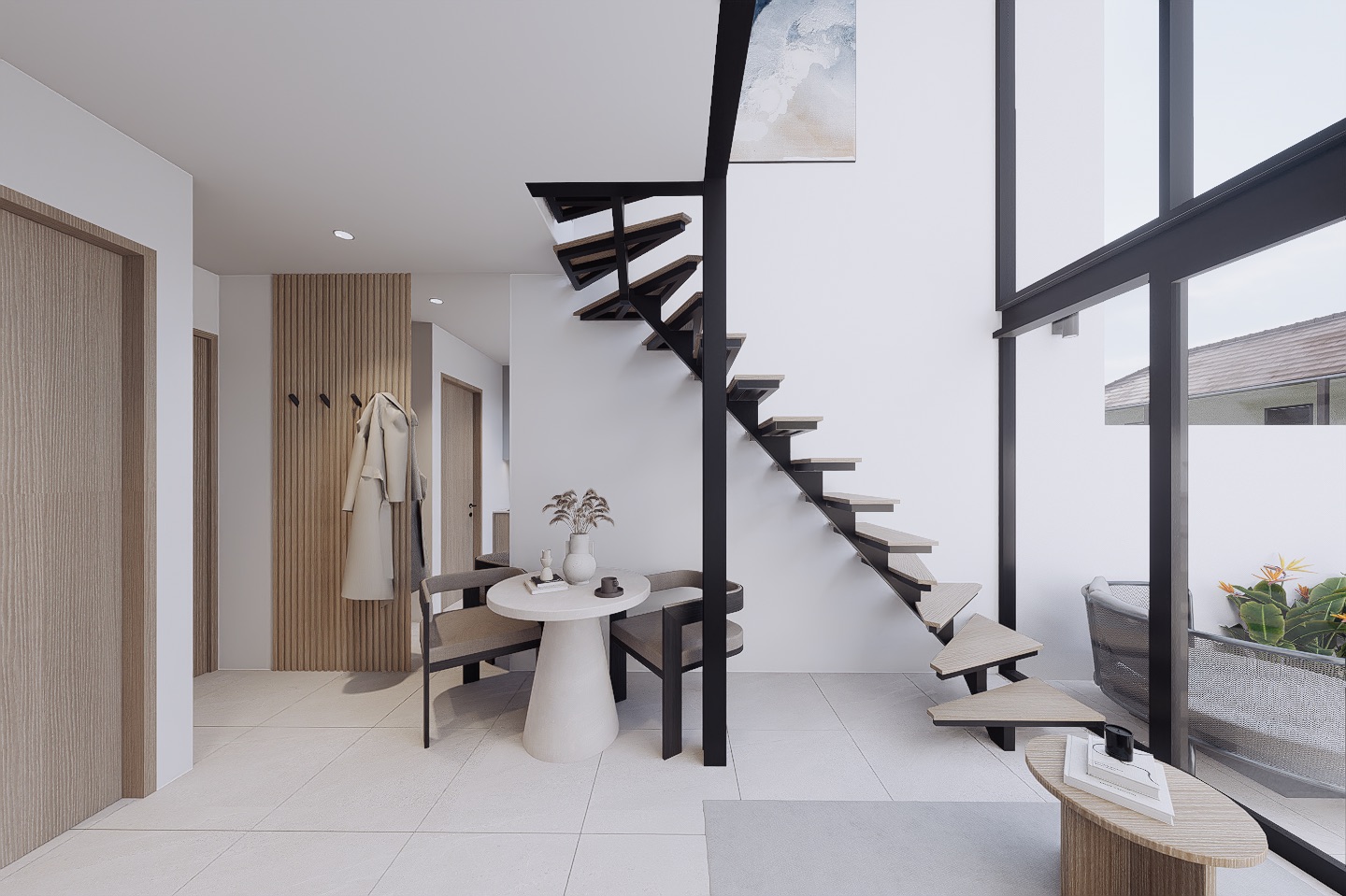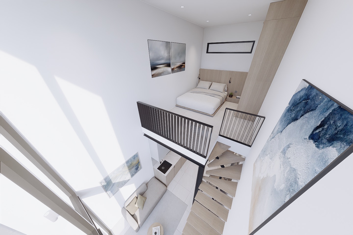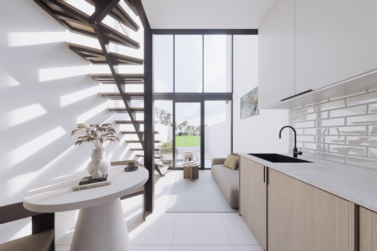 Construction begins in February 2026 and is scheduled for completion in January 2027. Each unit features a two-level layout on 35 m² of land with 32 m² of functional living space, maximizing efficiency while maintaining a clean, contemporary loft aesthetic.