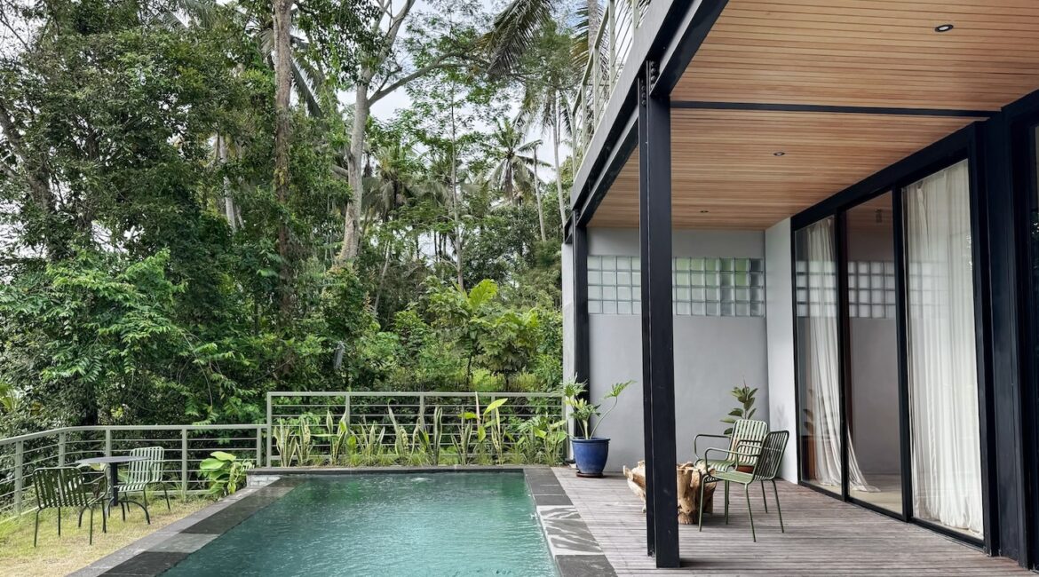 Designed for both comfort and income potential, the villa features an efficient layout across two levels, combining enclosed living spaces with generous outdoor areas. Large glass openings frame the surrounding jungle and allow natural light to flood the interiors, creating a seamless indoor–outdoor feel and a relaxed tropical atmosphere.