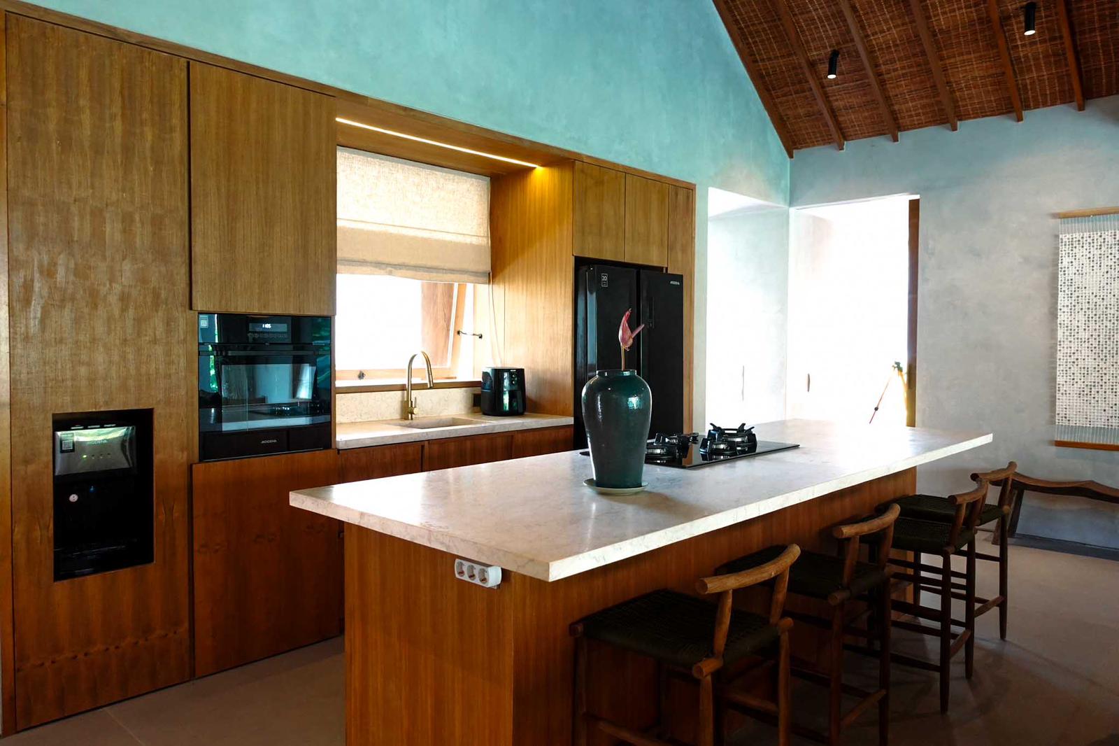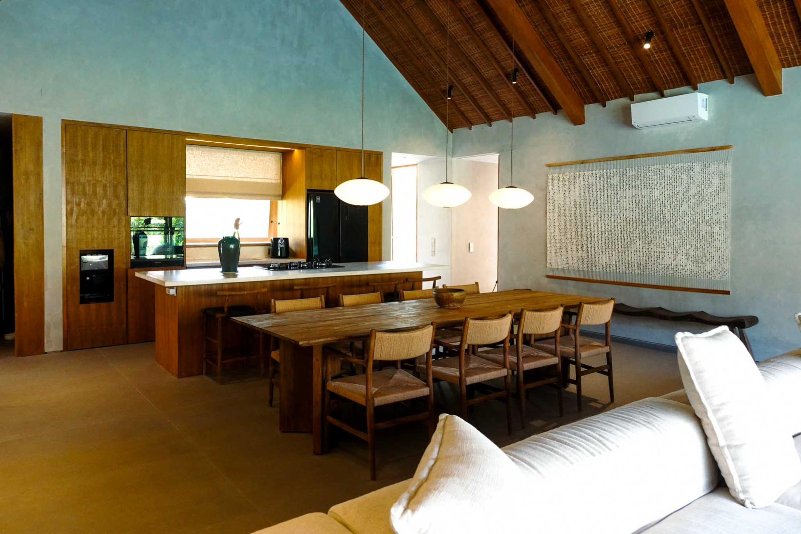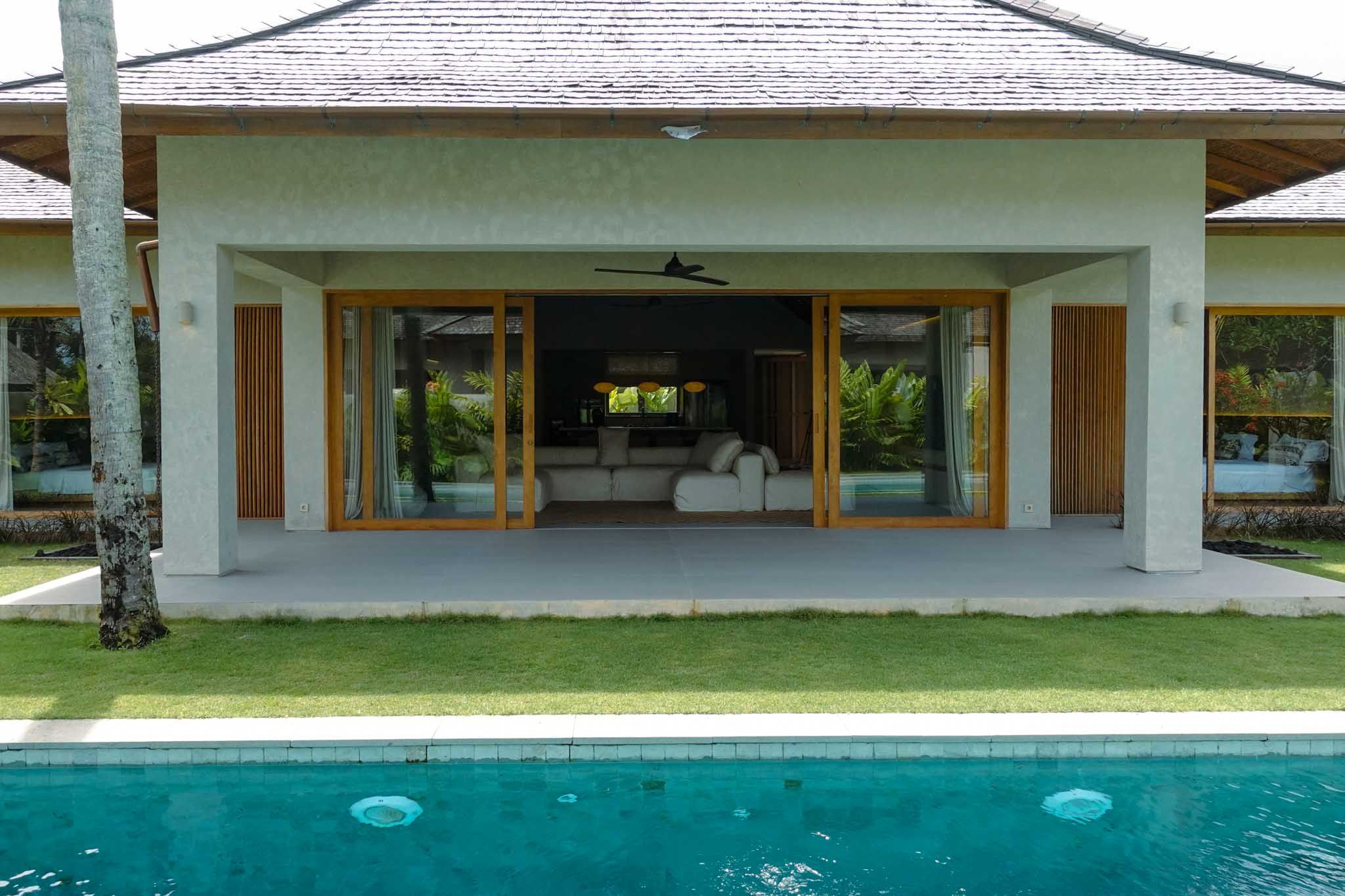 The villa features 4 spacious bedrooms and 4.5 bathrooms, with fully enclosed living, dining, and kitchen areas that provide comfort while still maintaining a strong connection to the outdoor space. The large glass openings allow natural light to flood the interiors, enhancing the tropical feel.