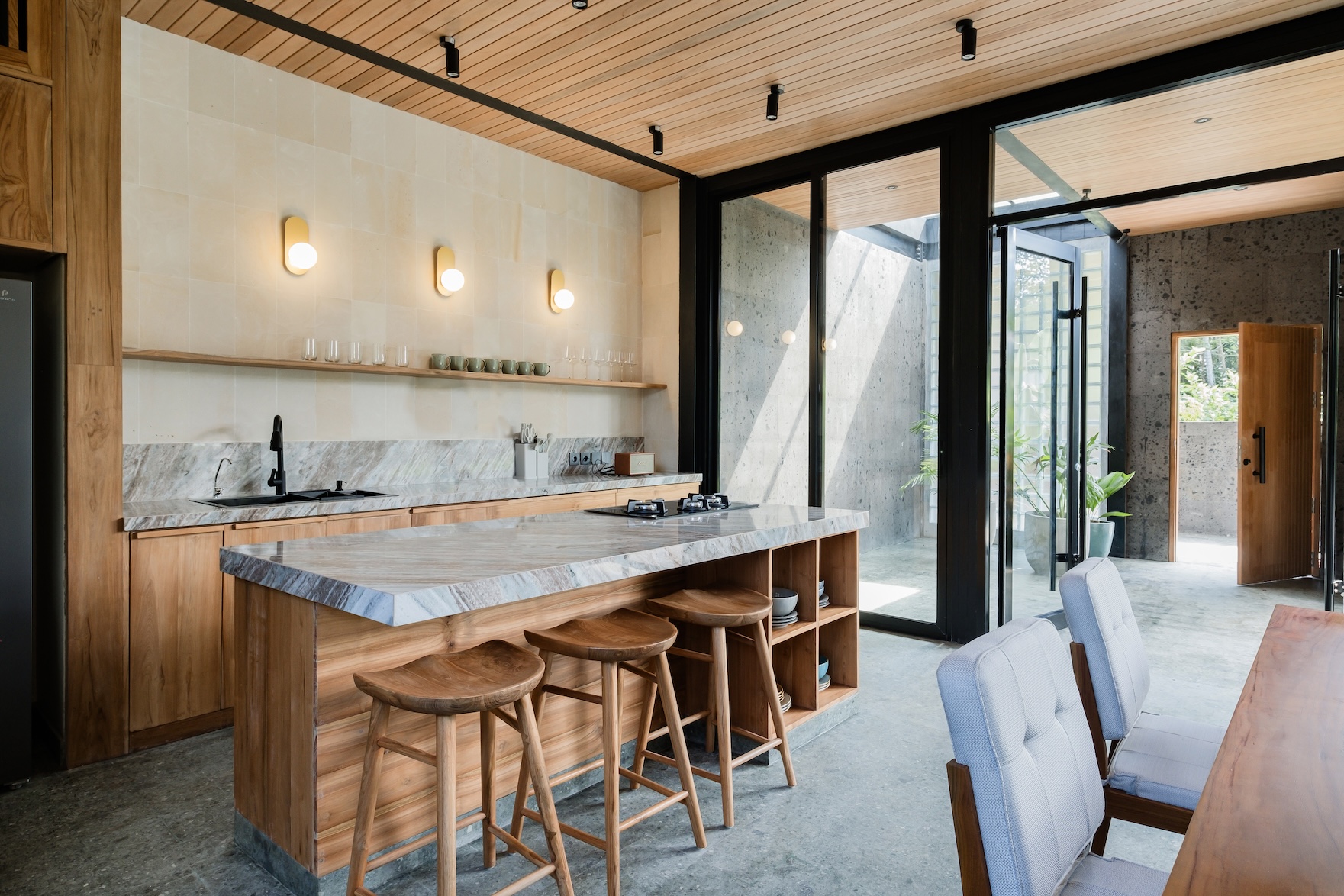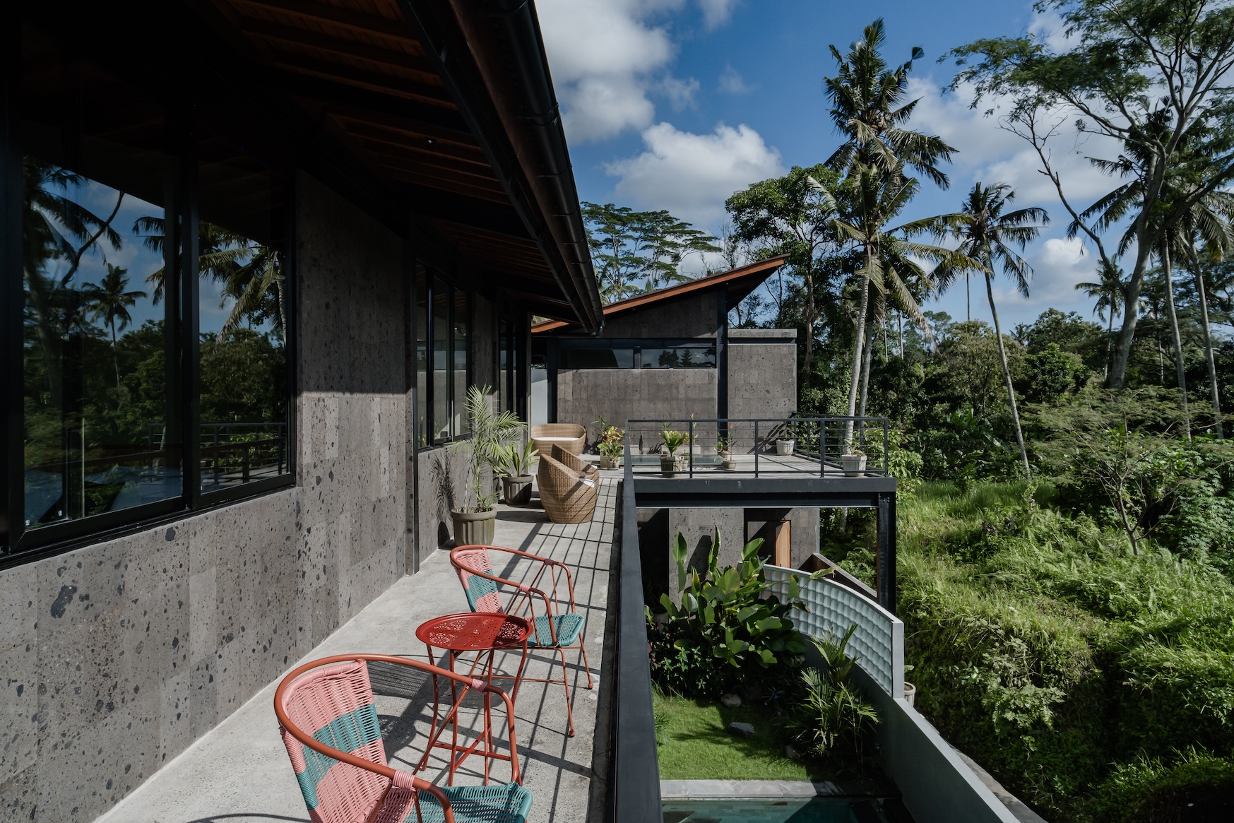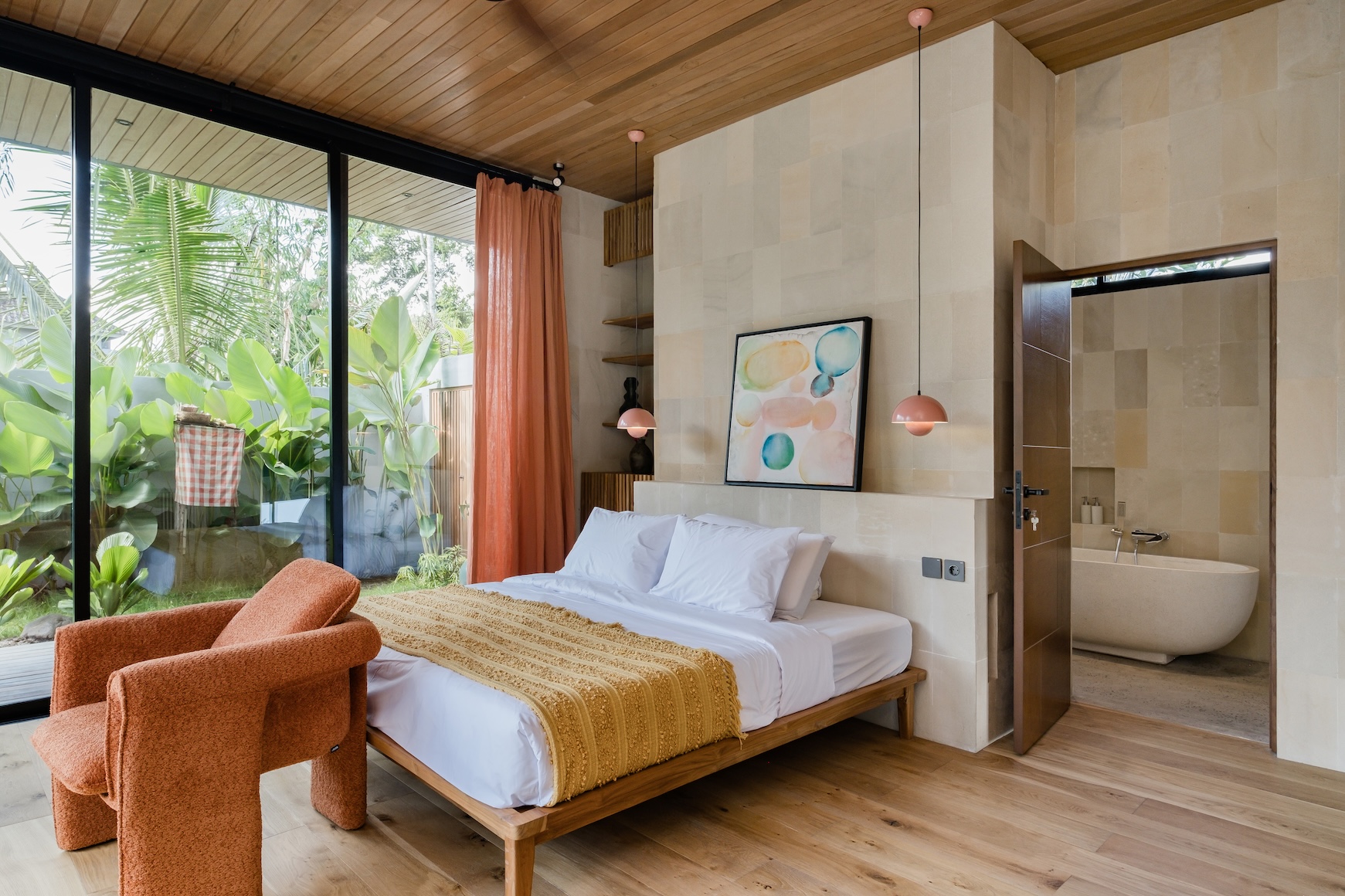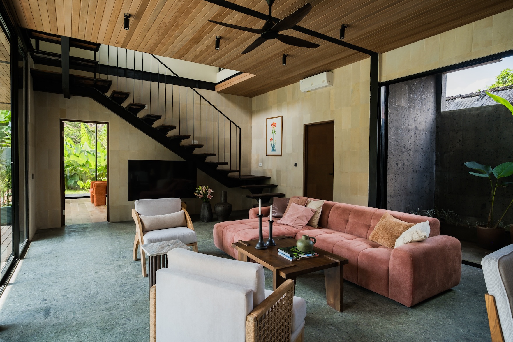 Designed with a strong focus on space, comfort, and visual impact, the villa features varying ceiling heights, natural stone tiles, premium wood parquet flooring, marble tabletops, and high quality custom furniture. Large openings frame the surrounding greenery, while the elevated position ensures the jungle views will never be blocked.