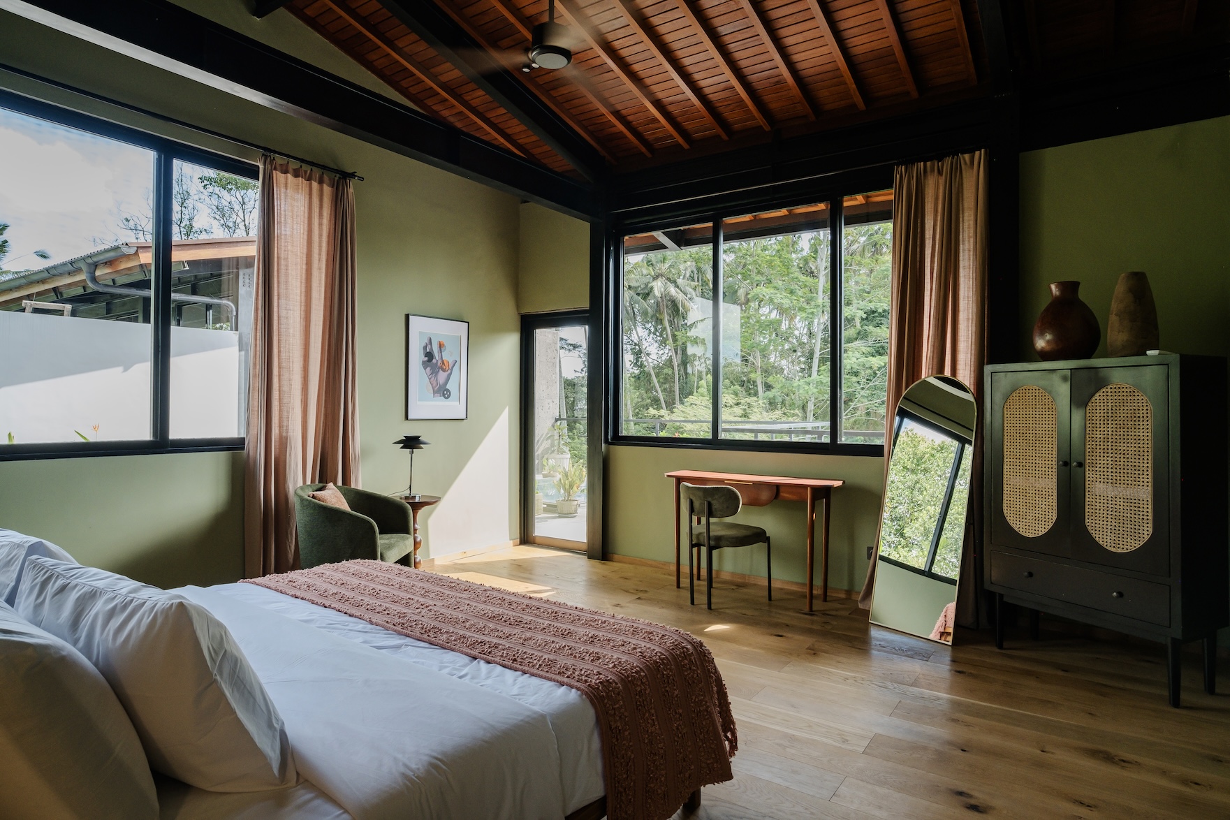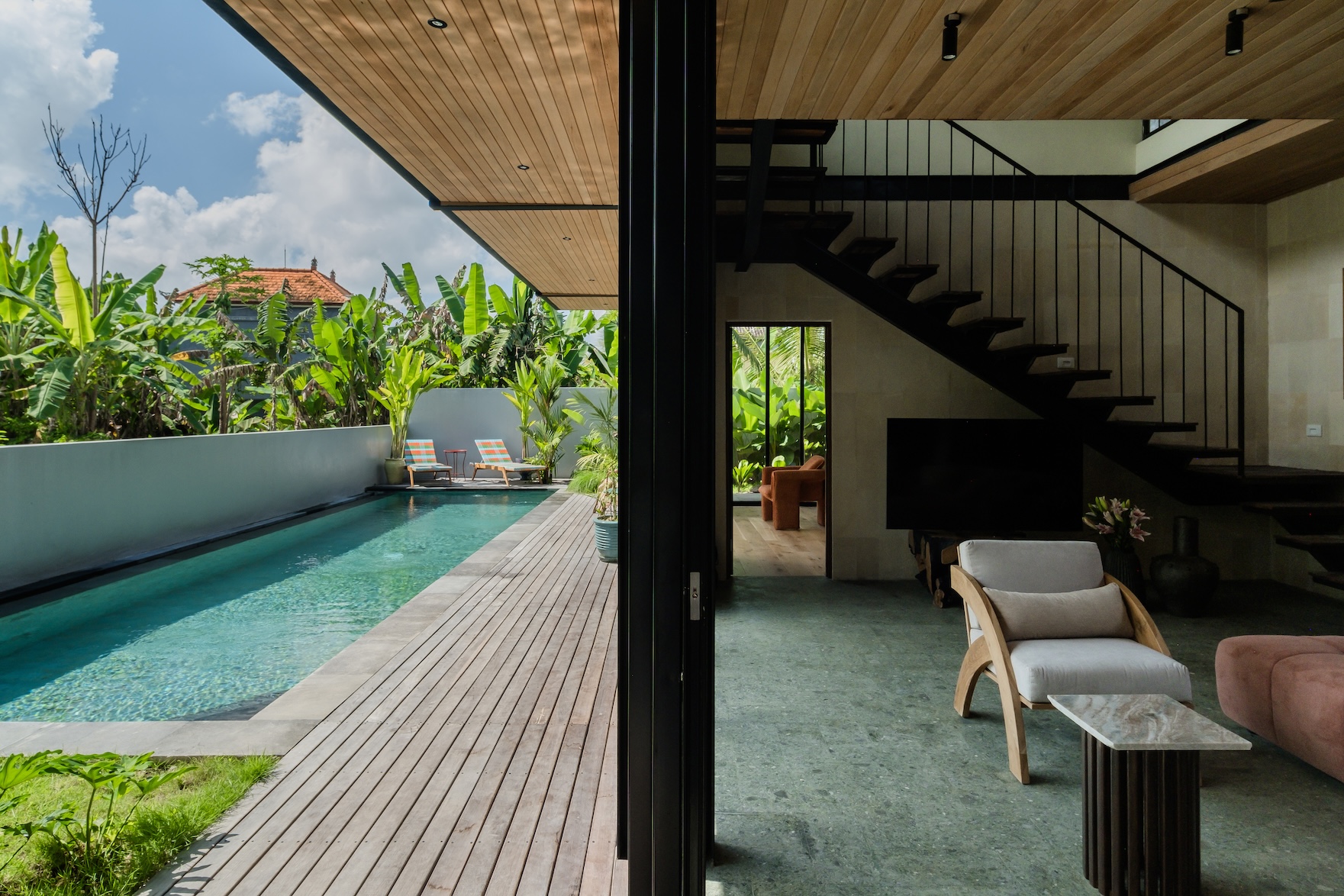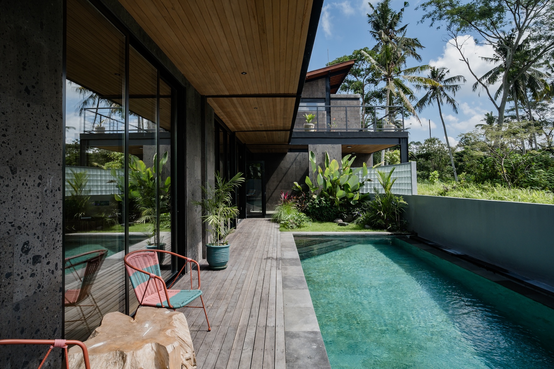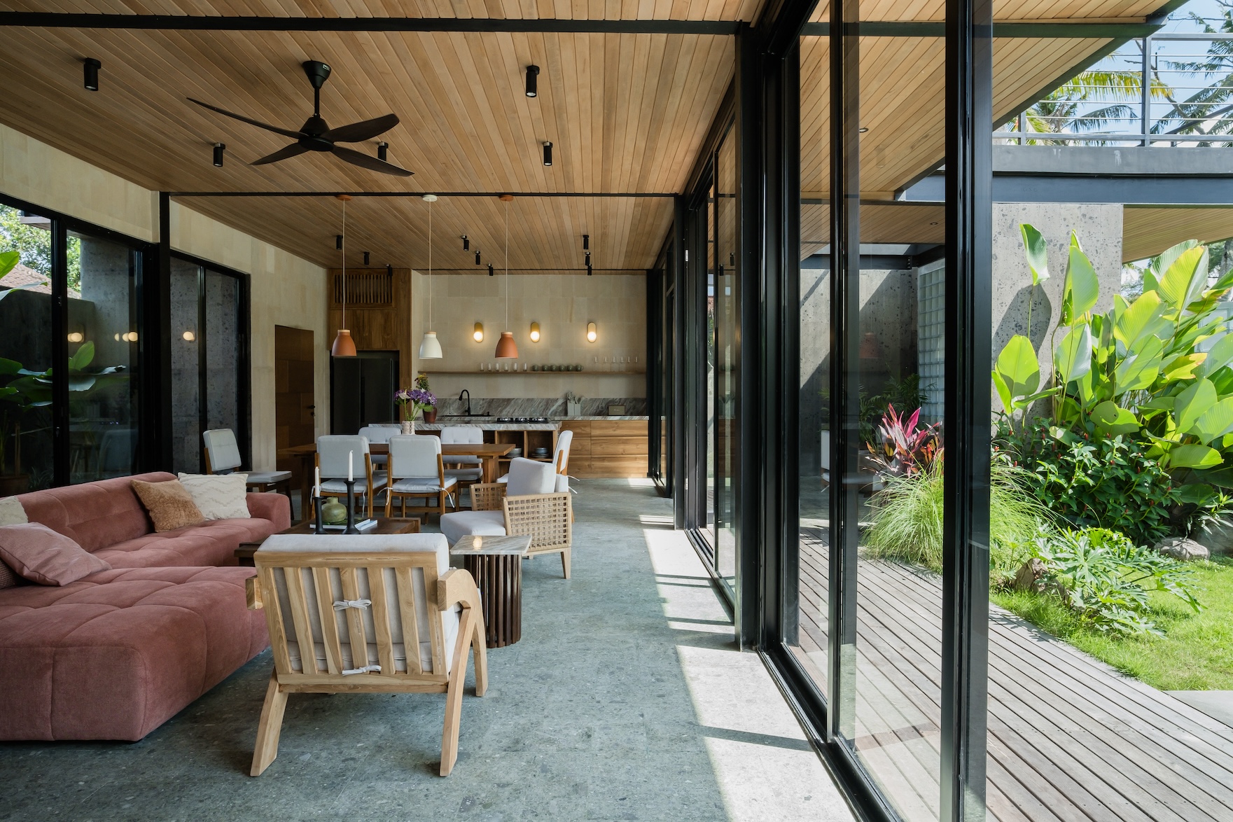 Designed with a strong focus on space, comfort, and visual impact, the villa features varying ceiling heights, natural stone tiles, premium wood parquet flooring, marble tabletops, and high quality custom furniture. Large openings frame the surrounding greenery, while the elevated position ensures the jungle views will never be blocked.