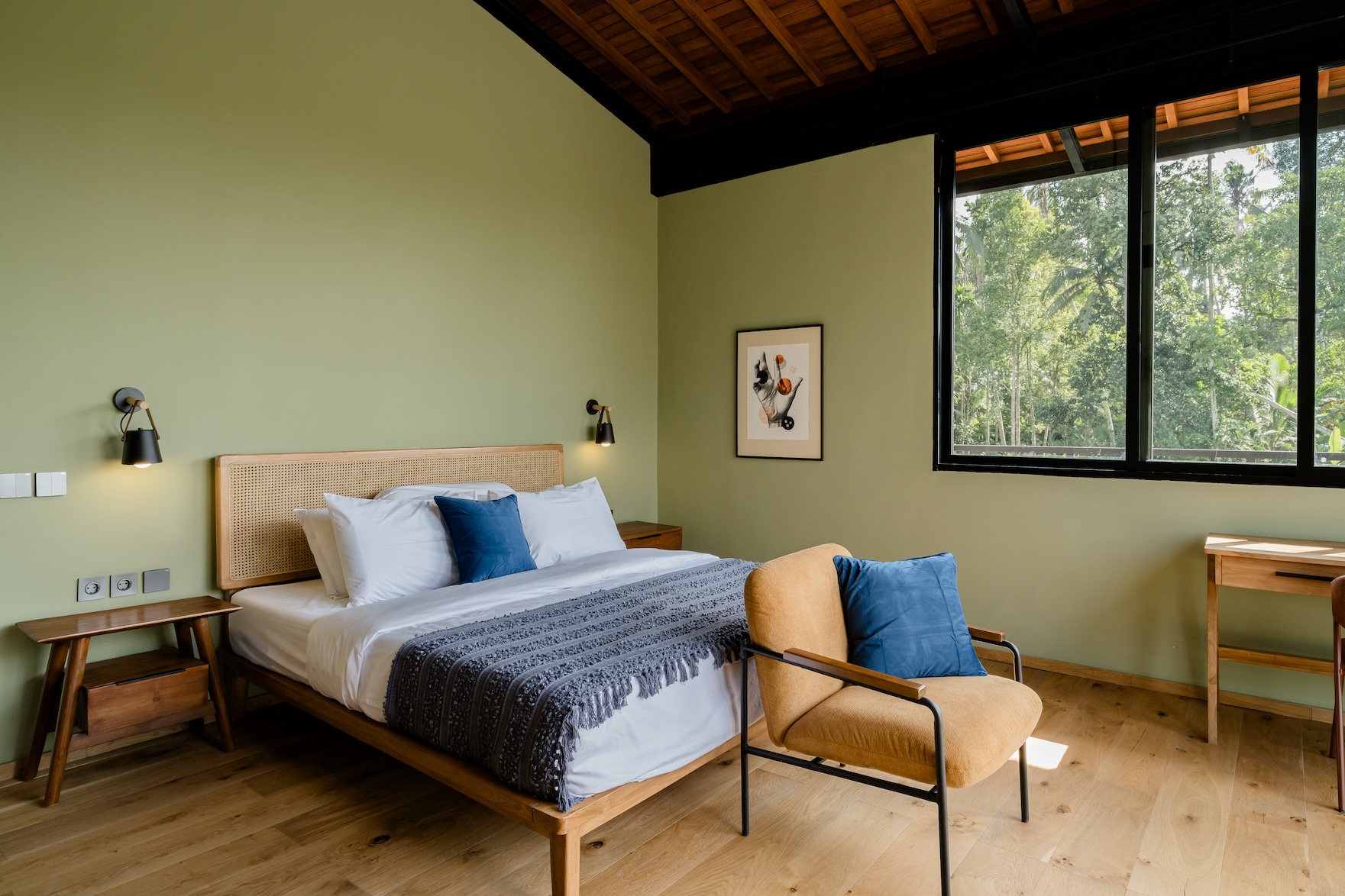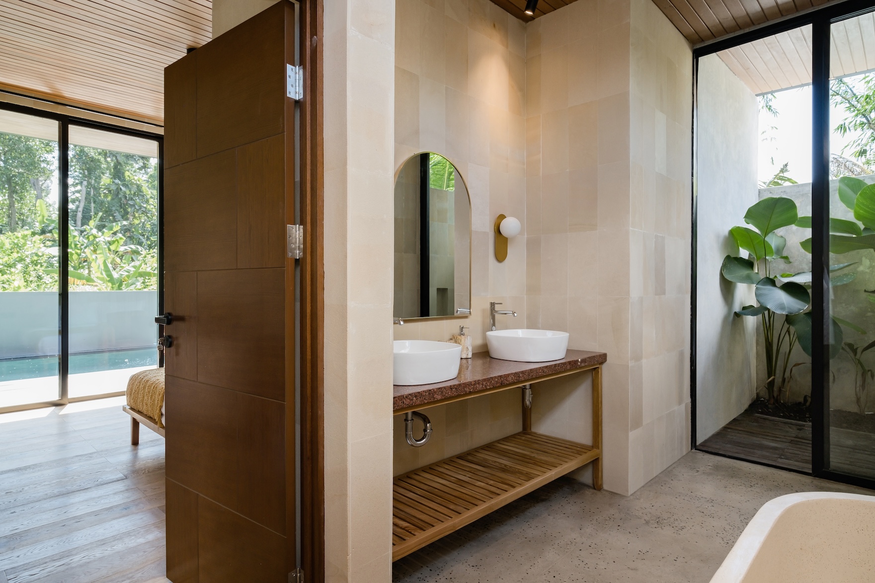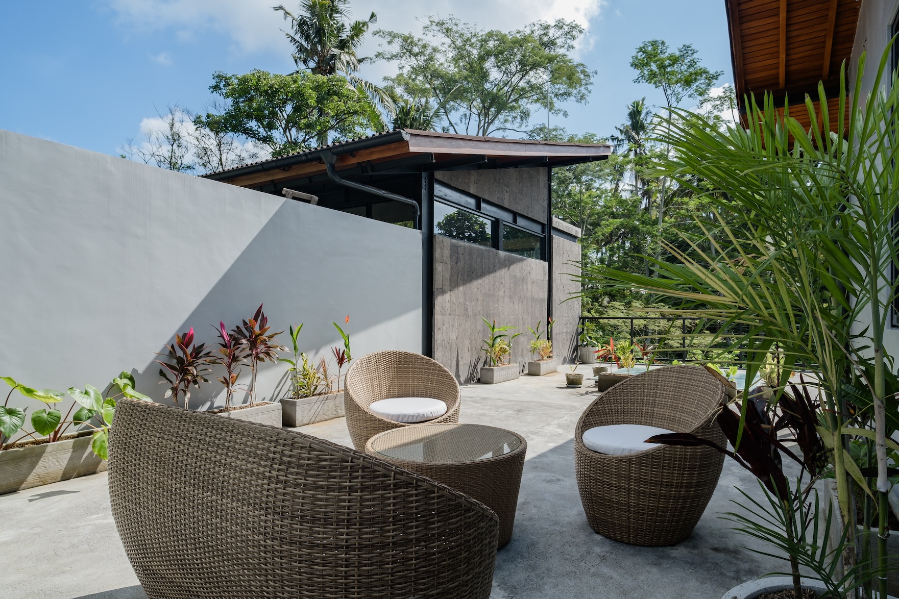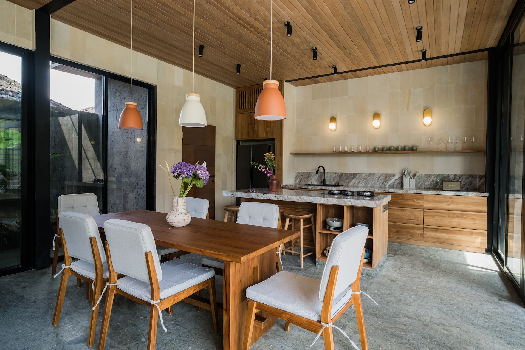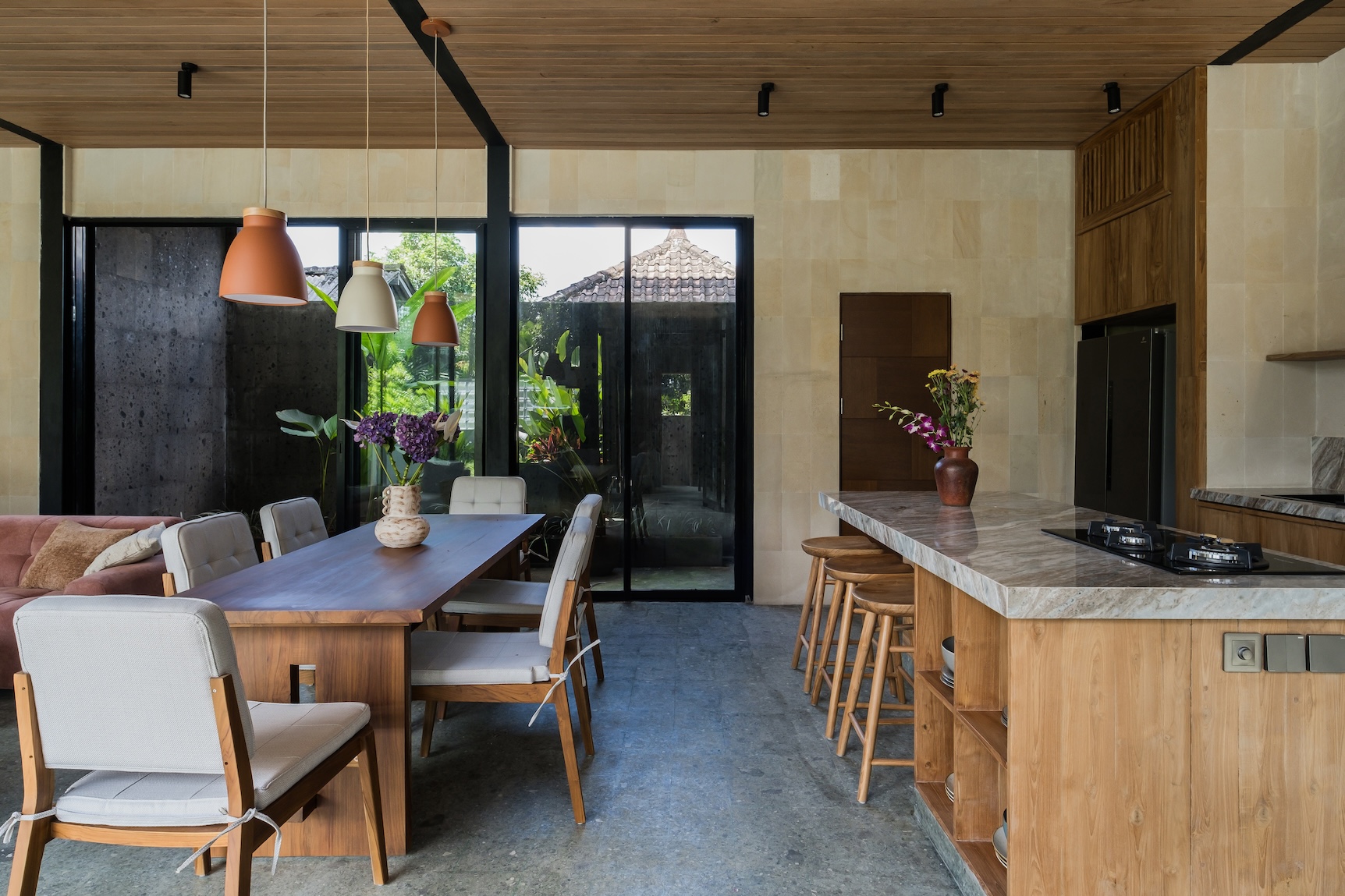 Designed with a strong focus on space, comfort, and visual impact, the villa features varying ceiling heights, natural stone tiles, premium wood parquet flooring, marble tabletops, and high quality custom furniture. Large openings frame the surrounding greenery, while the elevated position ensures the jungle views will never be blocked.