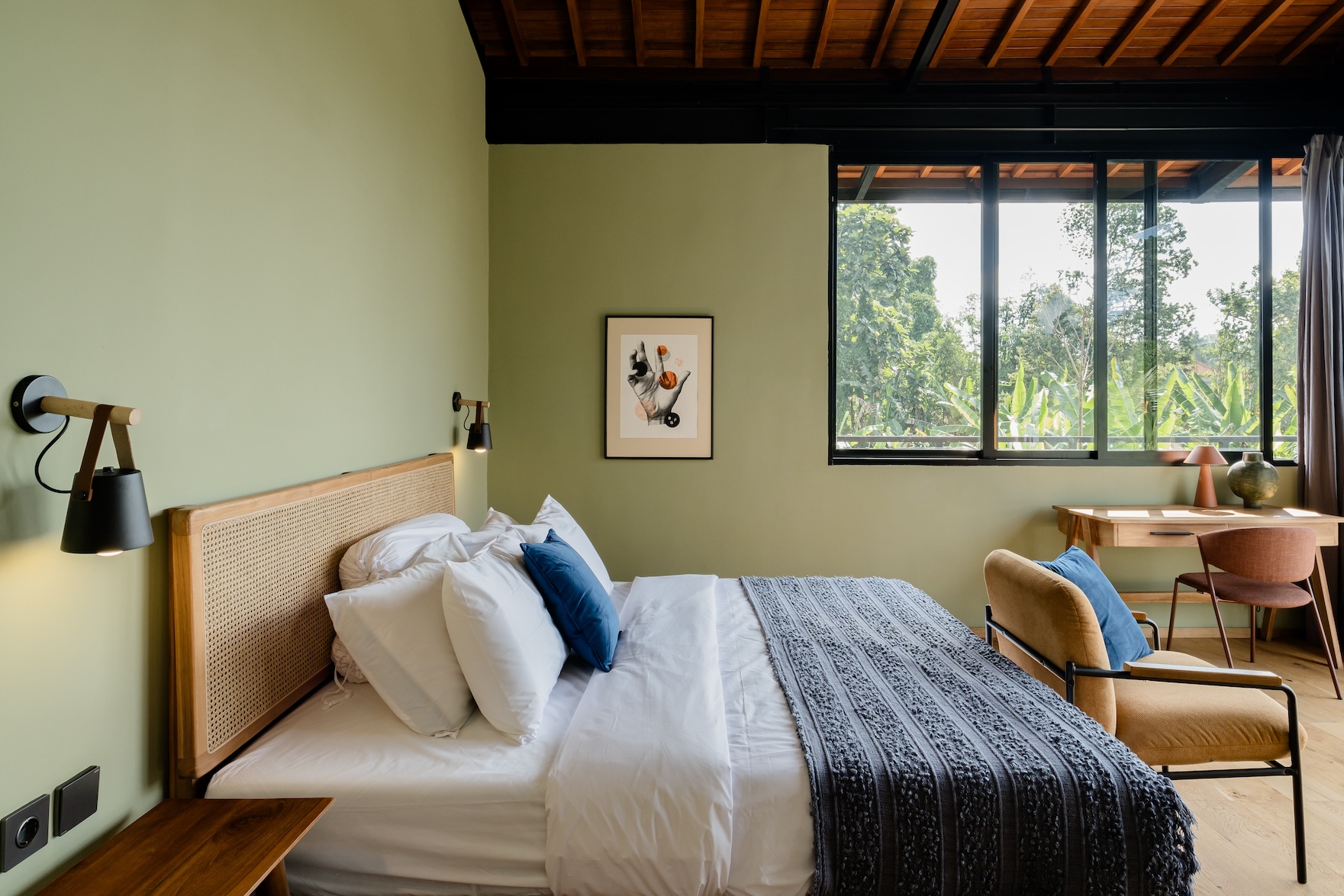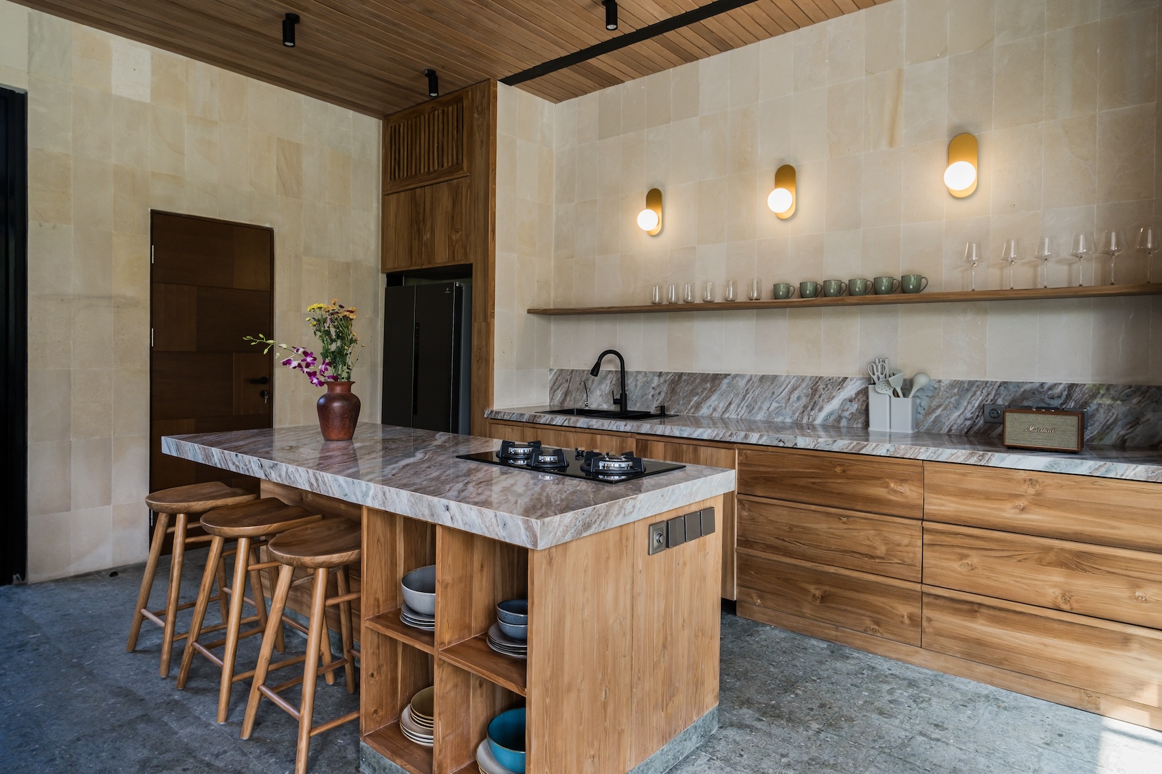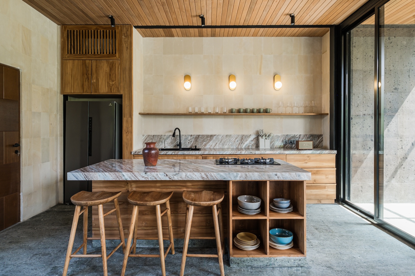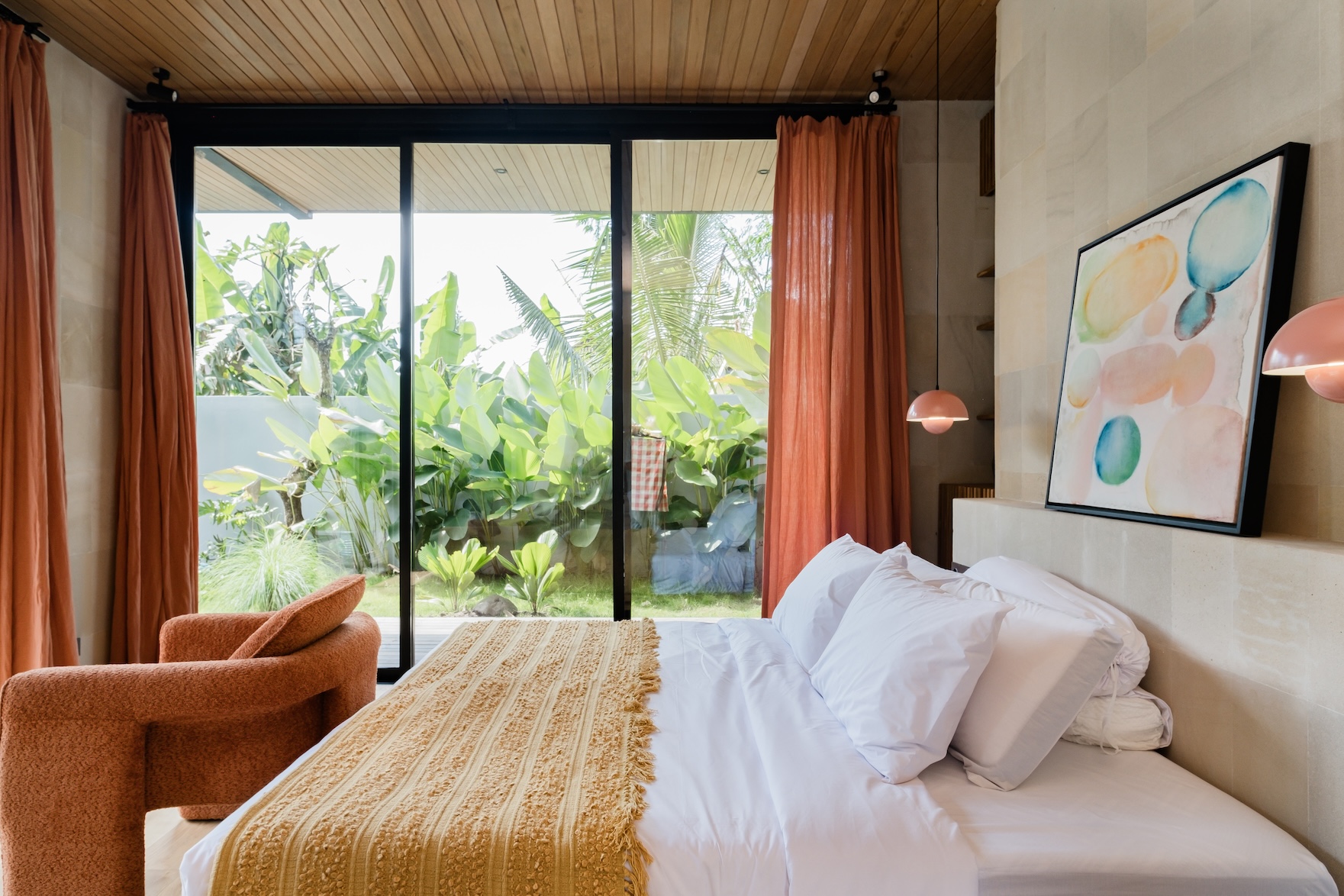 Designed with a strong focus on space, comfort, and visual impact, the villa features varying ceiling heights, natural stone tiles, premium wood parquet flooring, marble tabletops, and high quality custom furniture. Large openings frame the surrounding greenery, while the elevated position ensures the jungle views will never be blocked.