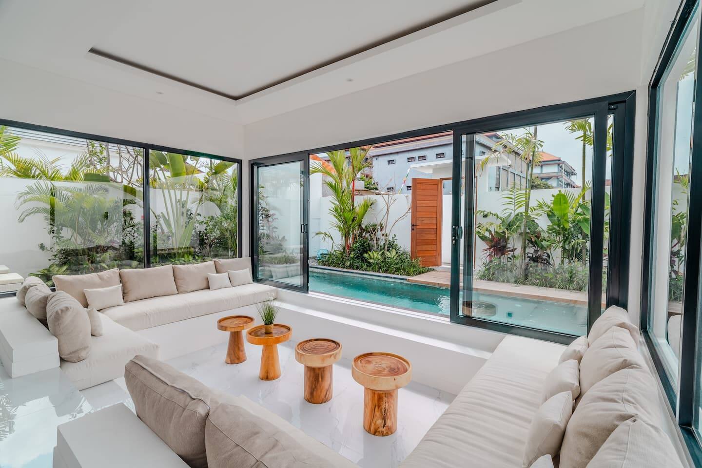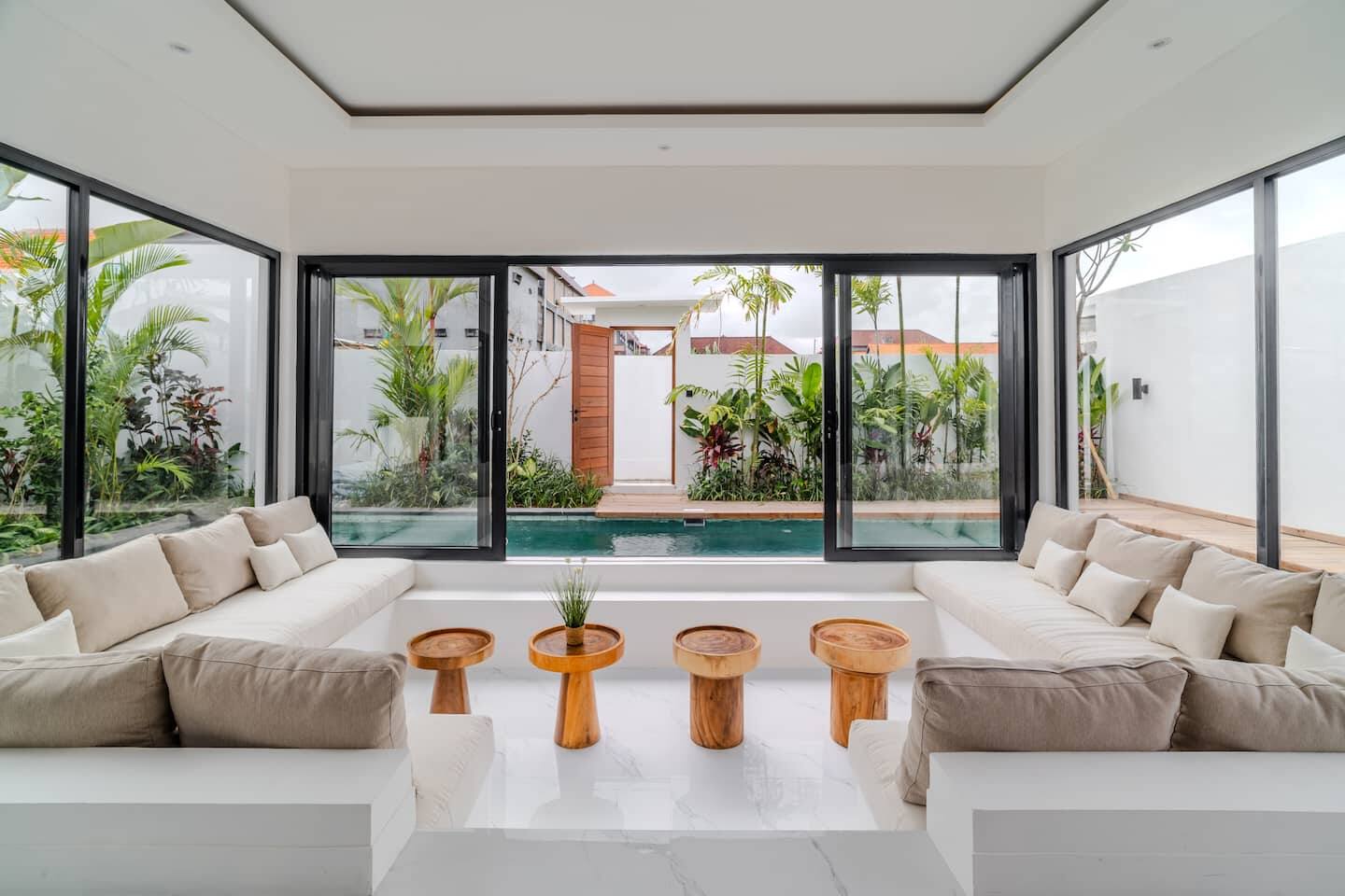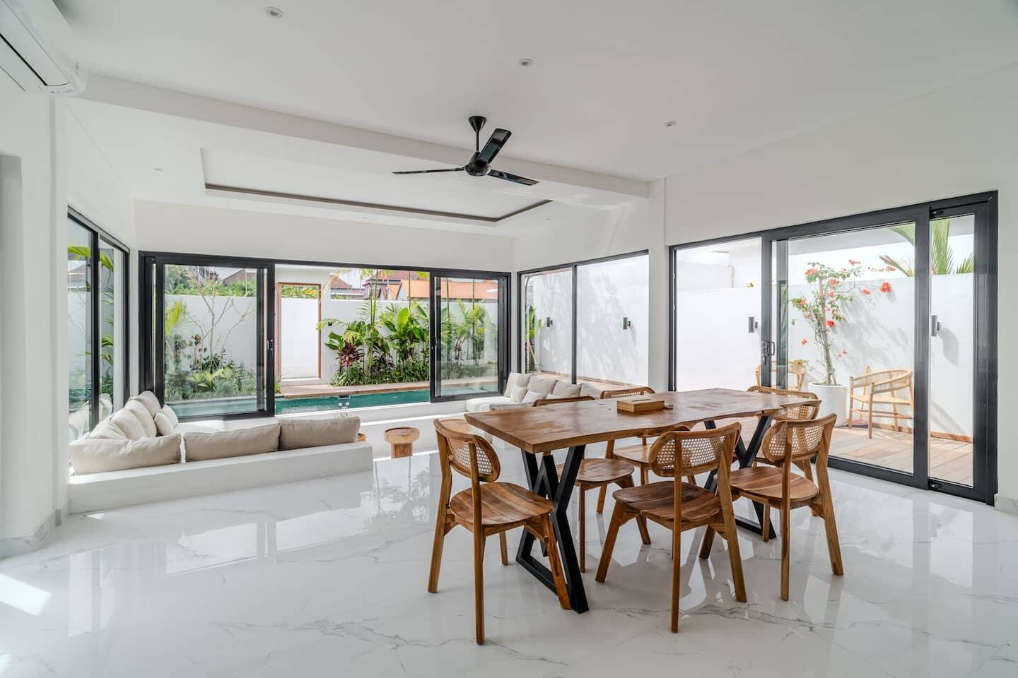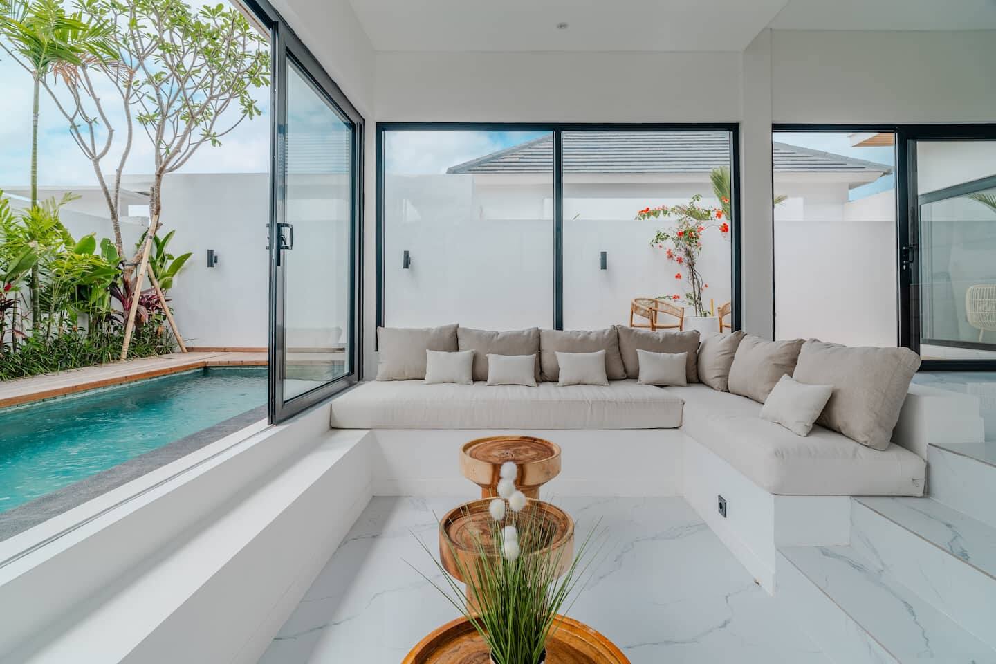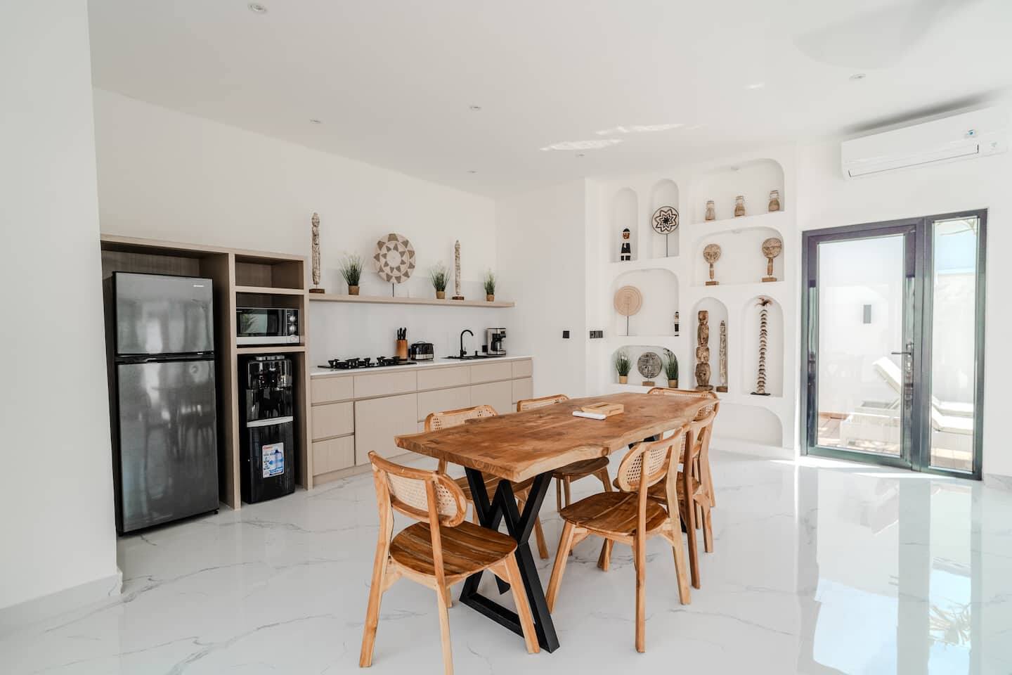 The villa features two well-proportioned bedrooms, each with its own bathroom, and a clean, minimalist interior finished in warm tropical tones. Natural light, soft textures, and functional layouts make the home ideal for both full-time living and long-term rental use.