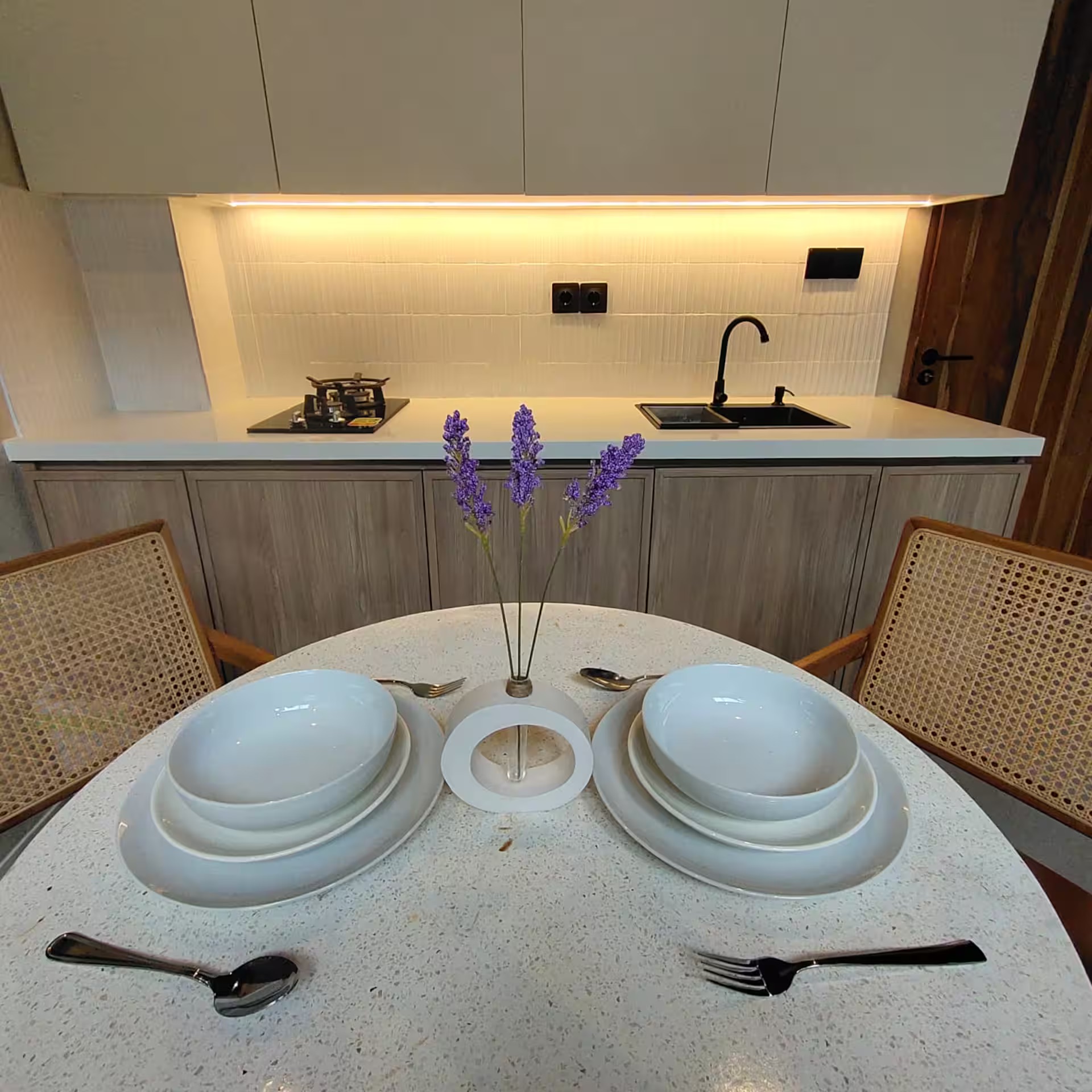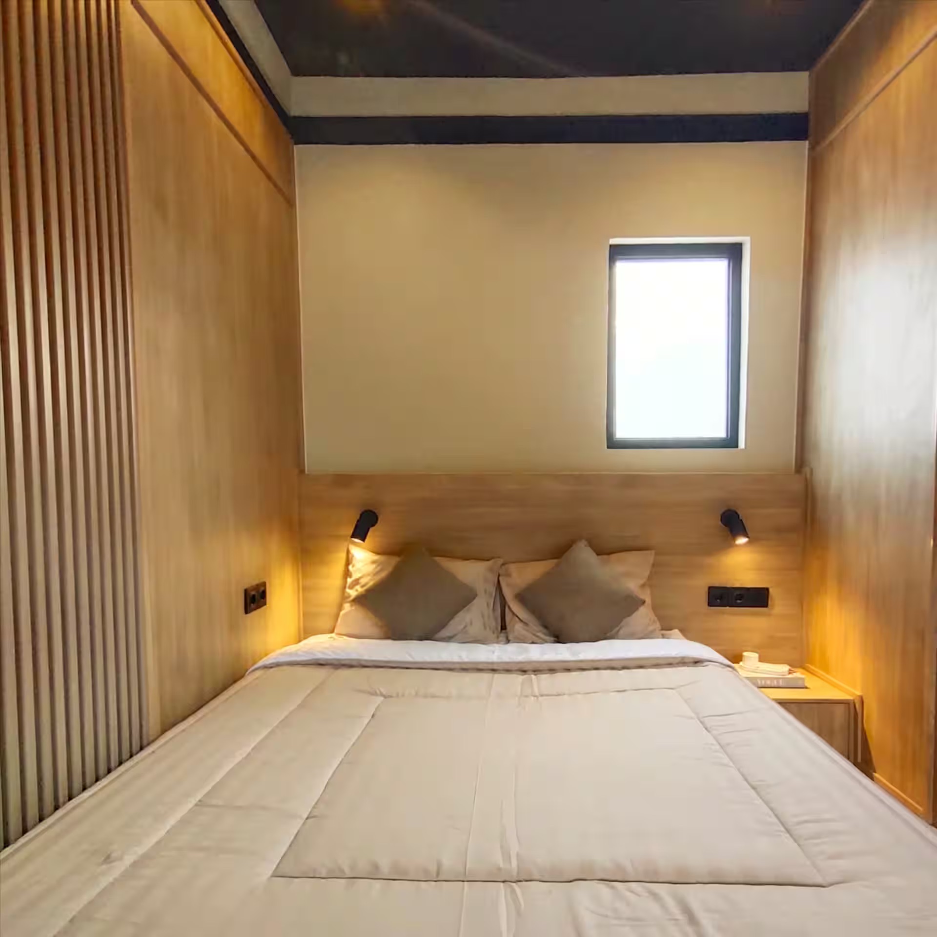 Set on 35 m² of land with a 32 m² building, the villa features a clever 2-level loft layout that maximizes space while maintaining comfort and functionality. The upper level hosts the bedroom, while the ground floor includes a fully enclosed living, dining, and kitchen area.