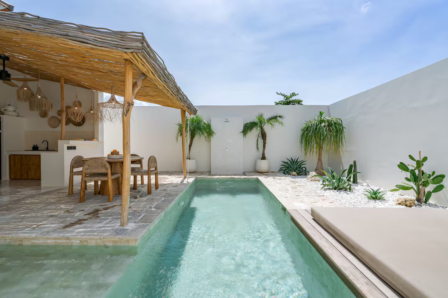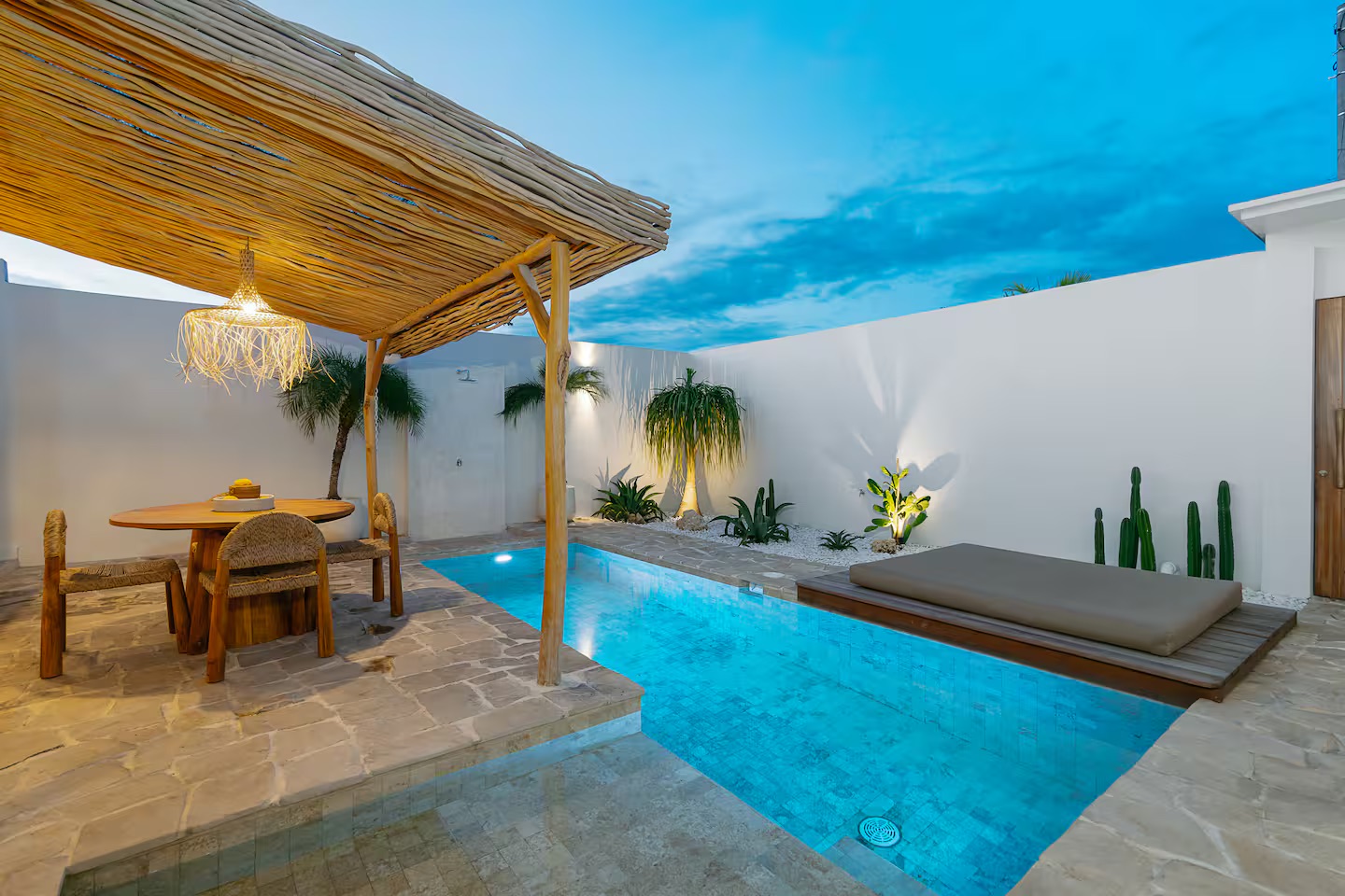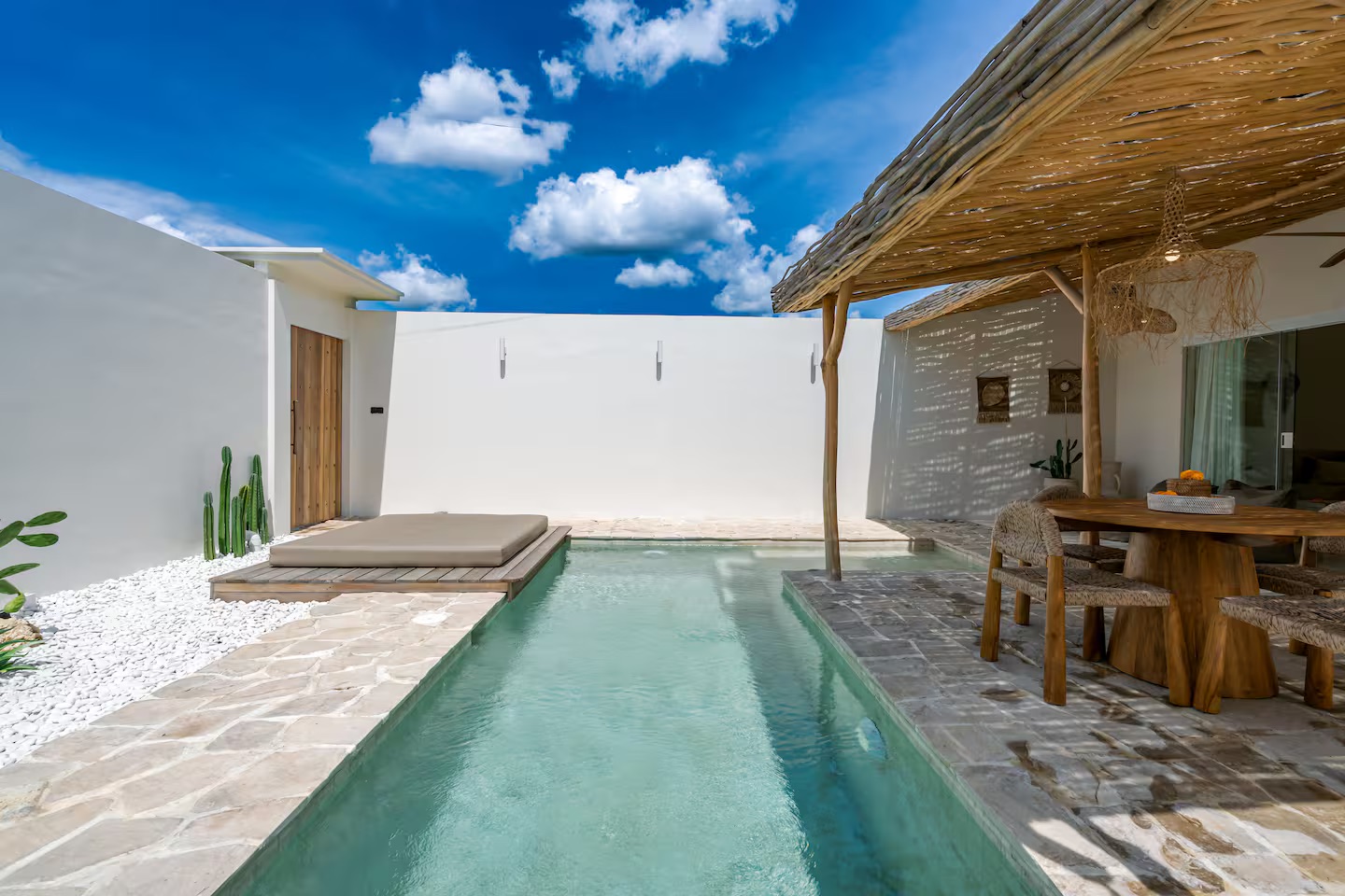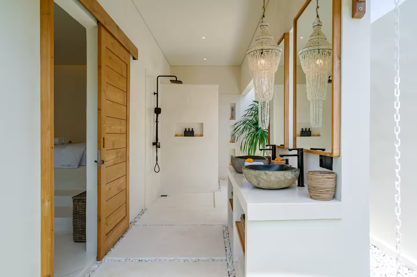 This beautifully designed 1-bedroom villa sits just 300 meters from Nyanyi Beach, offering the perfect balance between tropical tranquility and modern comfort. Inspired by traditional Mediterranean design, the villa features a cozy, stylish atmosphere with natural textures and soft tones throughout.