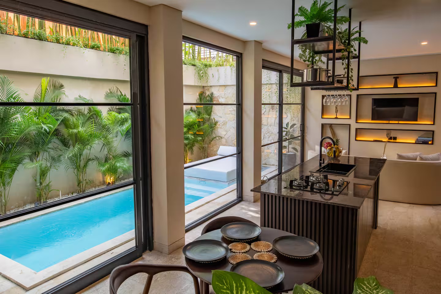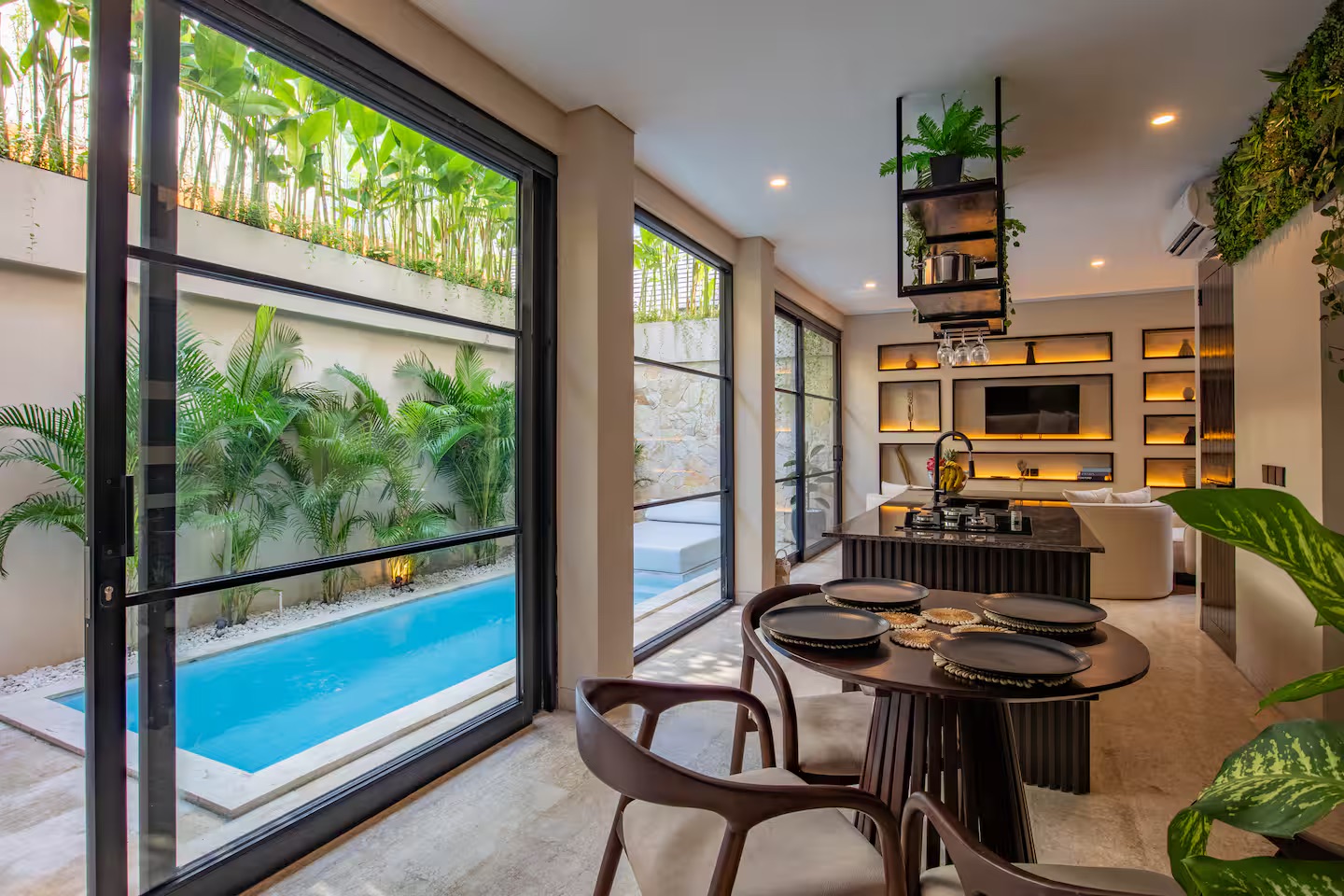 Built on 90 m² of land with a 90 m² build, the villa features two ensuite bedrooms, a fully enclosed living and dining area, and a modern open kitchen with stylish finishes. Floor-to-ceiling glass brings in abundant natural light, creating an open, luxurious atmosphere while maintaining privacy.