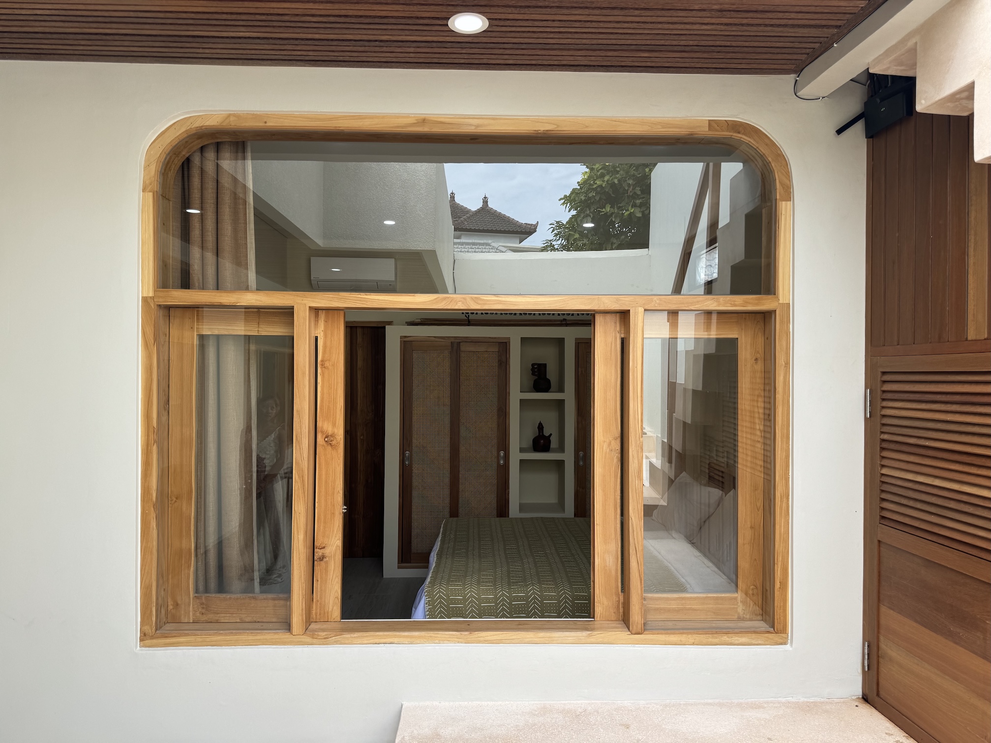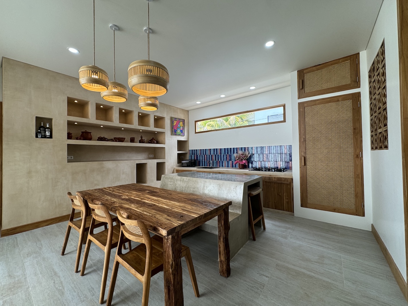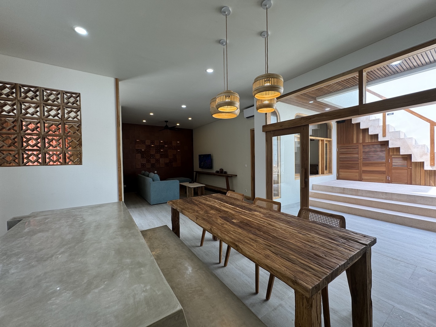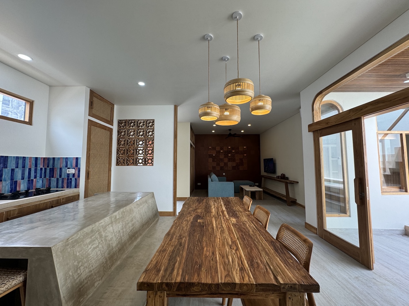 The property features a fully enclosed kitchen, living, and dining area, creating a comfortable indoor environment ideal for year-round living. Floor-to-ceiling openings connect the interior to a private swimming pool, providing a relaxed tropical atmosphere while maintaining privacy.