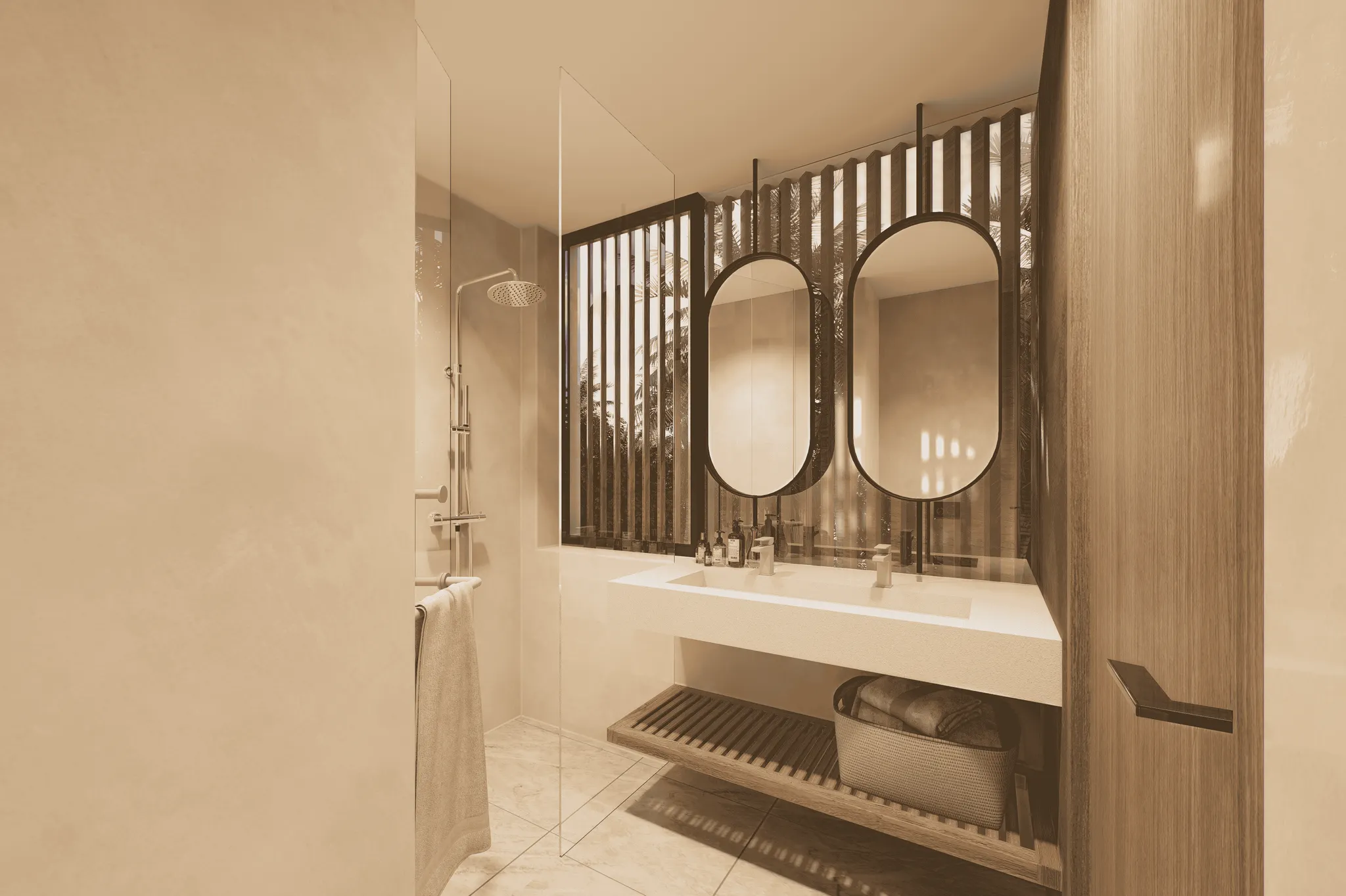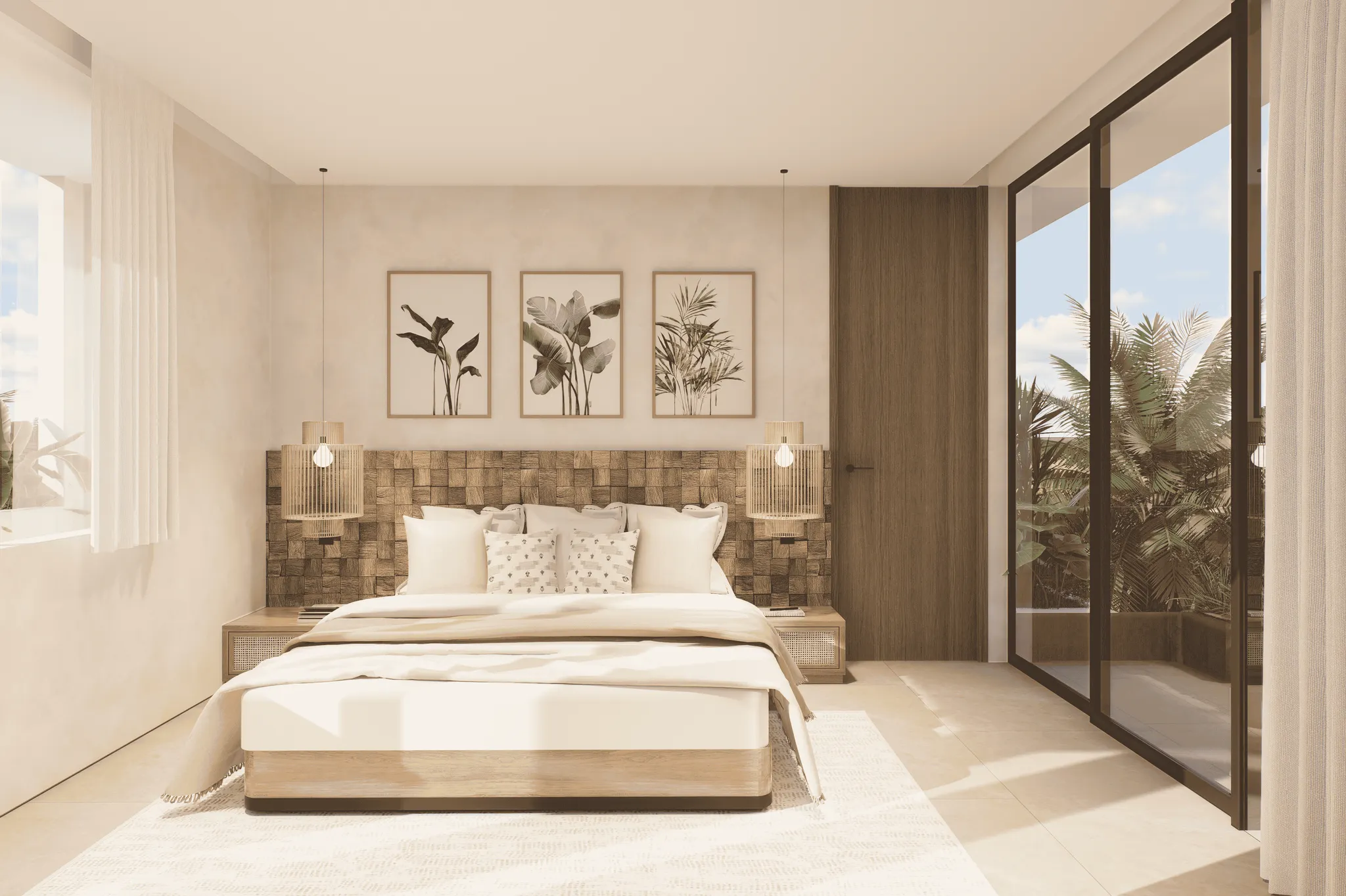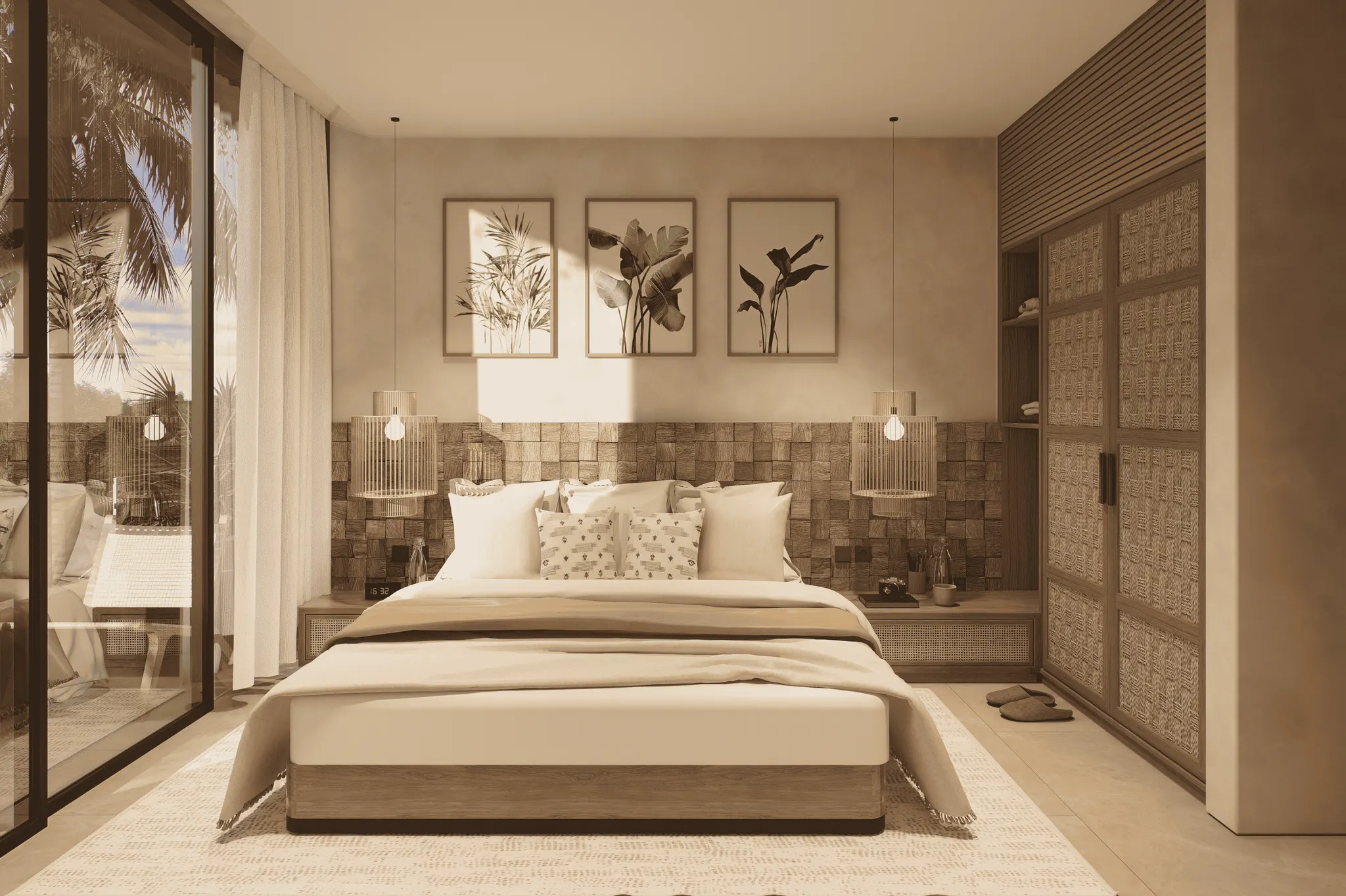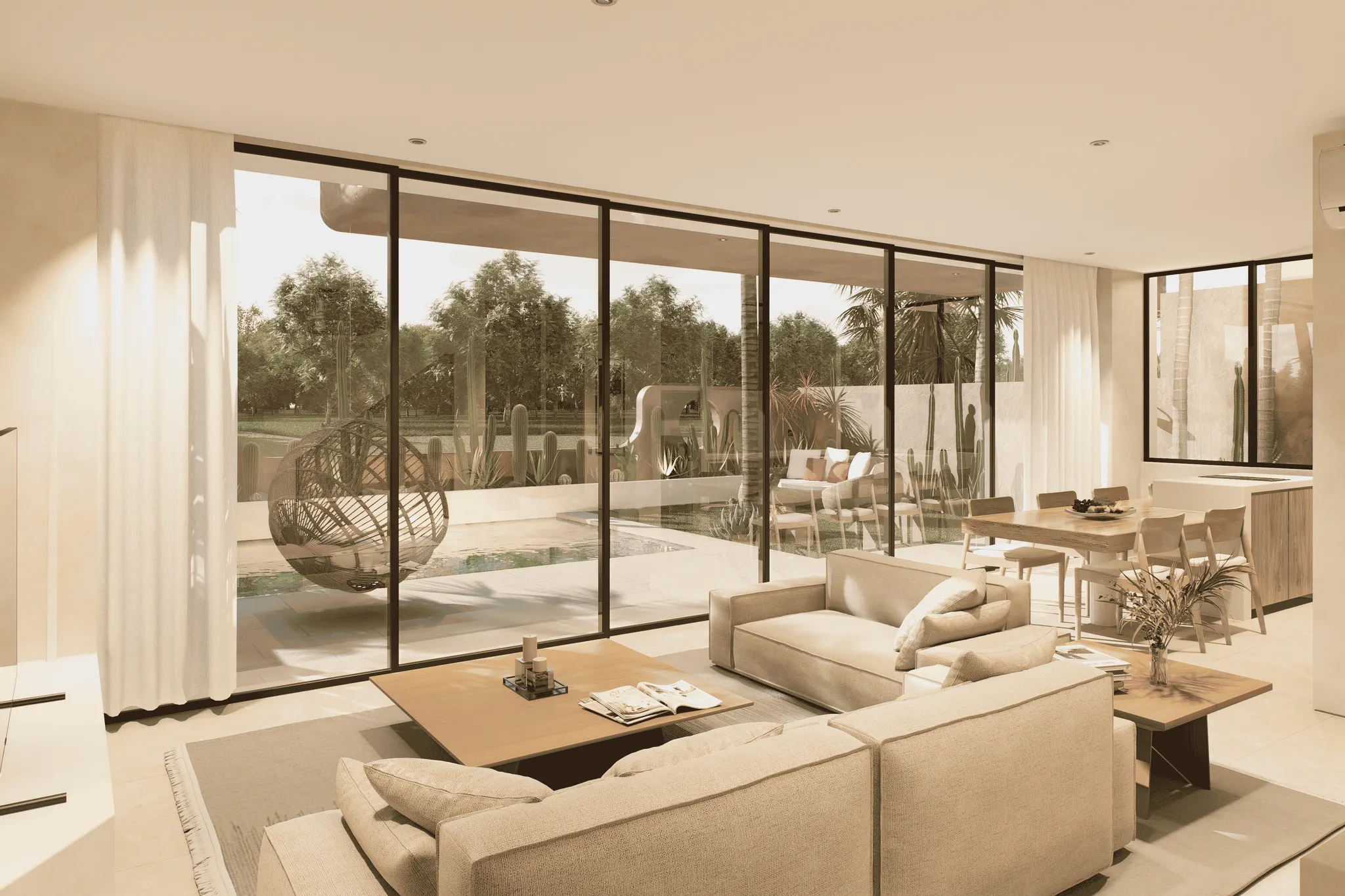 Located just 300 meters from the shoreline, The Dune Collection offers a unique blend of desert inspired elegance and tropical tranquility. These three bedroom villas are designed with expansive floor to ceiling glass that fills every space with natural light, creating a seamless connection between the indoors and the surrounding landscape. Set within palm trees, sandy textures, and lush cactus gardens, each home feels like a private oasis crafted for peaceful living.