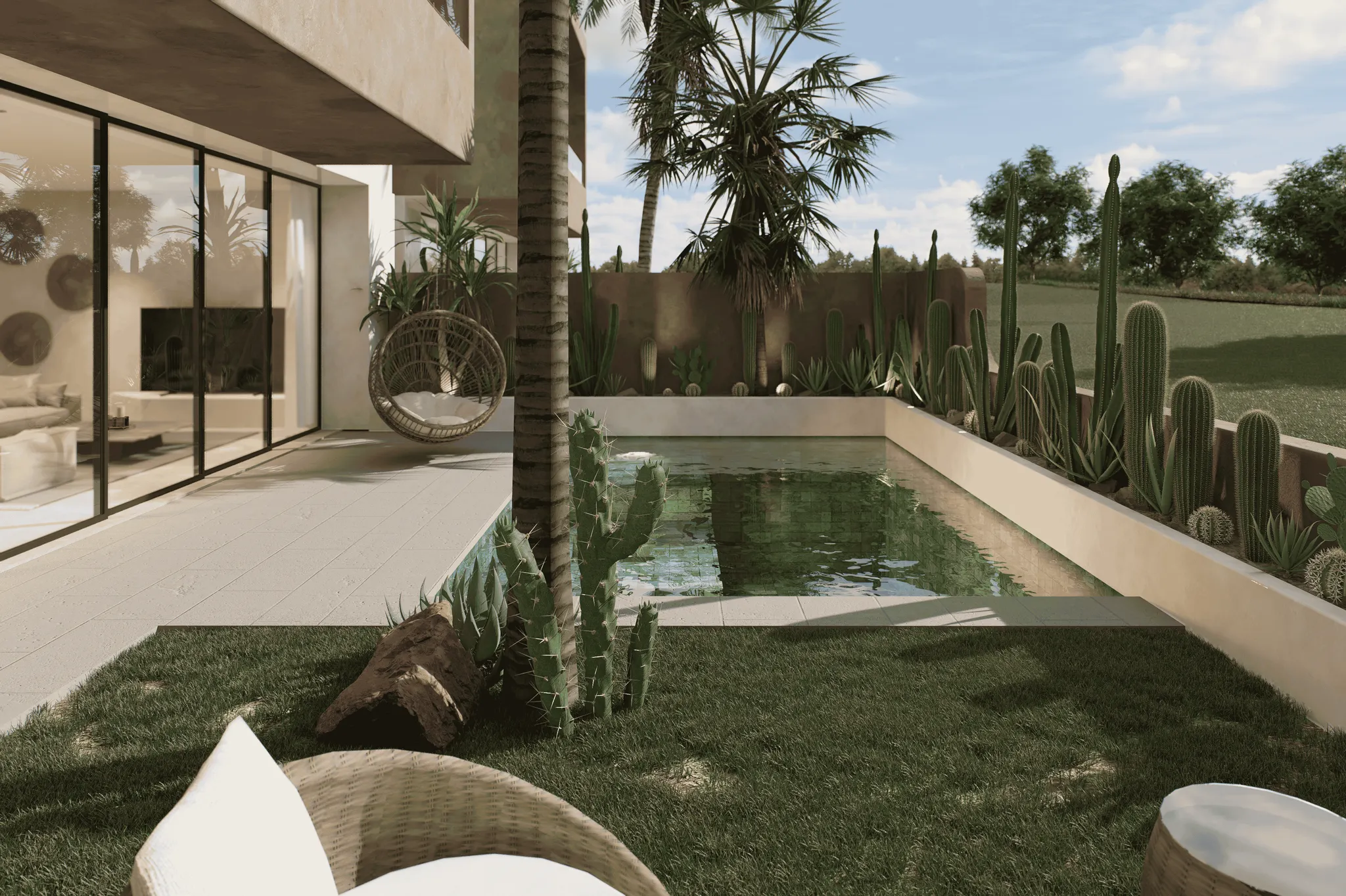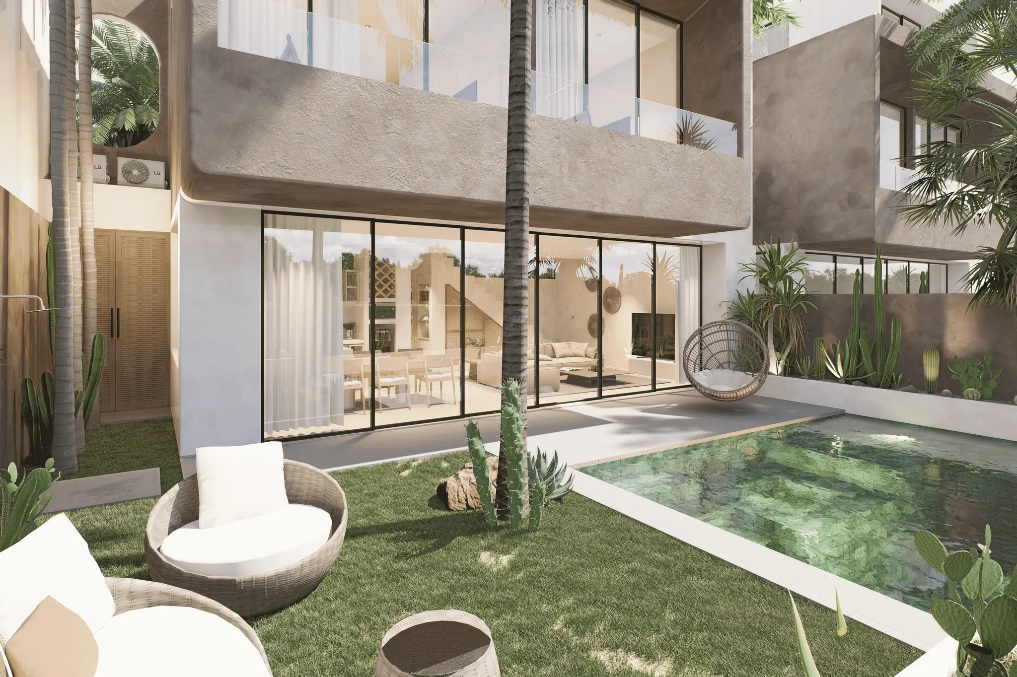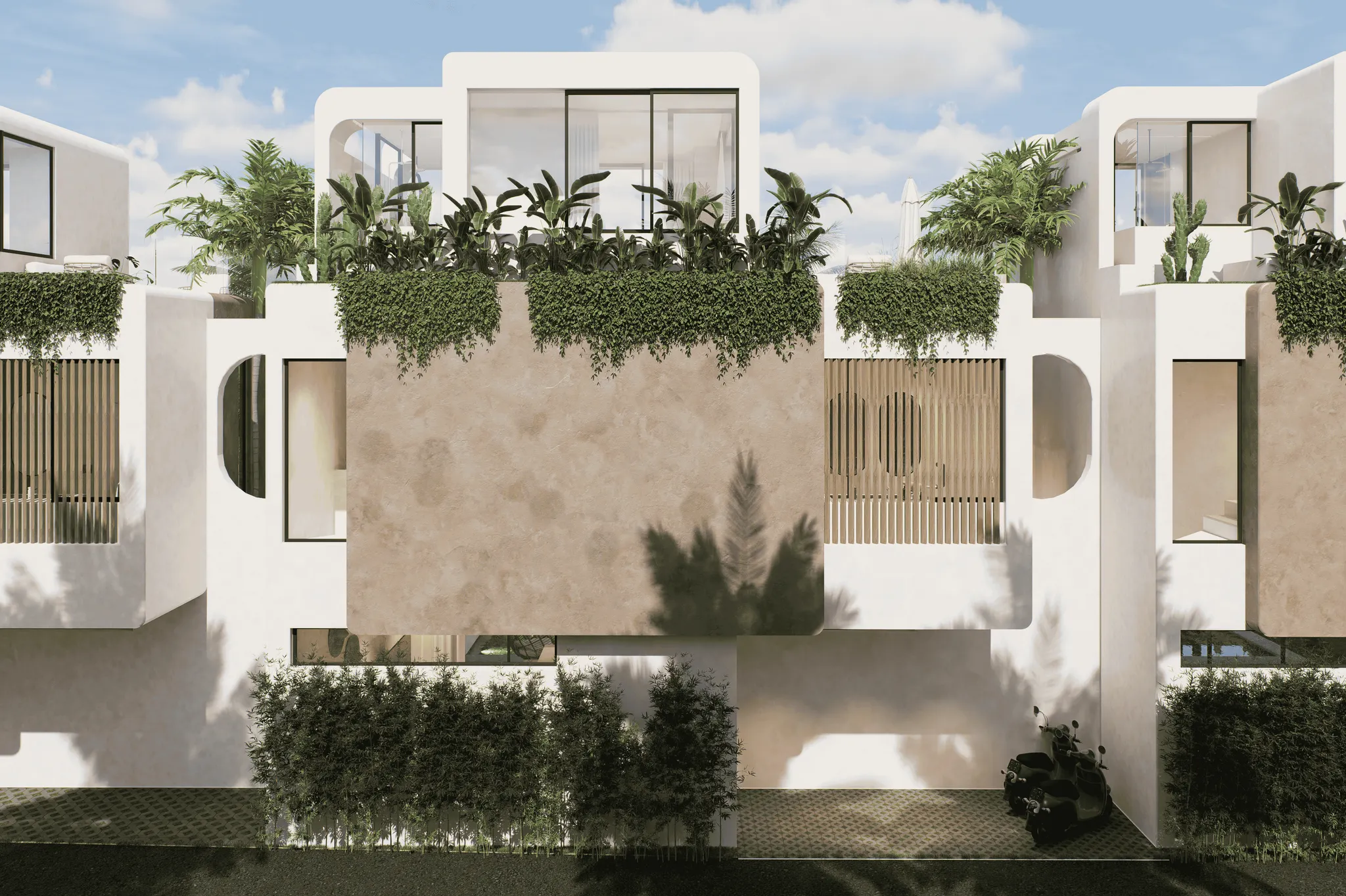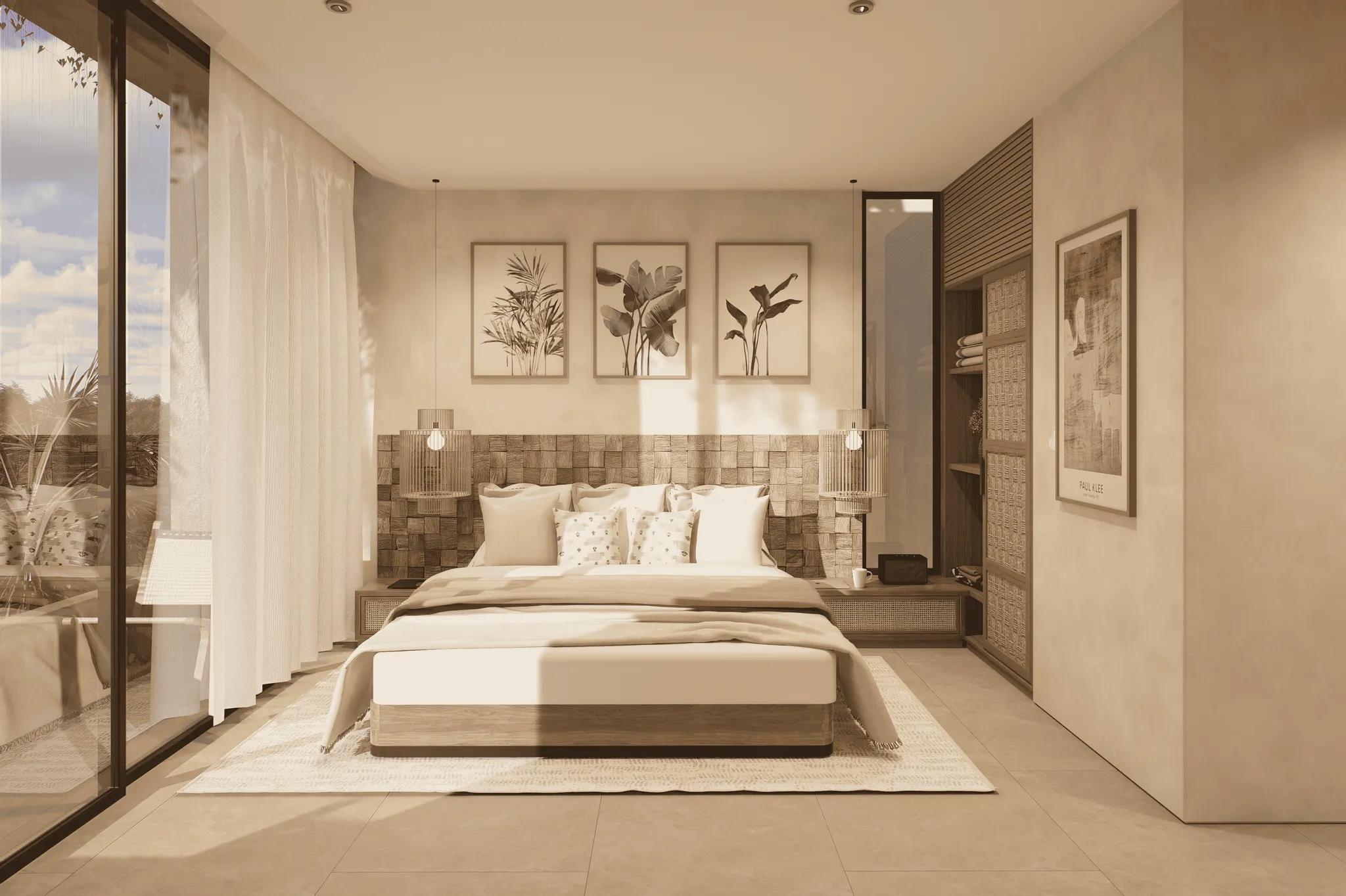 Set on land sizes ranging from 129 to 155 square meters with a generous 175 square meter building, each villa features three ensuite bedrooms, a fully furnished interior, and beautifully curated outdoor spaces. The design combines warm earthy tones, sculpted forms, and modern comfort, making the villas ideal for both lifestyle buyers and investors seeking a property with strong long term appeal.