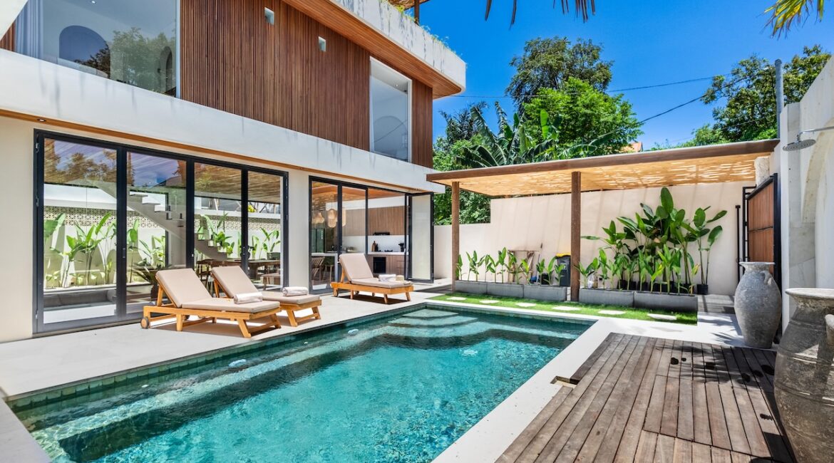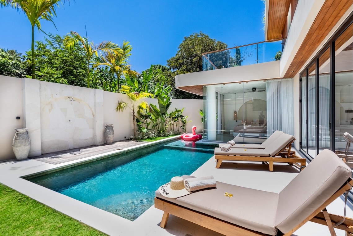 The outdoor area is designed for both relaxation and entertainment, featuring a private swimming pool, sun loungers, and a clean landscaped garden. A covered outdoor area adds additional functionality, perfect for lounging or dining.